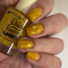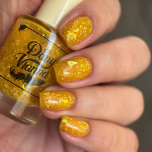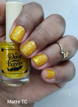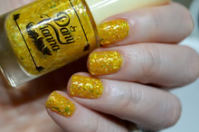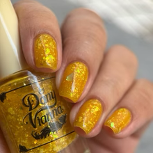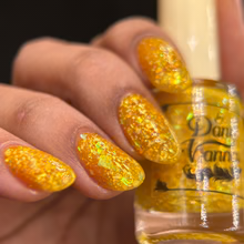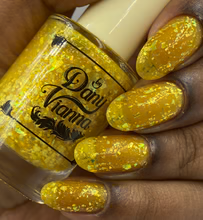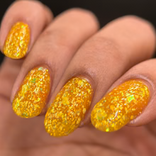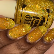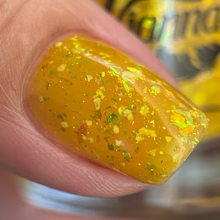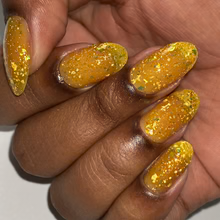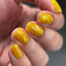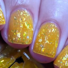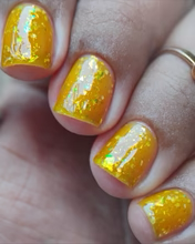 'Sun Opal' is a sheer yellow jelly nail polish containing gold reflective glitters, white irregular glitters, and gold to green iridescent flakes.