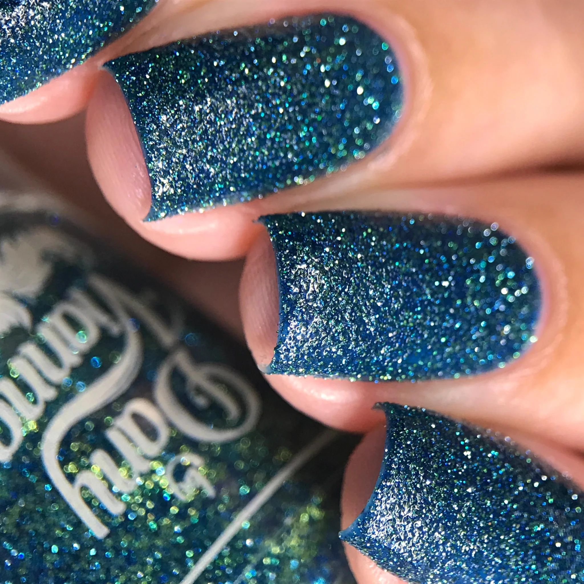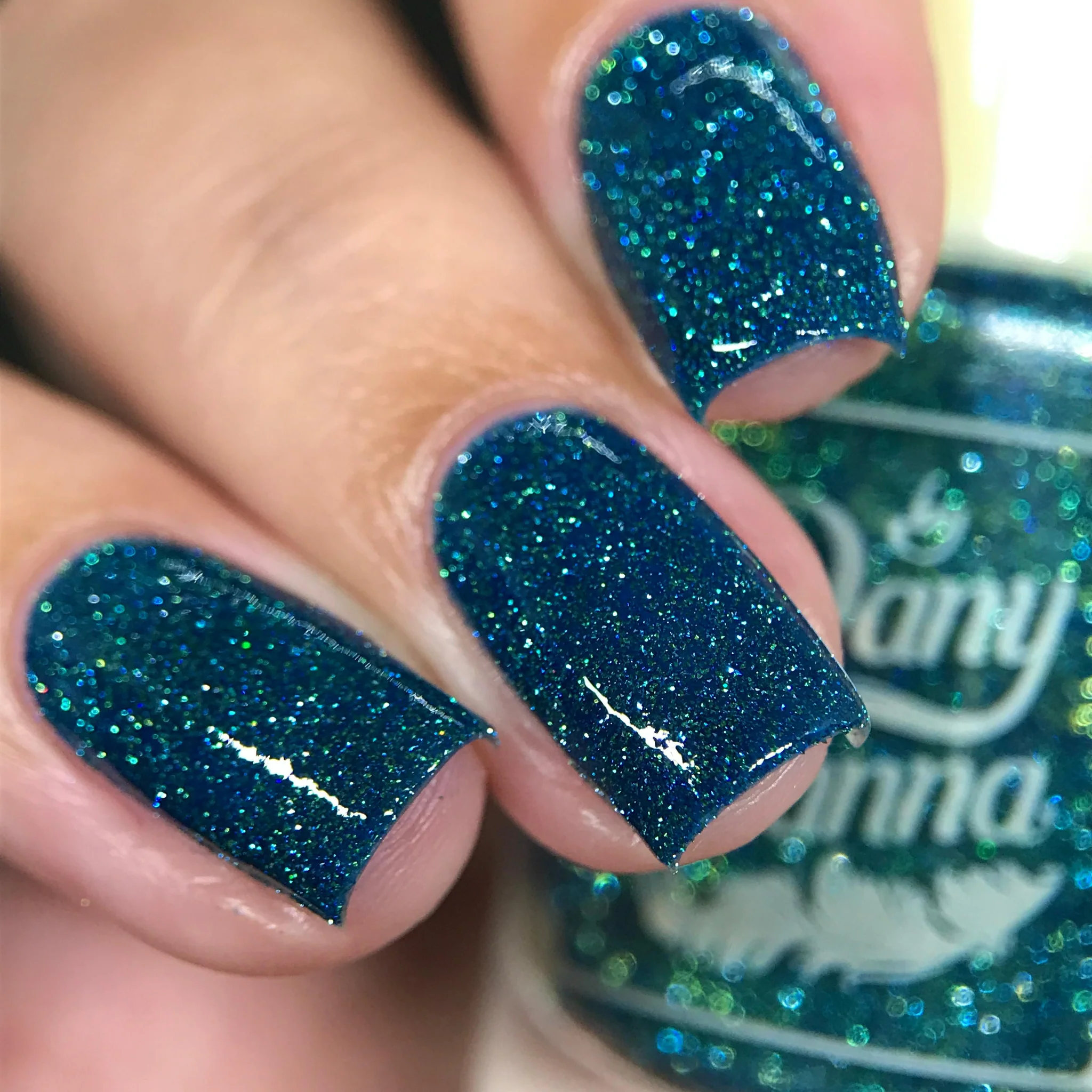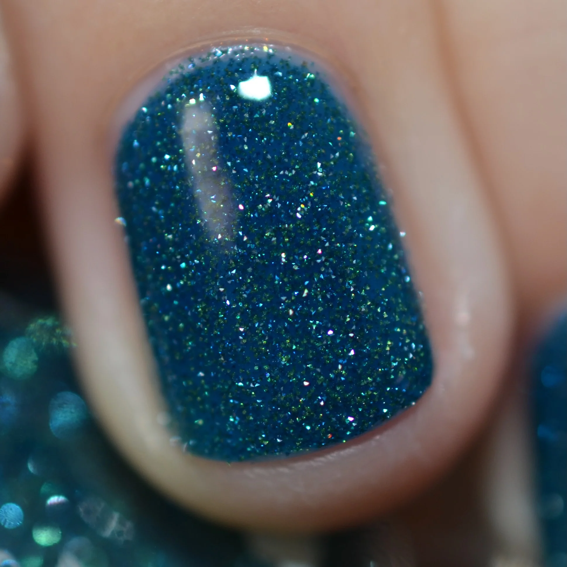 'As Long as You're Mine' is a blue jelly nail polish with green reflective glitters.