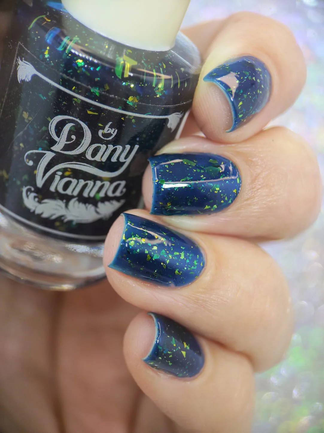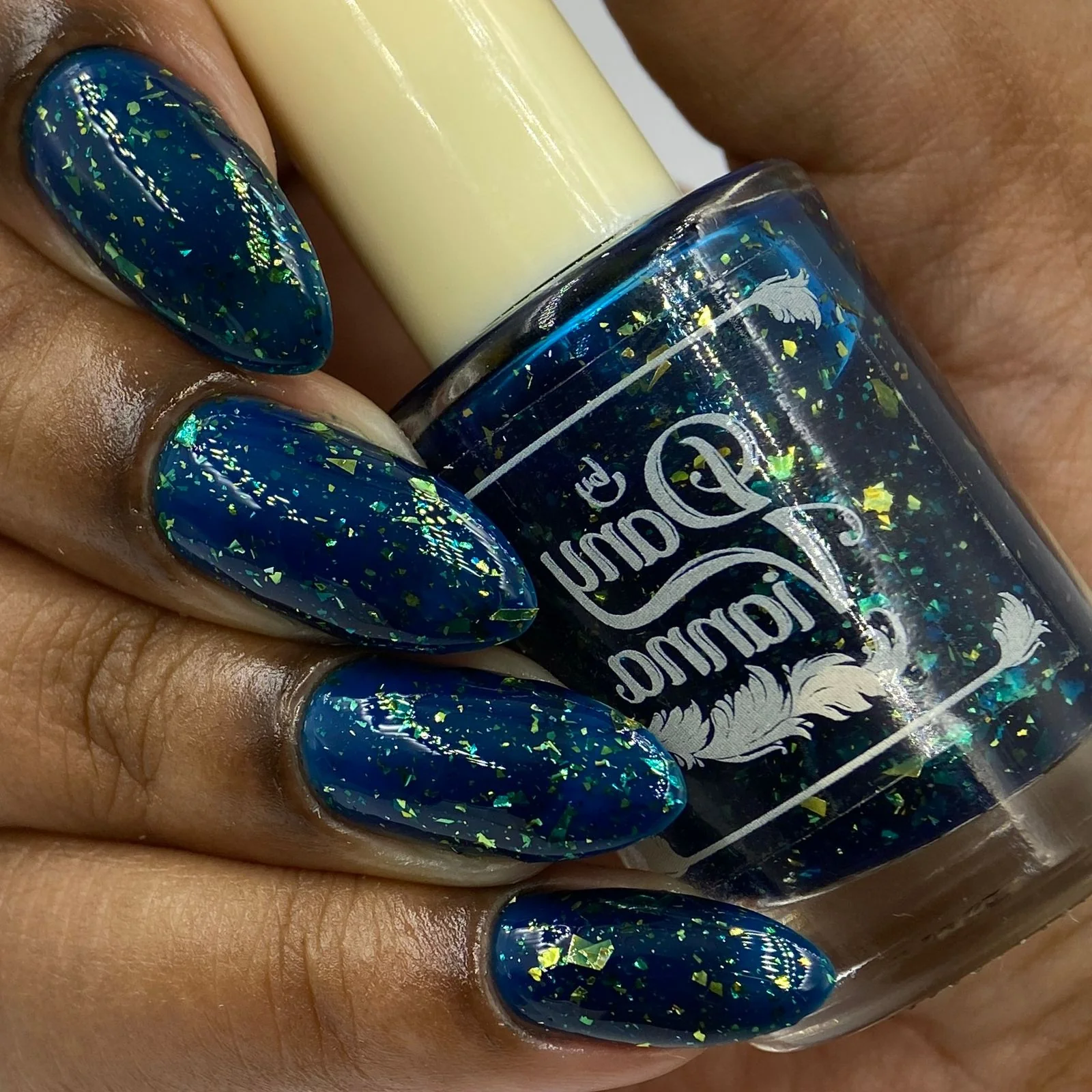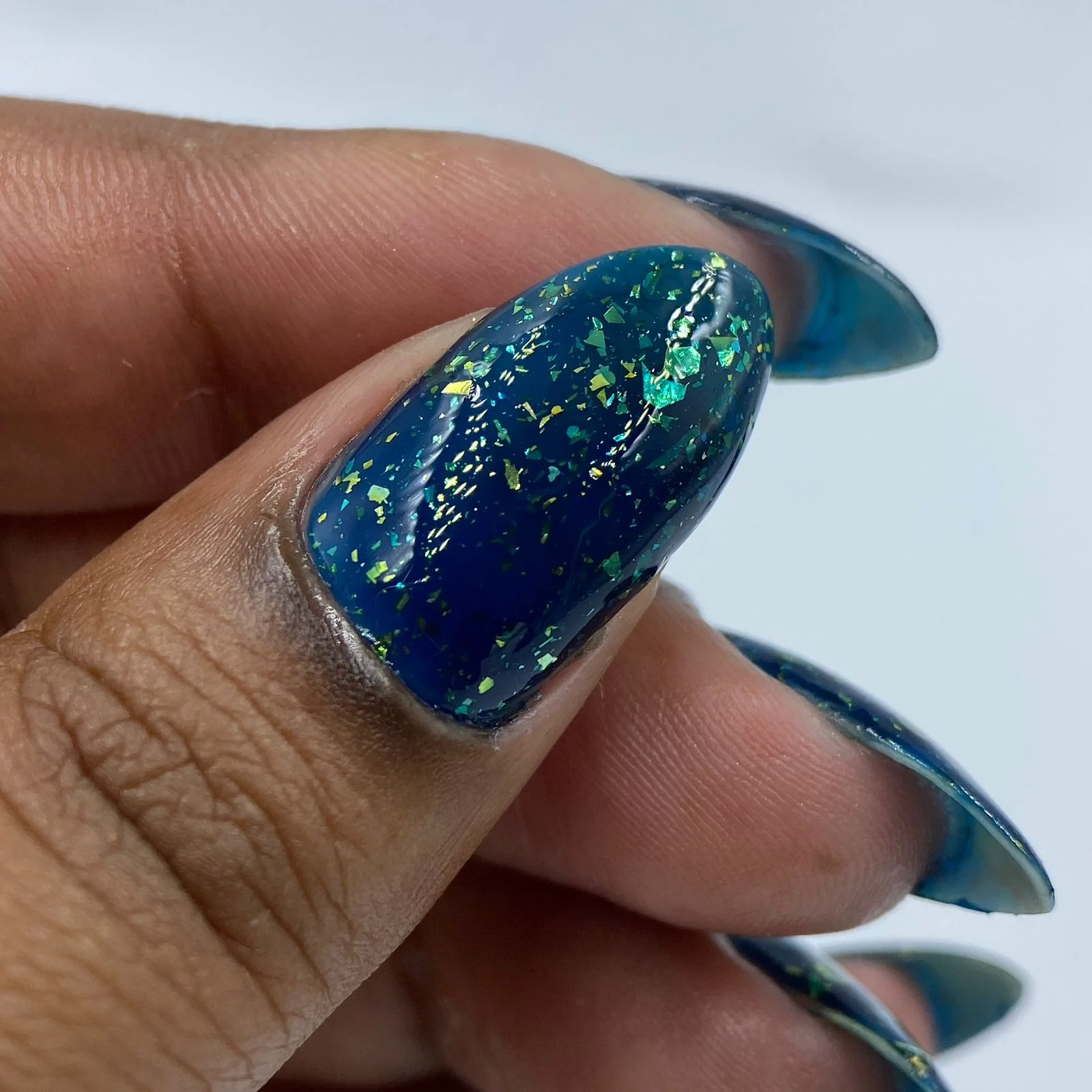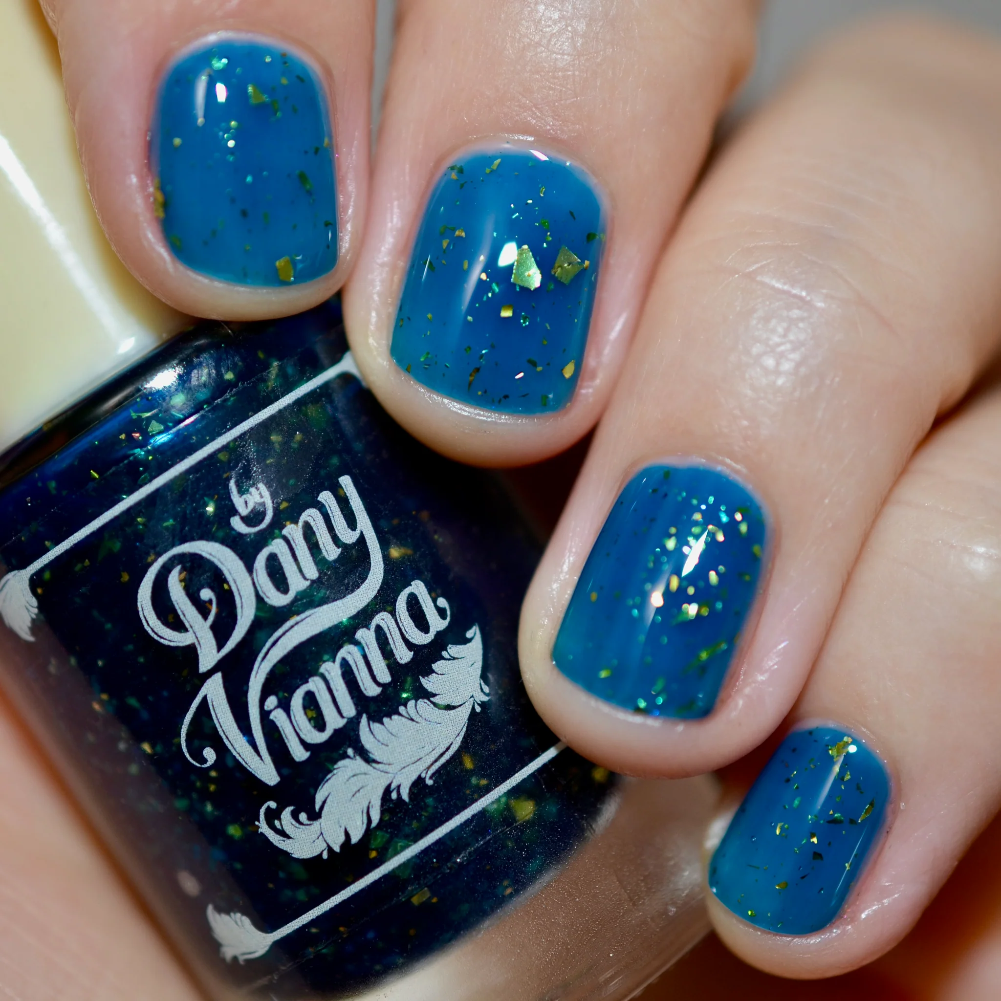 'Fyero Tigelaar' is a blue jelly nail polish with gold metallic flakes.