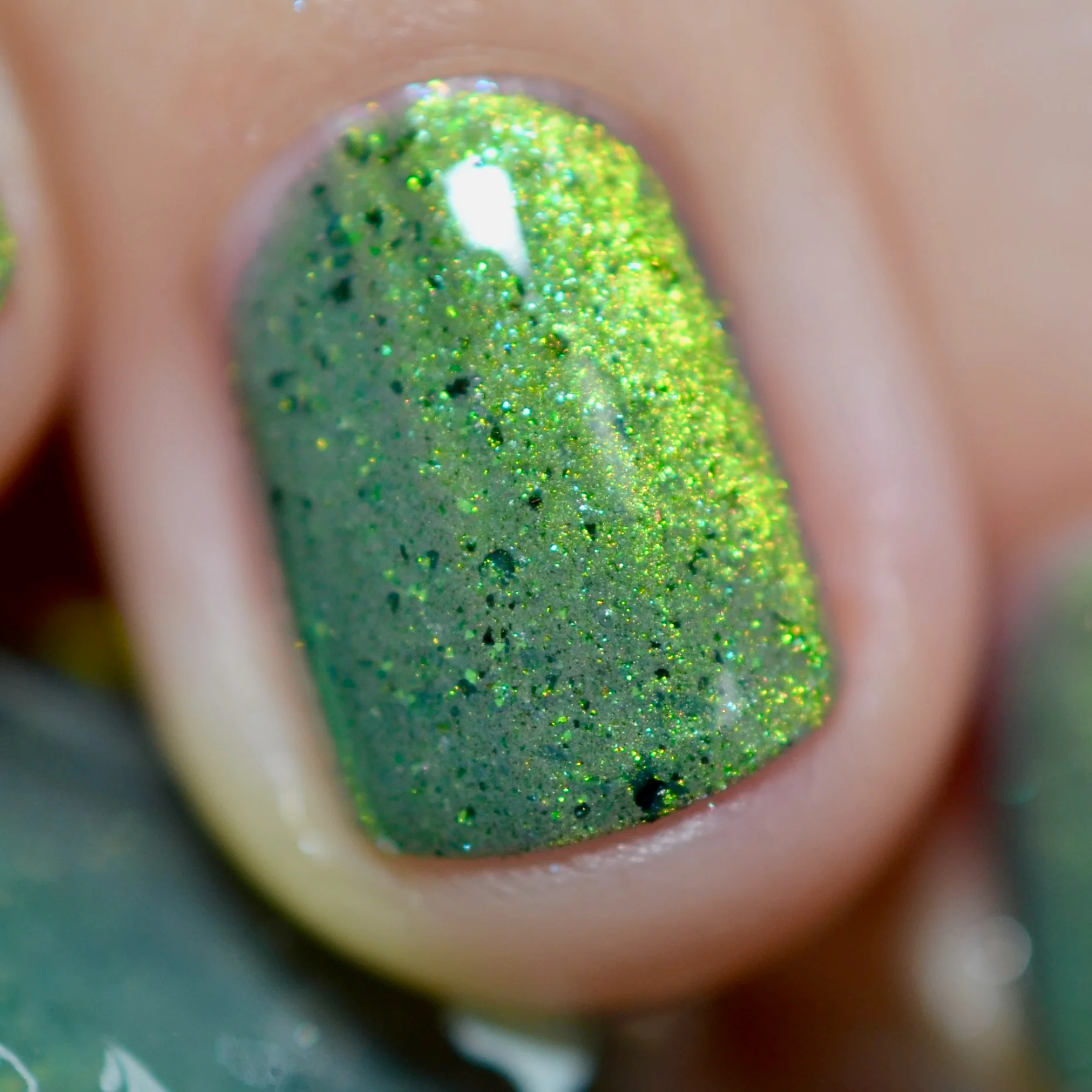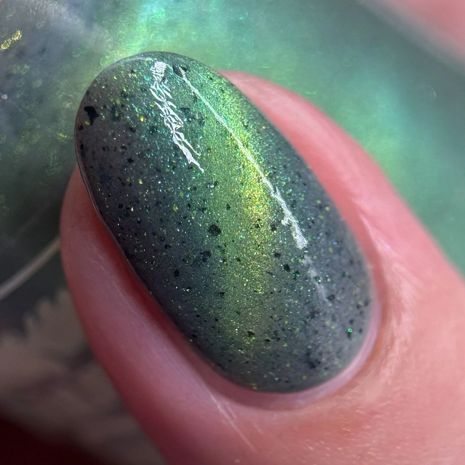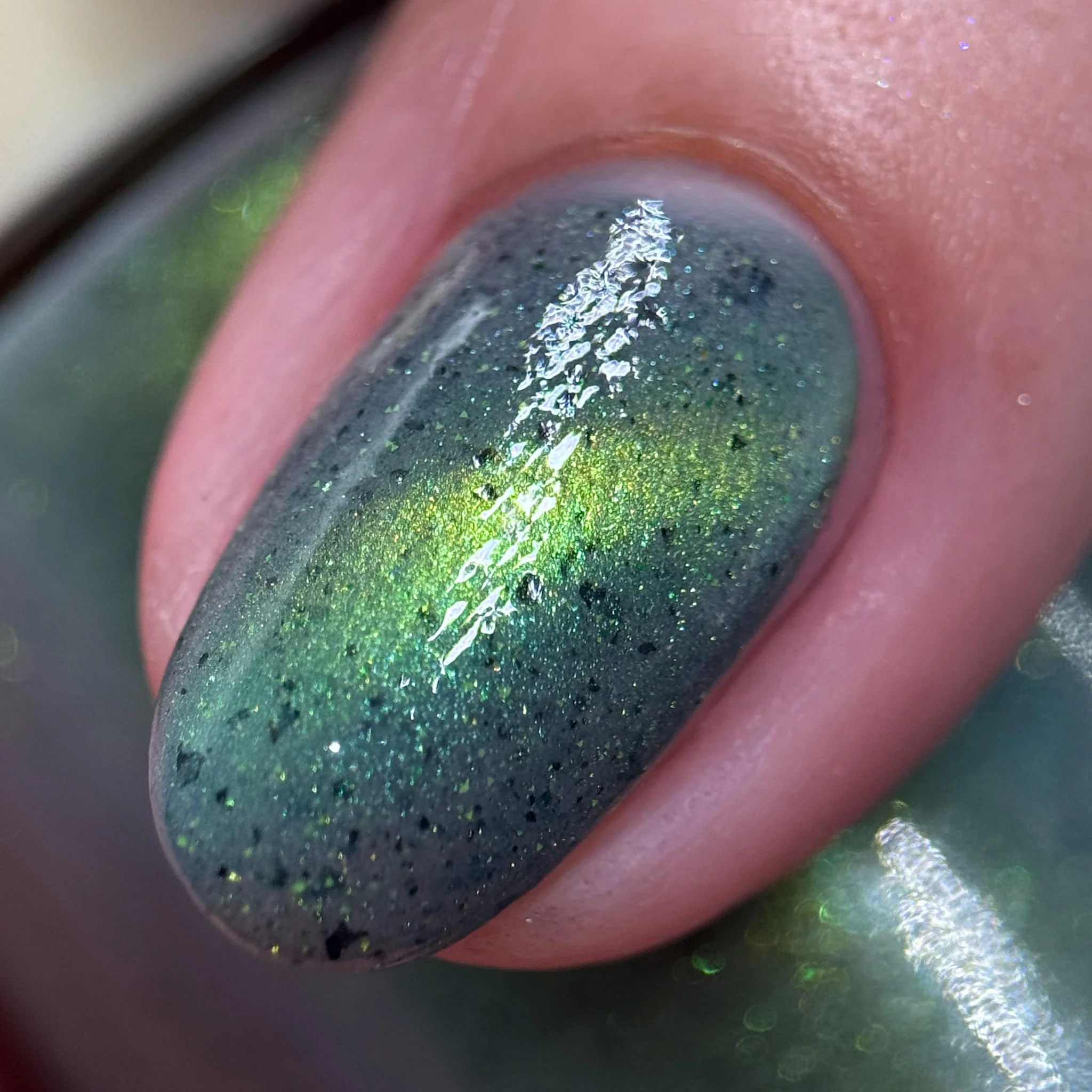 'Unlimited' has a grey crelly base with black flakes, green reflective glitters, and a green magnetic effect.