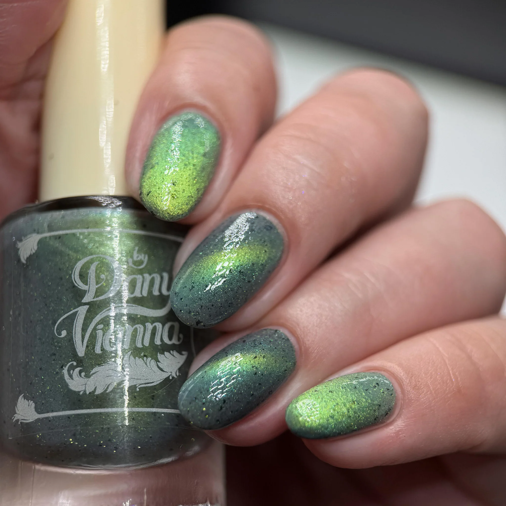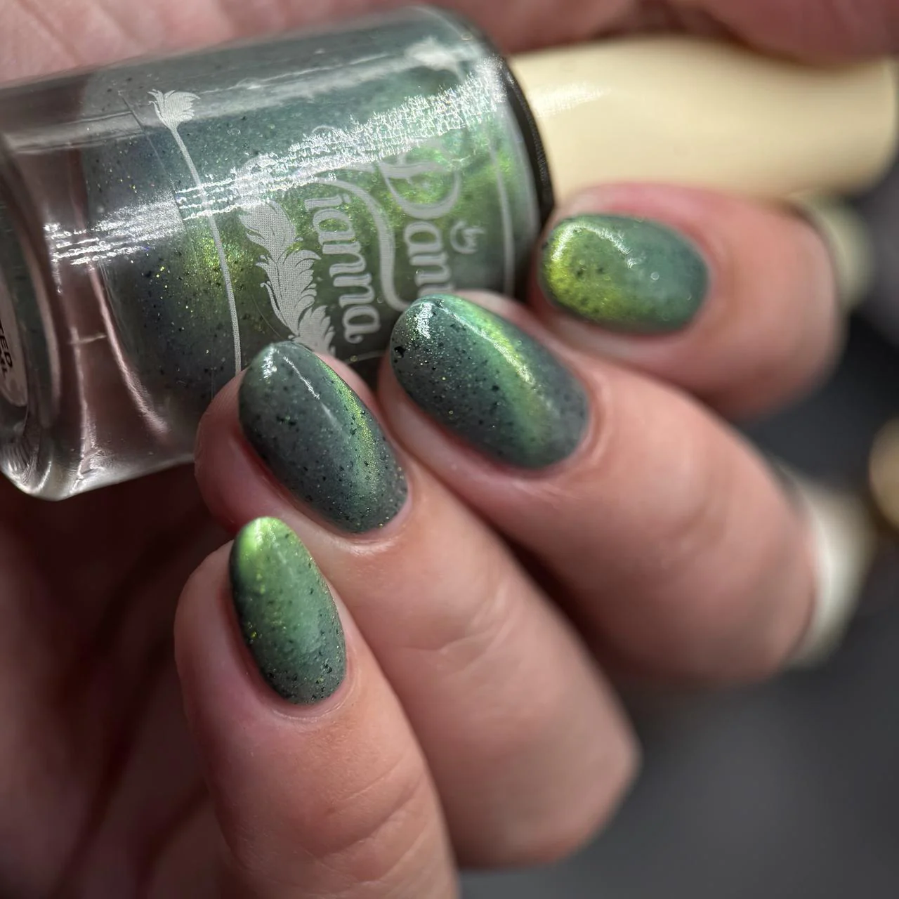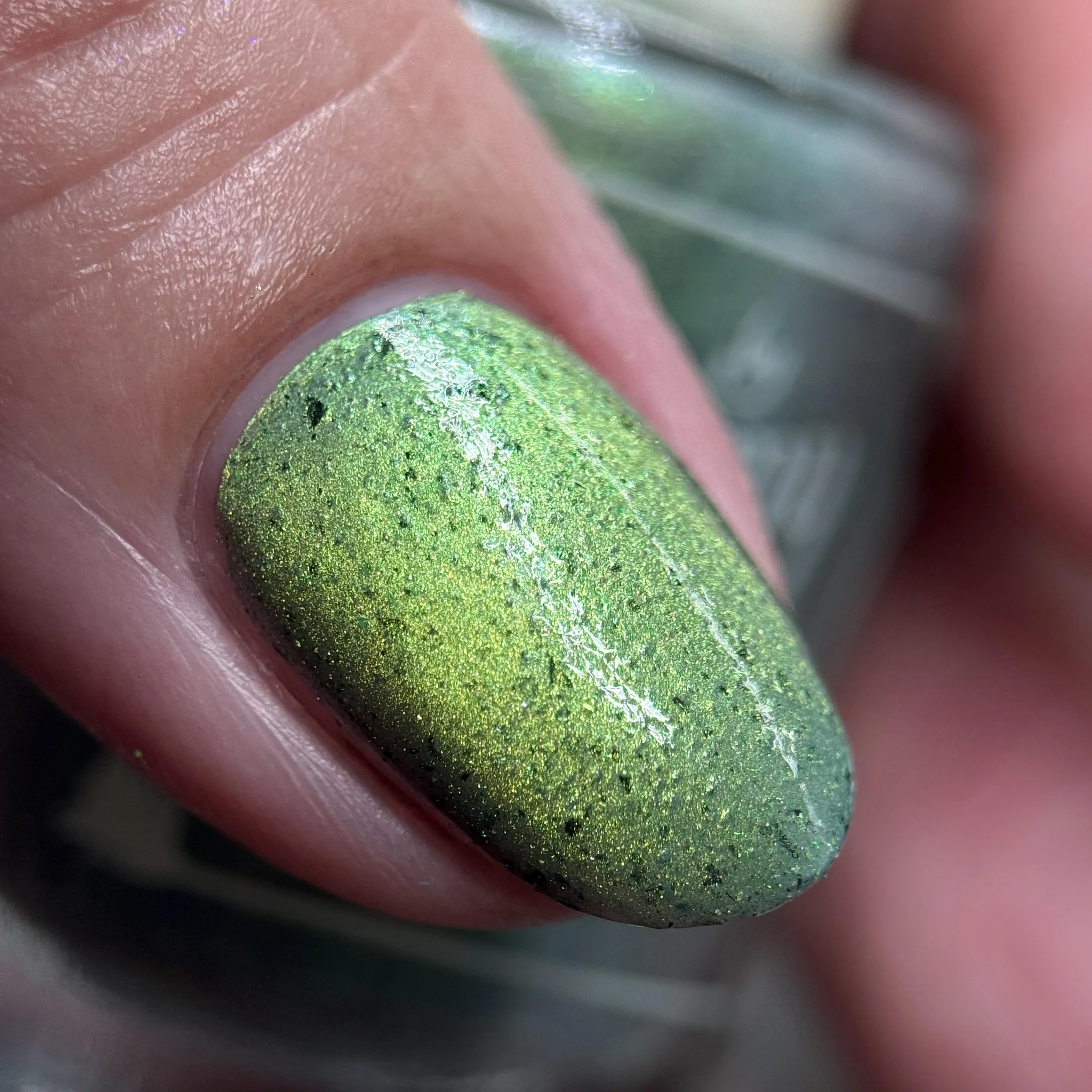 'Unlimited' has a grey crelly base with black flakes, green reflective glitters, and a green magnetic effect.