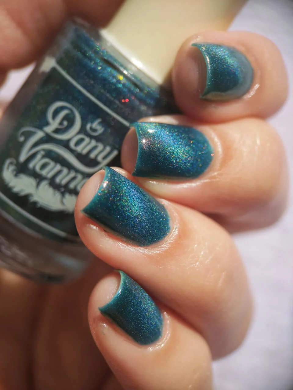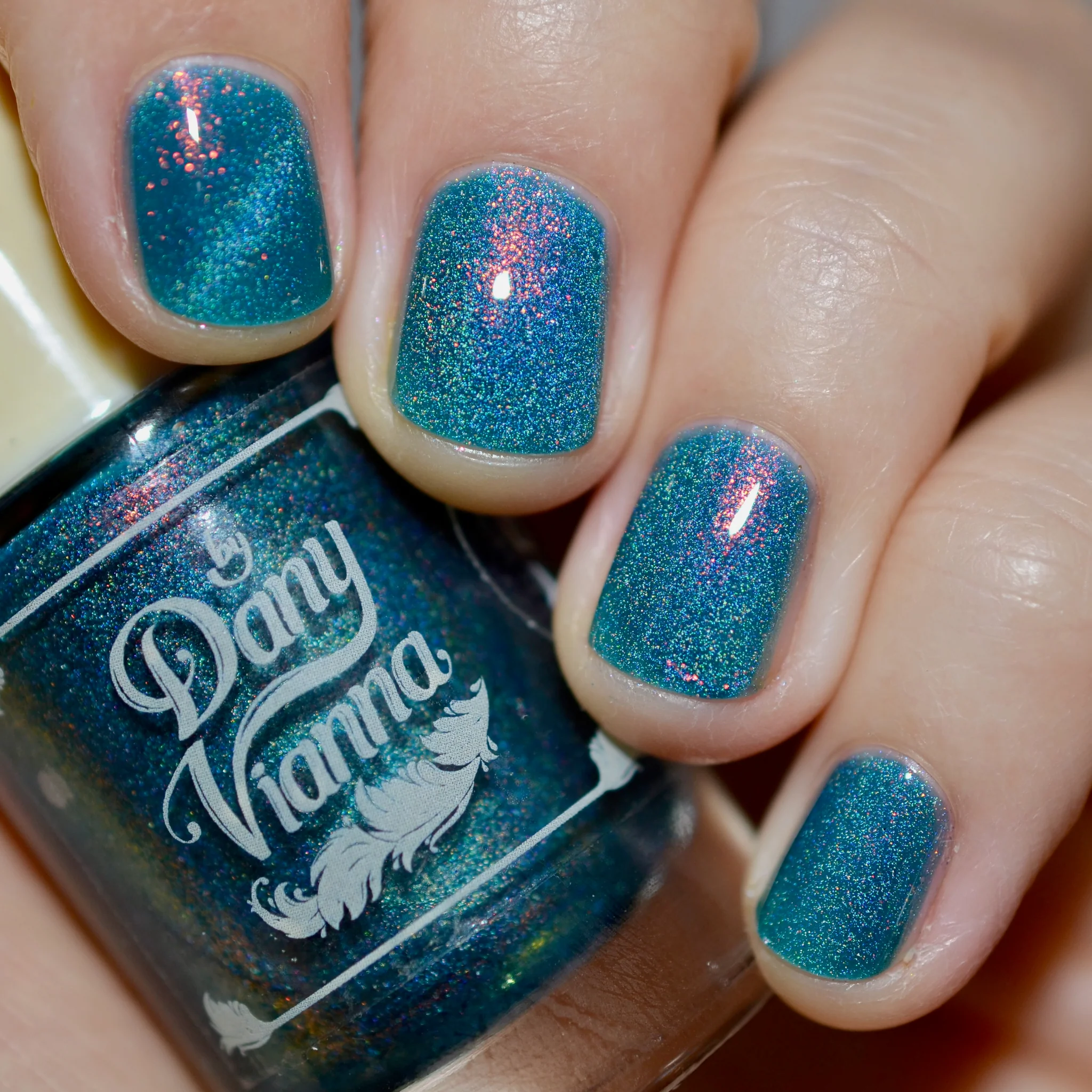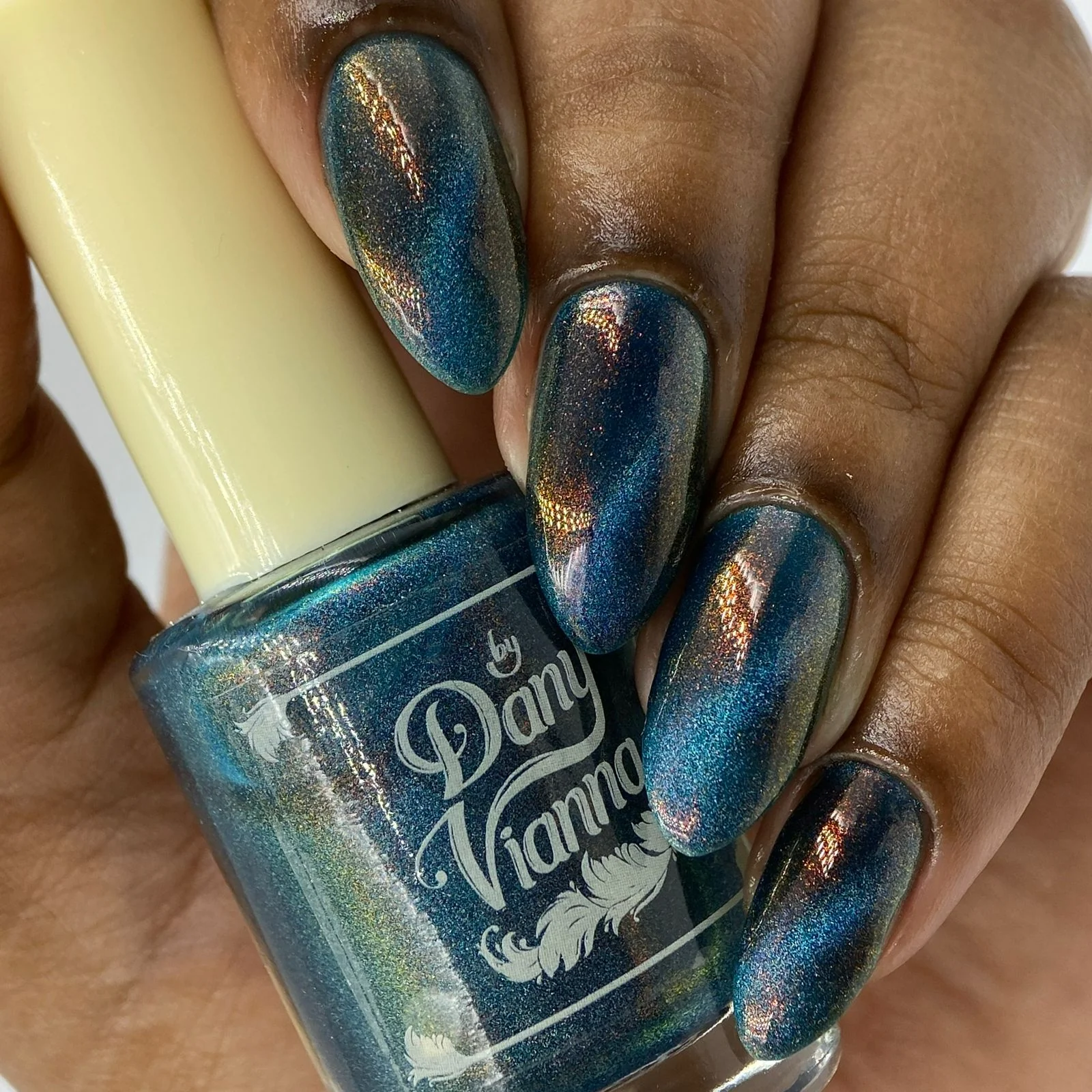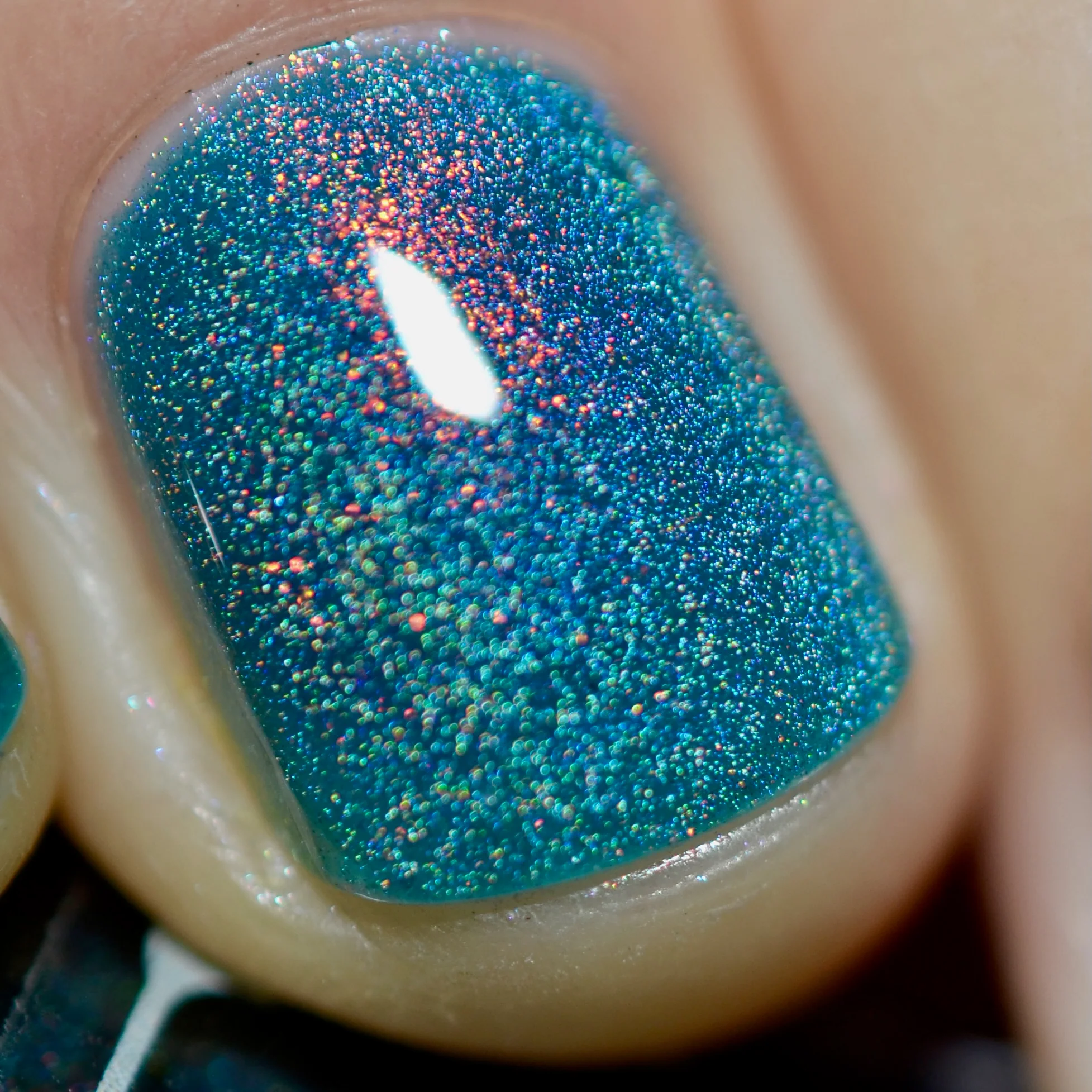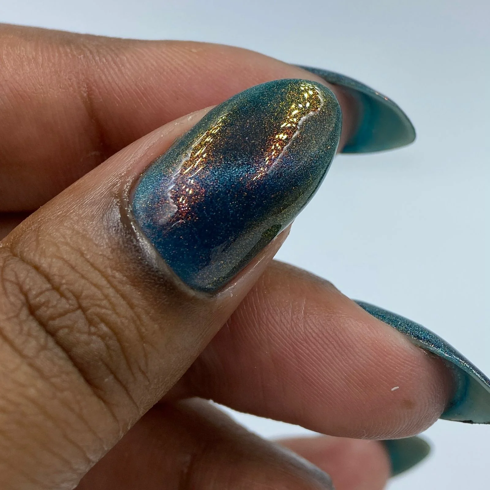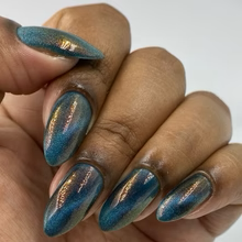 'Melted Witch' has a petroleum blue jelly base with fine orange aurora shimmer and holographic magnetic effect.