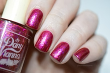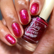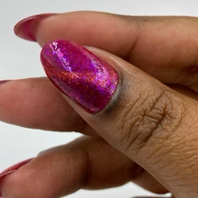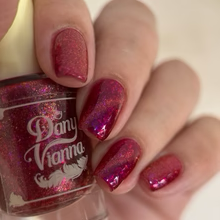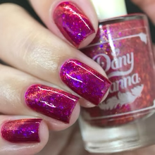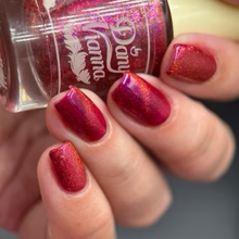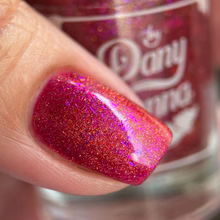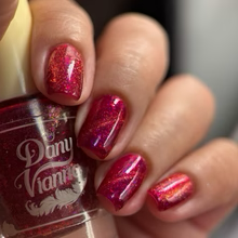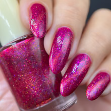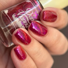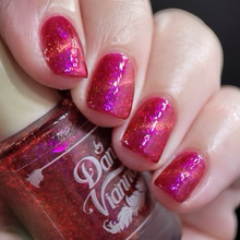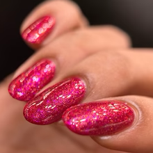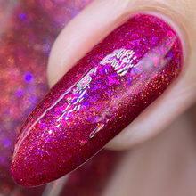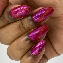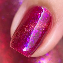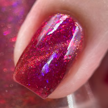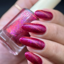 'Dragonfire Opal' is a red jelly nail polish with purple to pink aurora shimmer, iridescent flakes, and a gold magnetic effect.