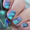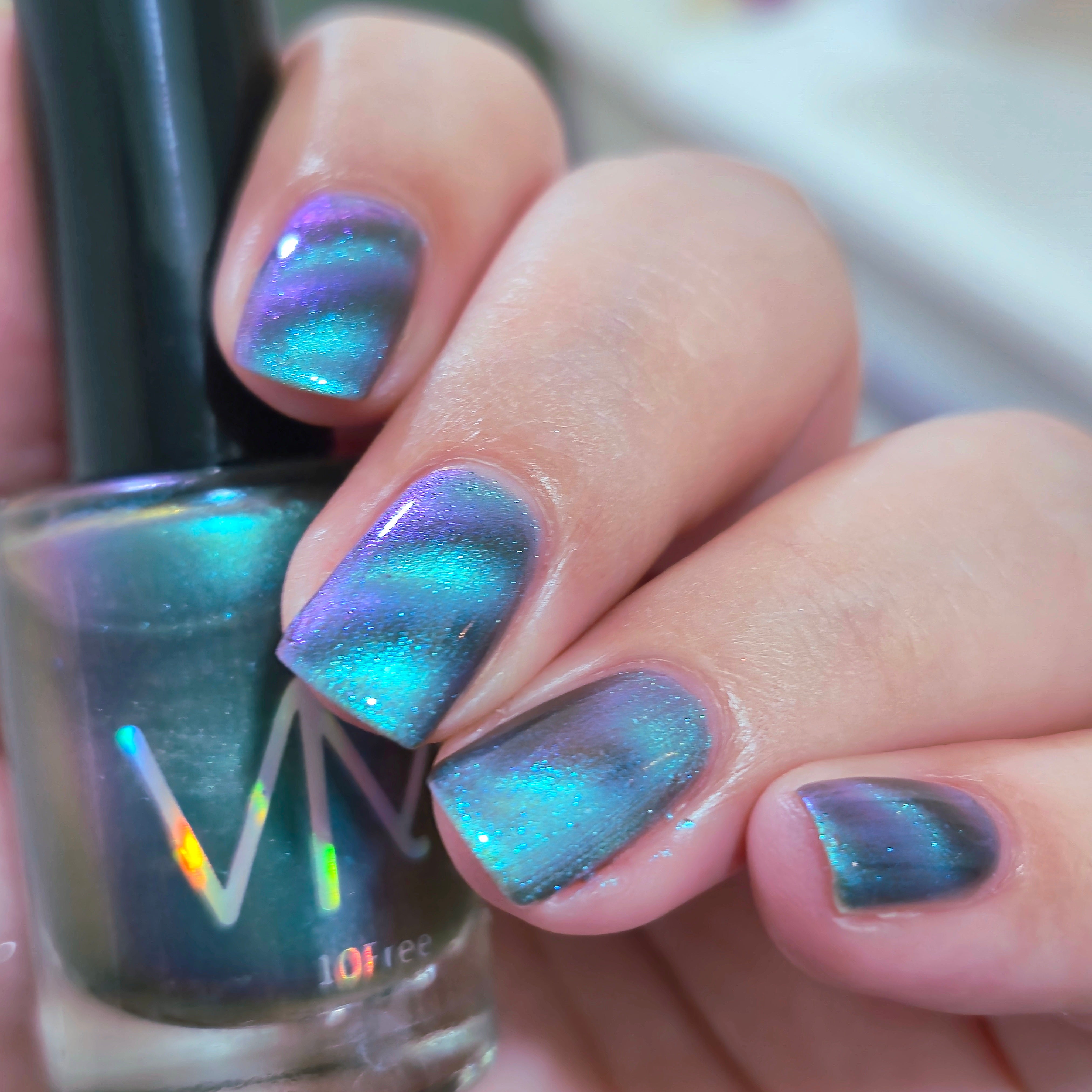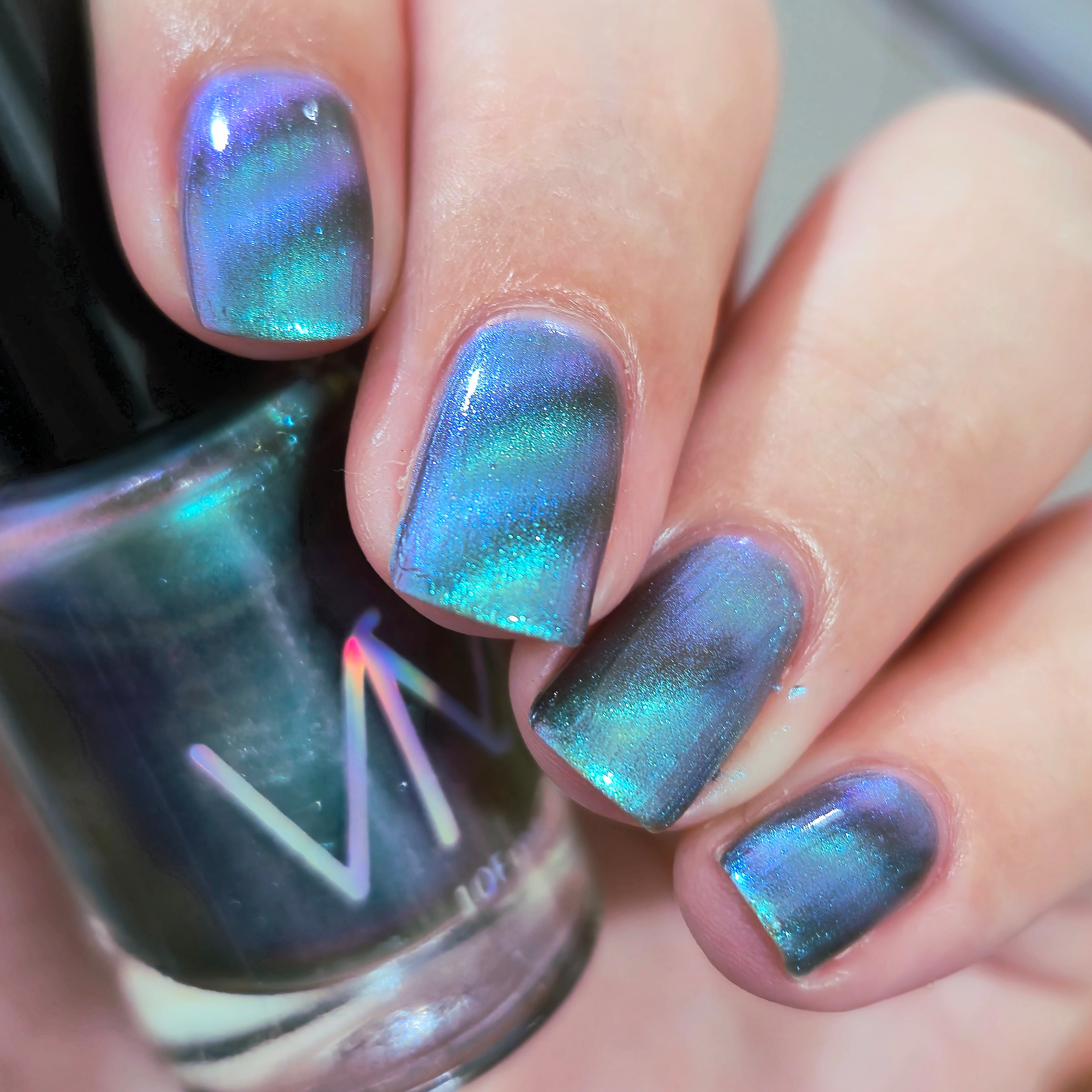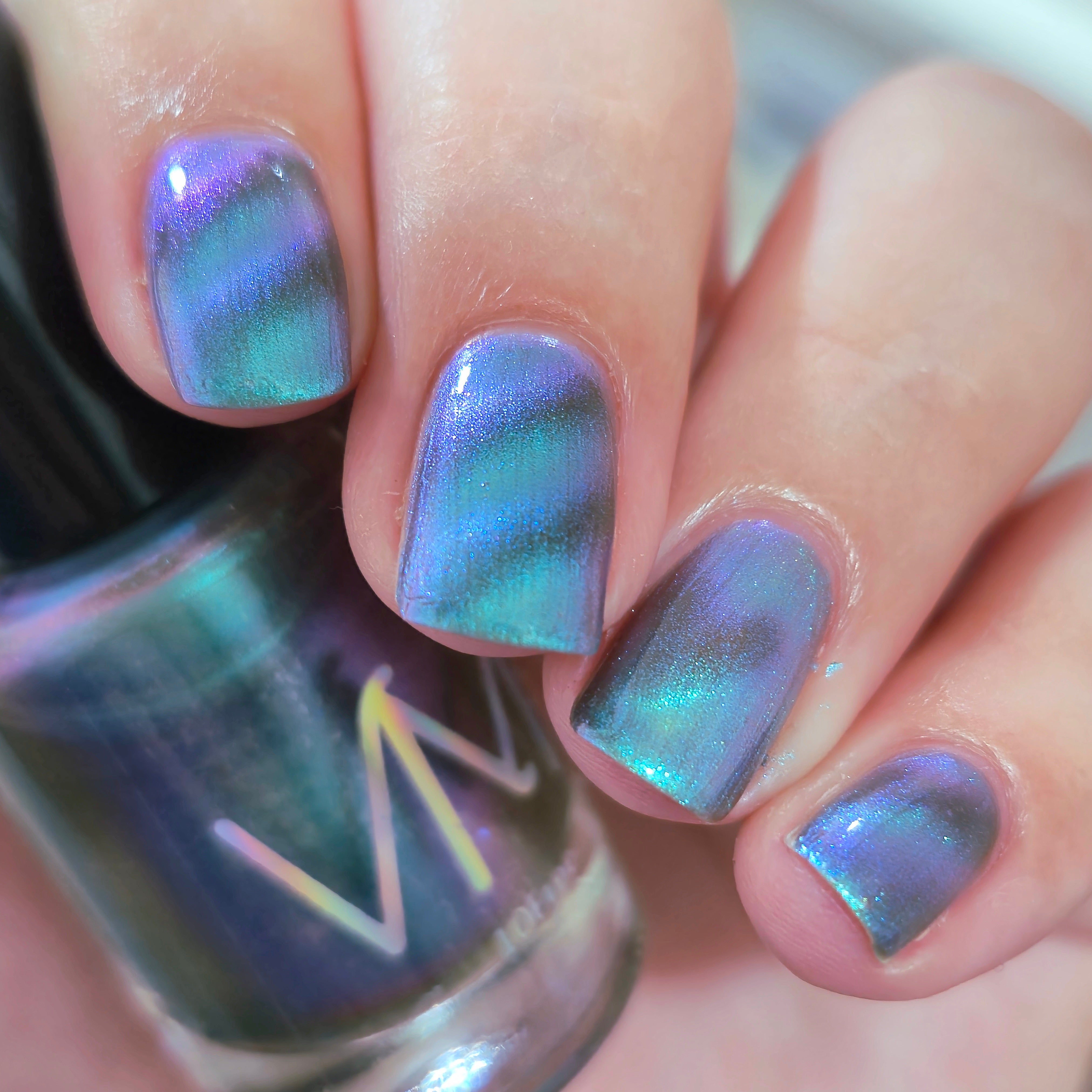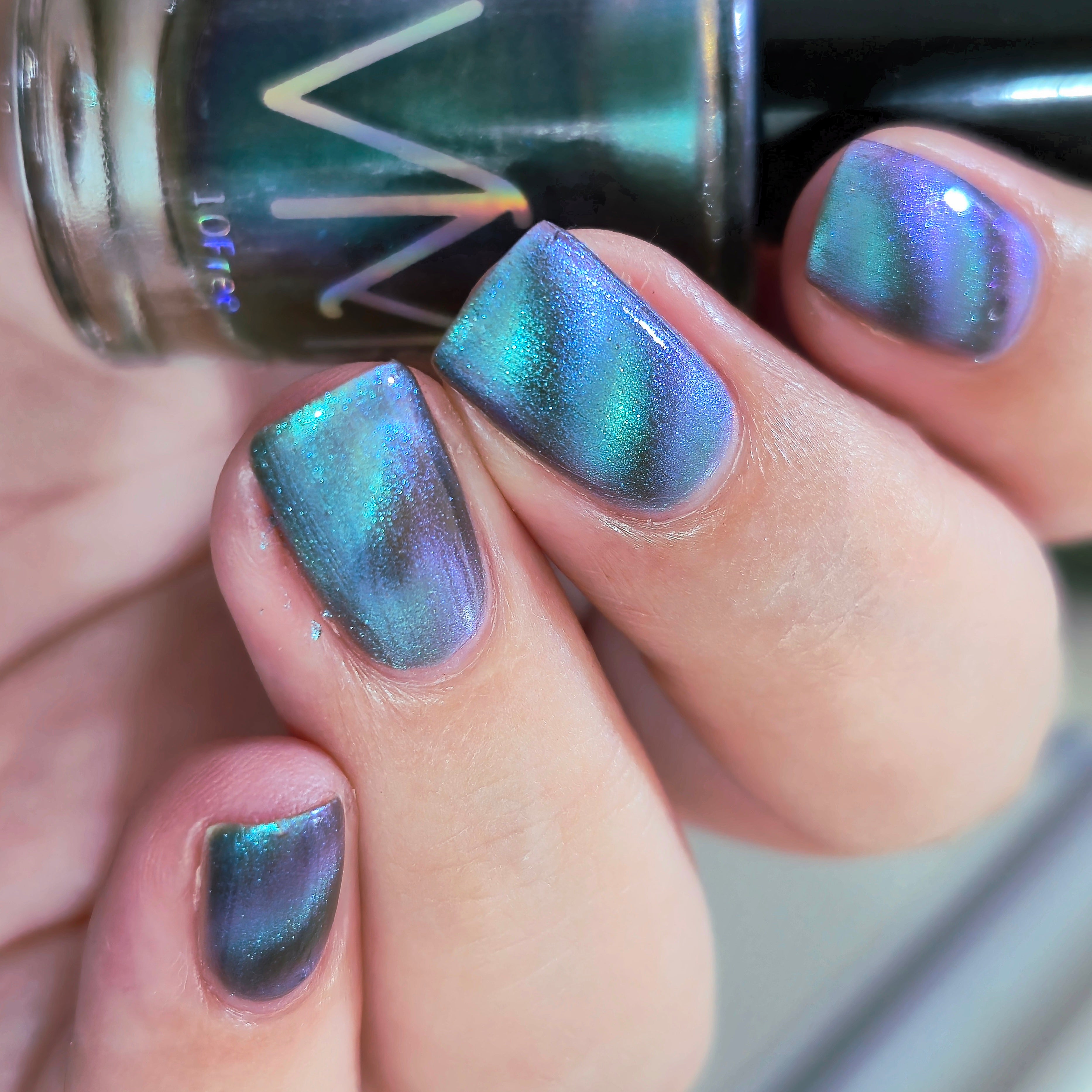 'Sky Horus' is a magnetic nail polish with turquoise and purple hues.