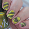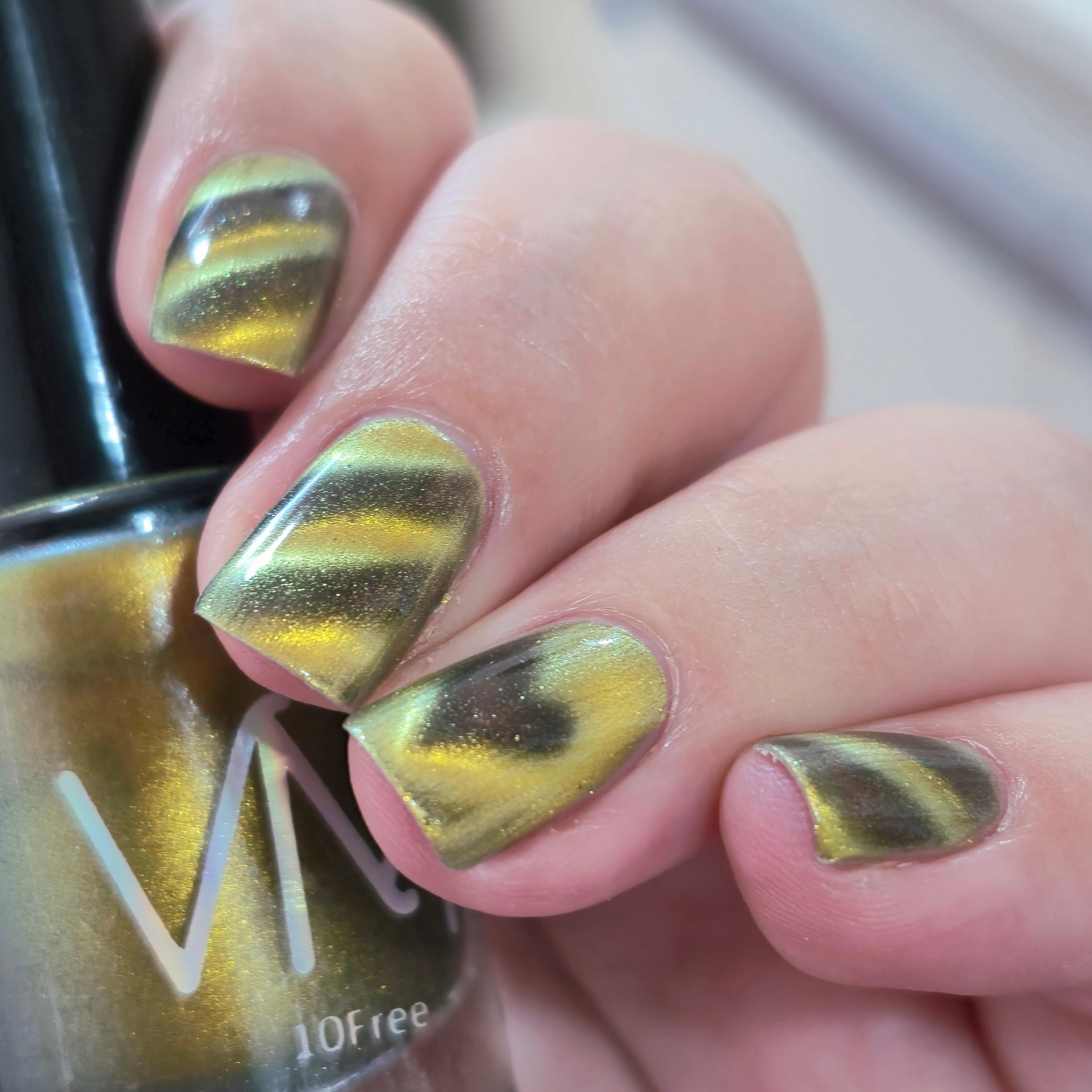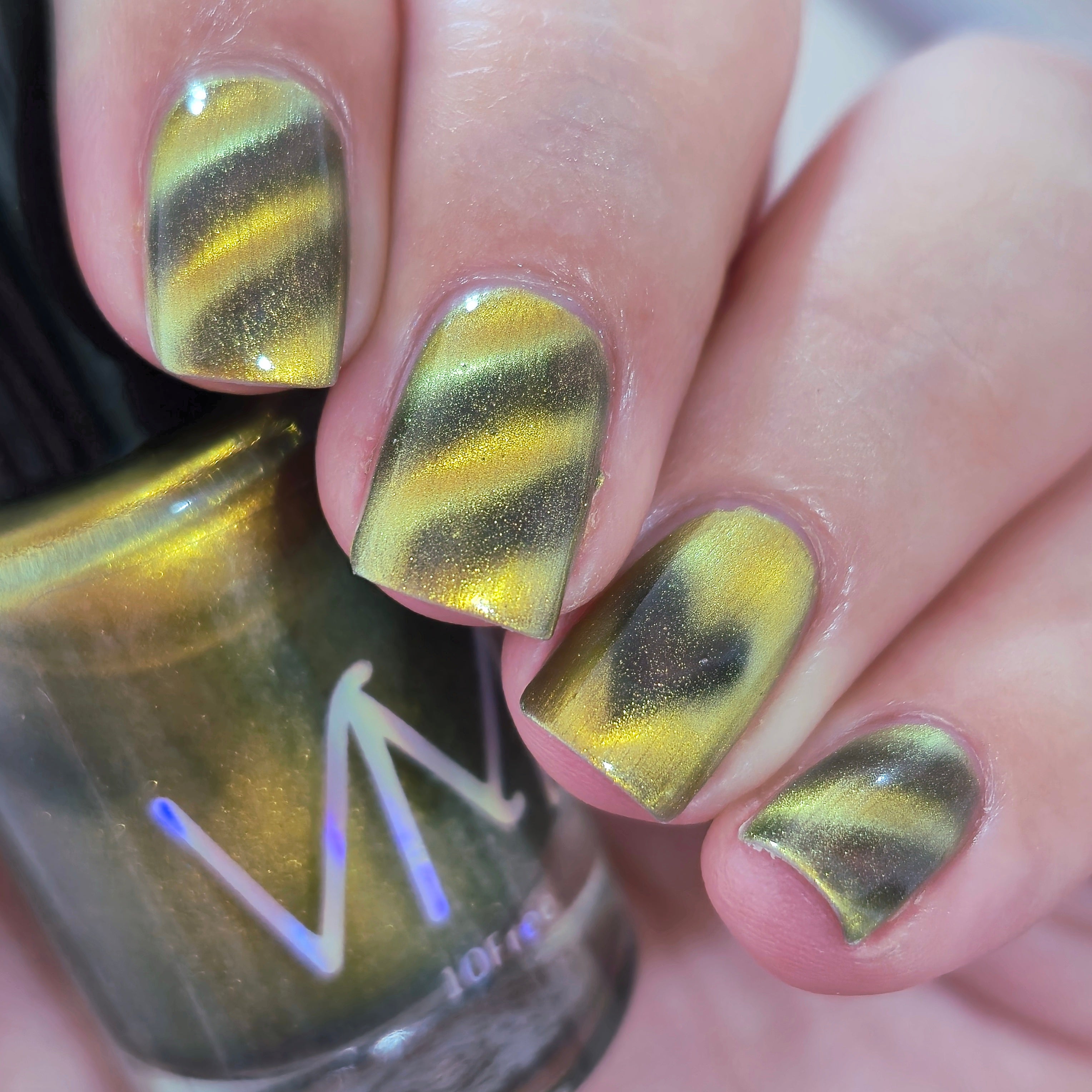 'The Sun of Creation' is a magnetic nail polish with yellow and gold hues and green at extreme angles.