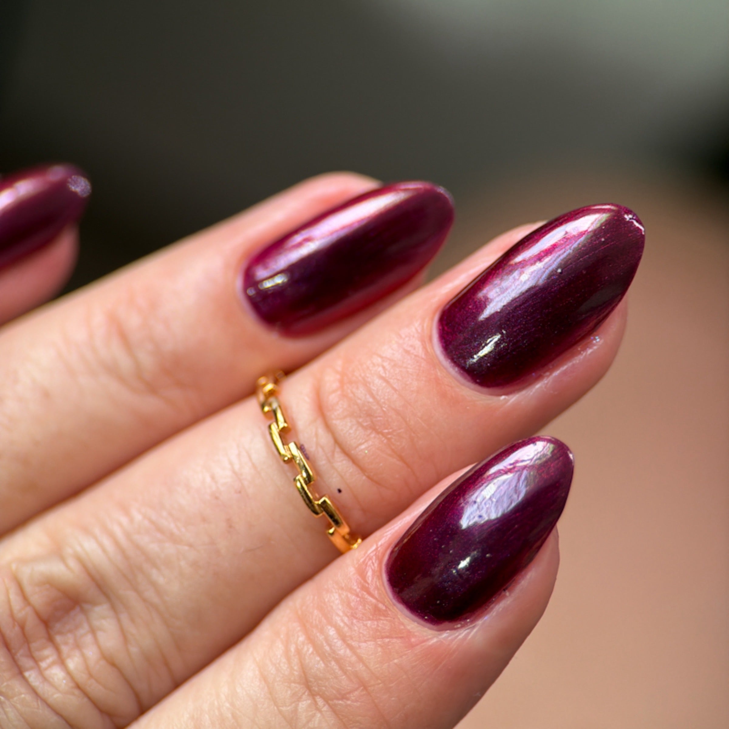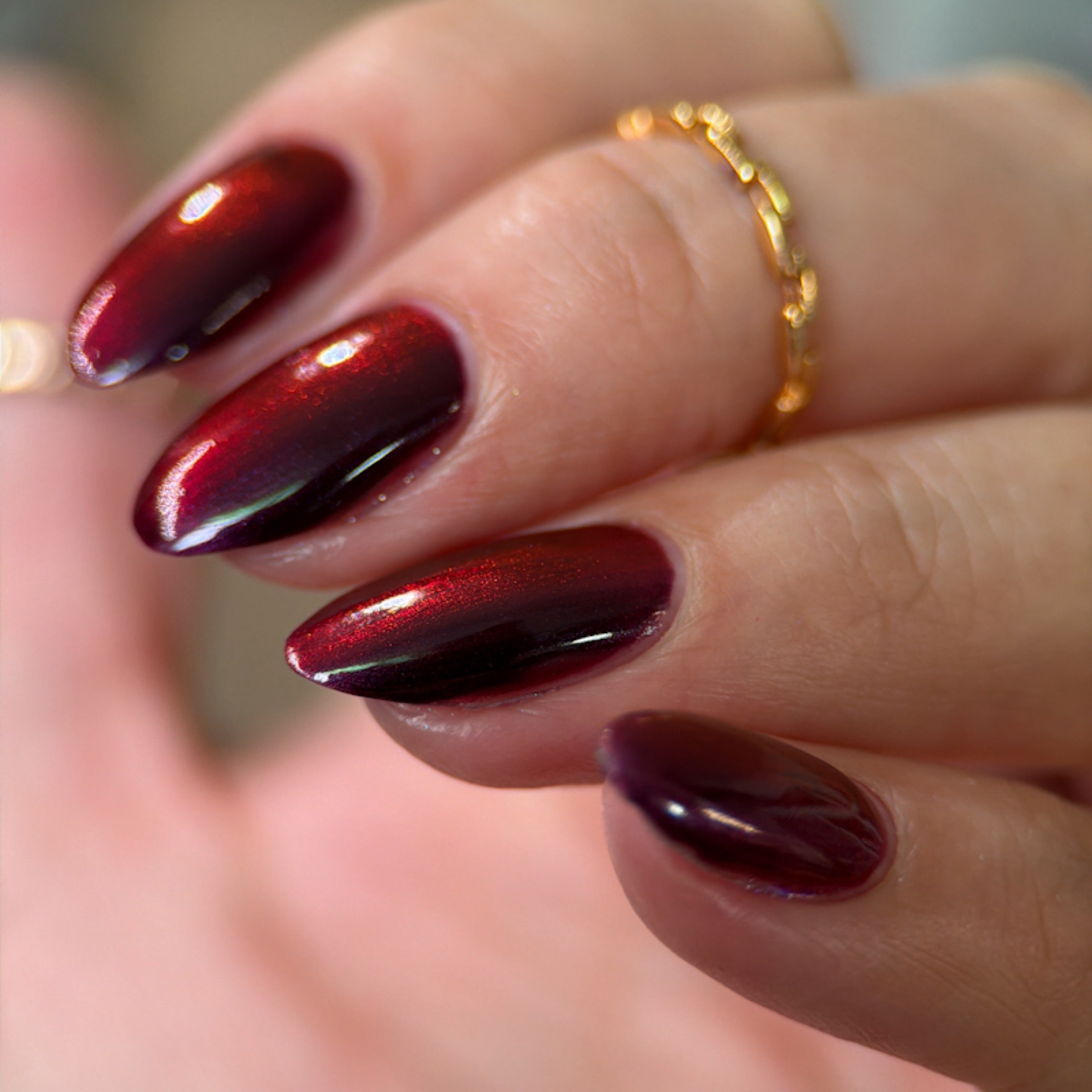 'Deal with God' is a burgundy nail polish with black-to-red multichrome shift.