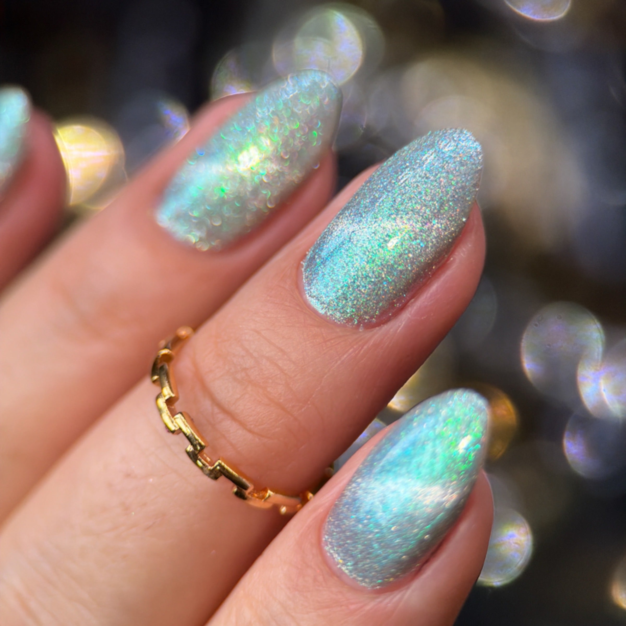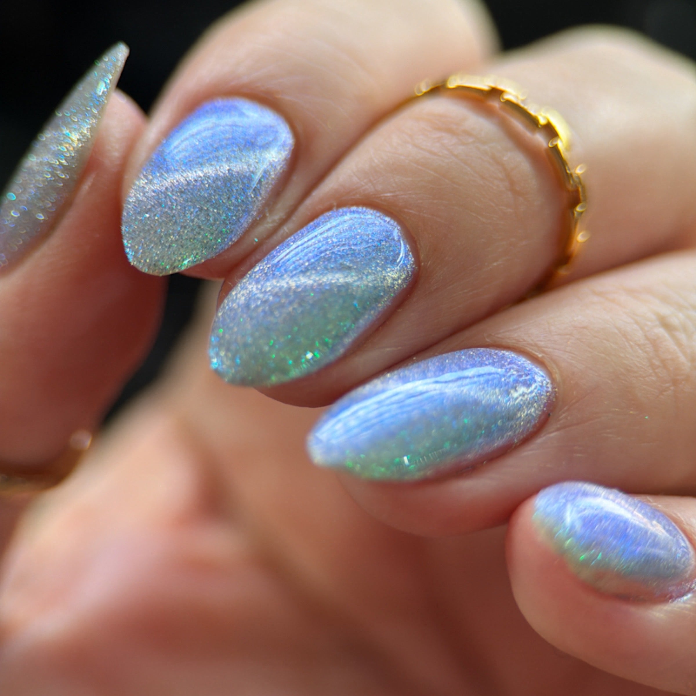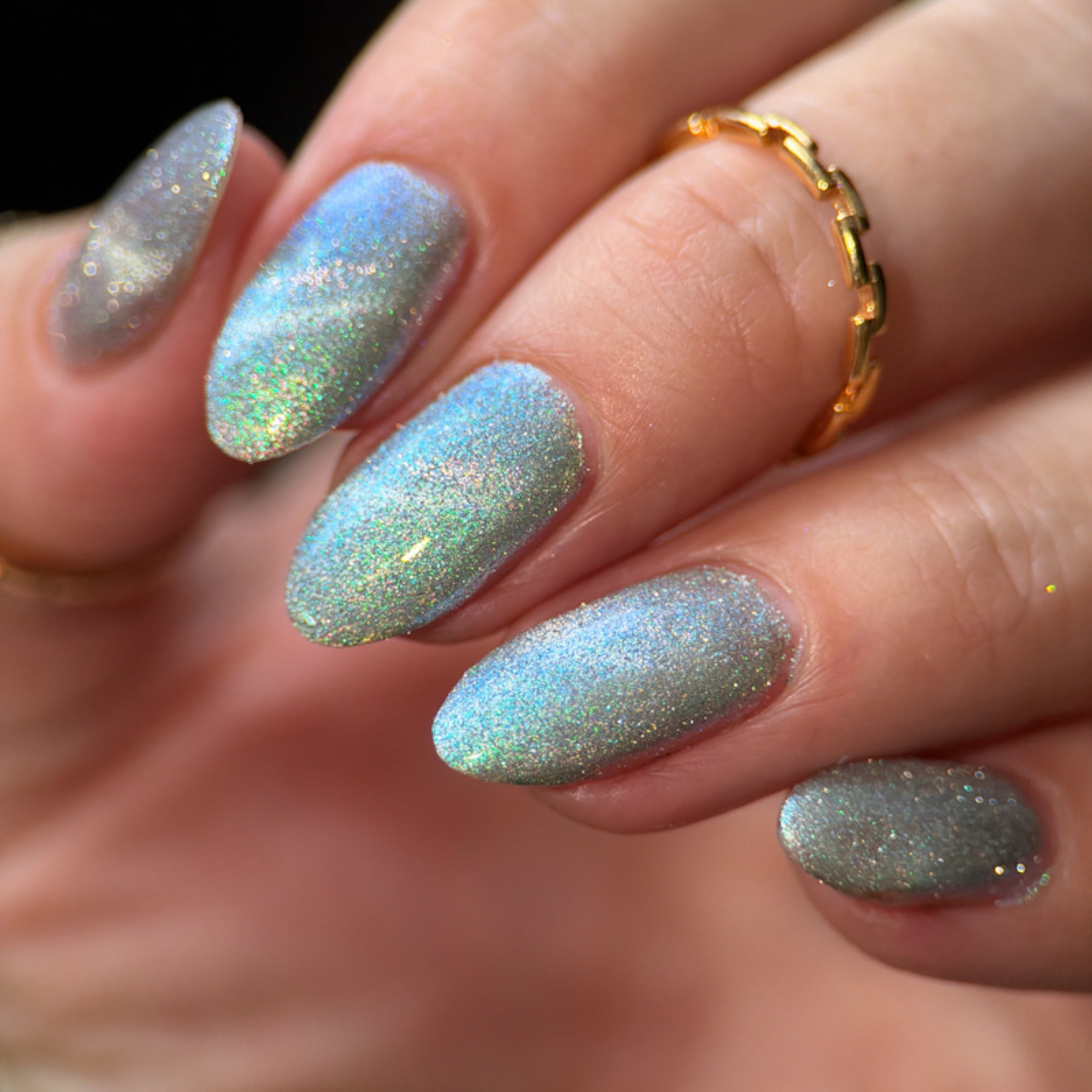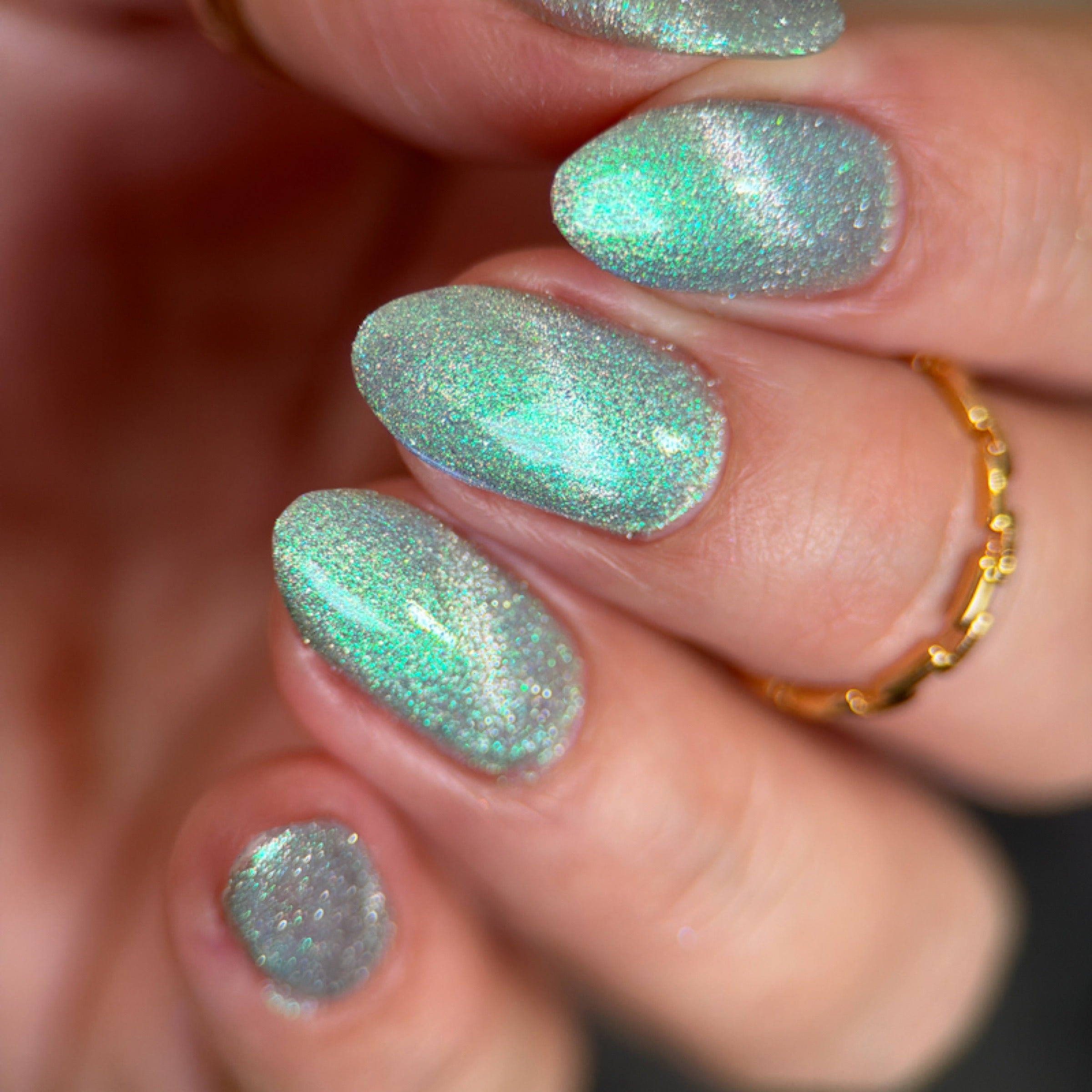 'Friends Don't Lie' is a silver magnetic nail polish with turquoise/purple aurora shimmer and silver reflective.