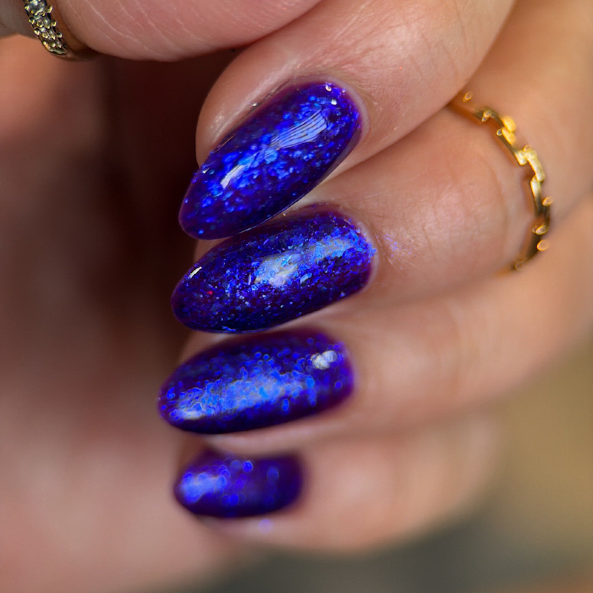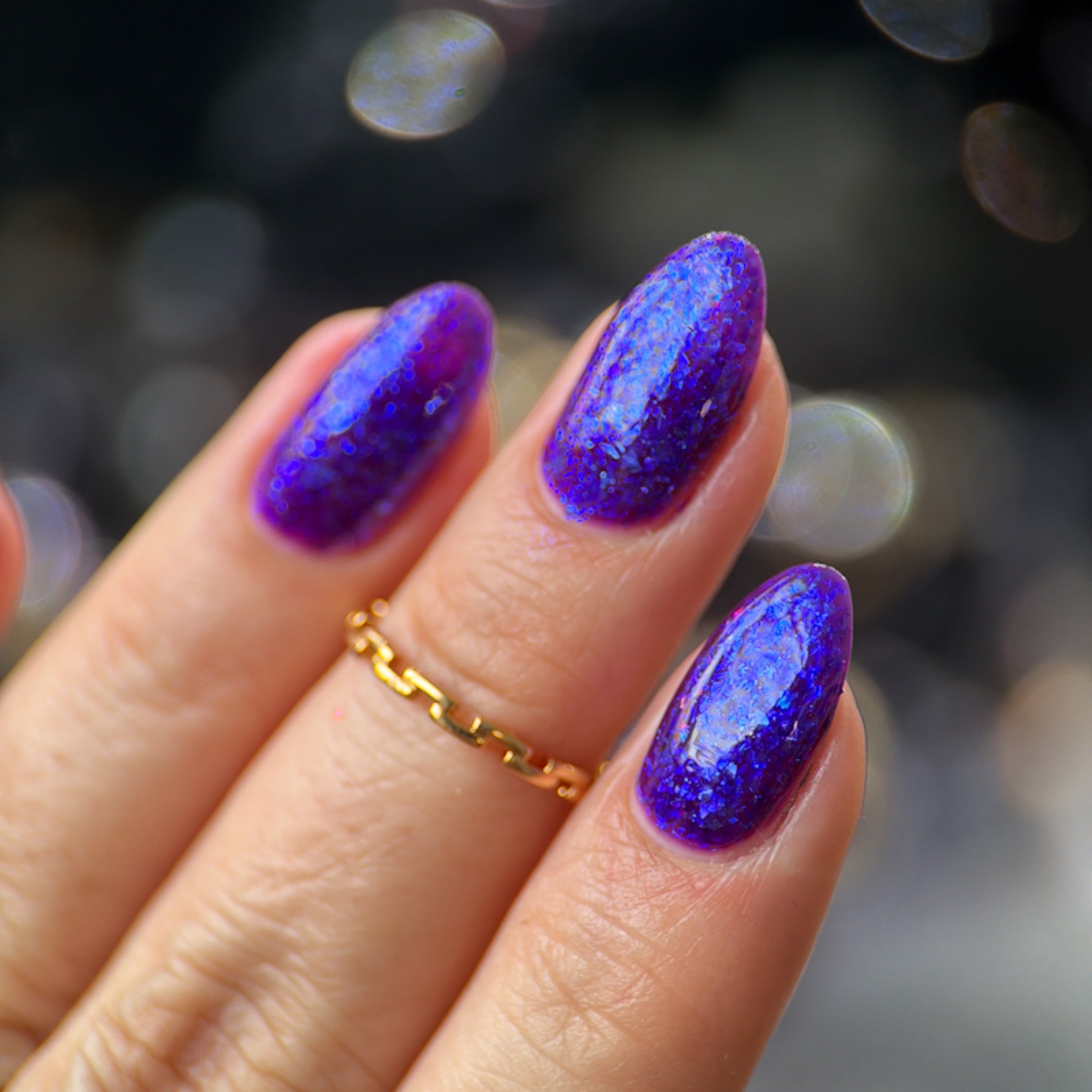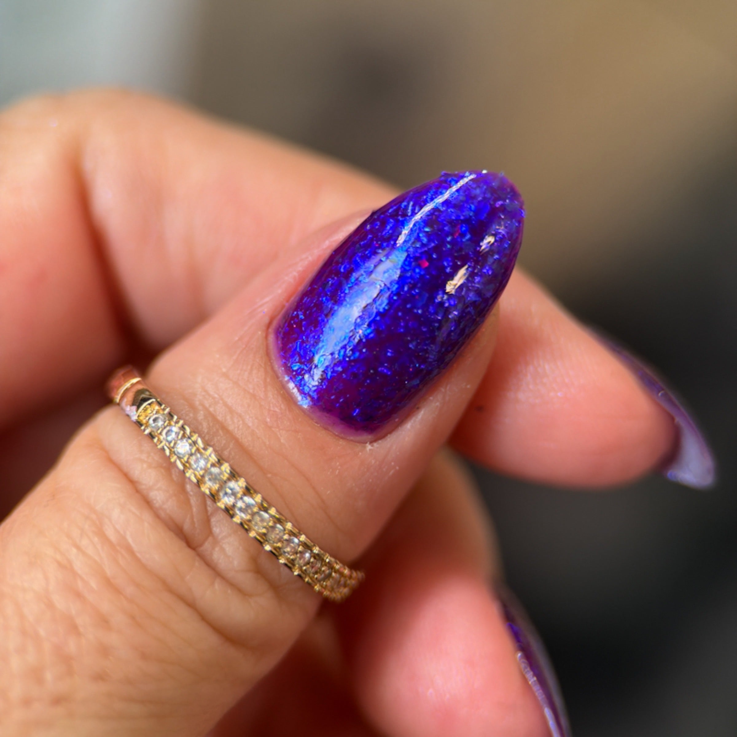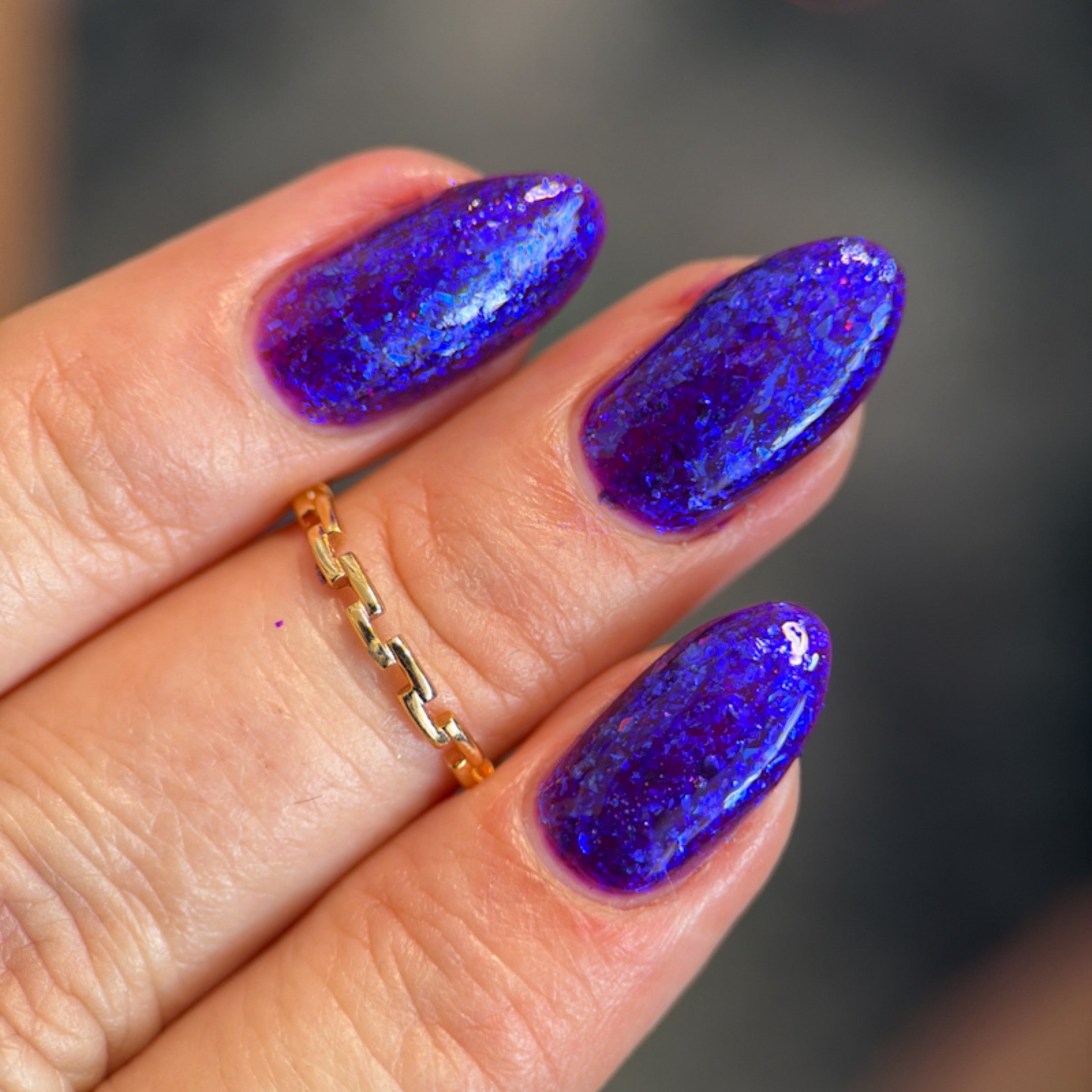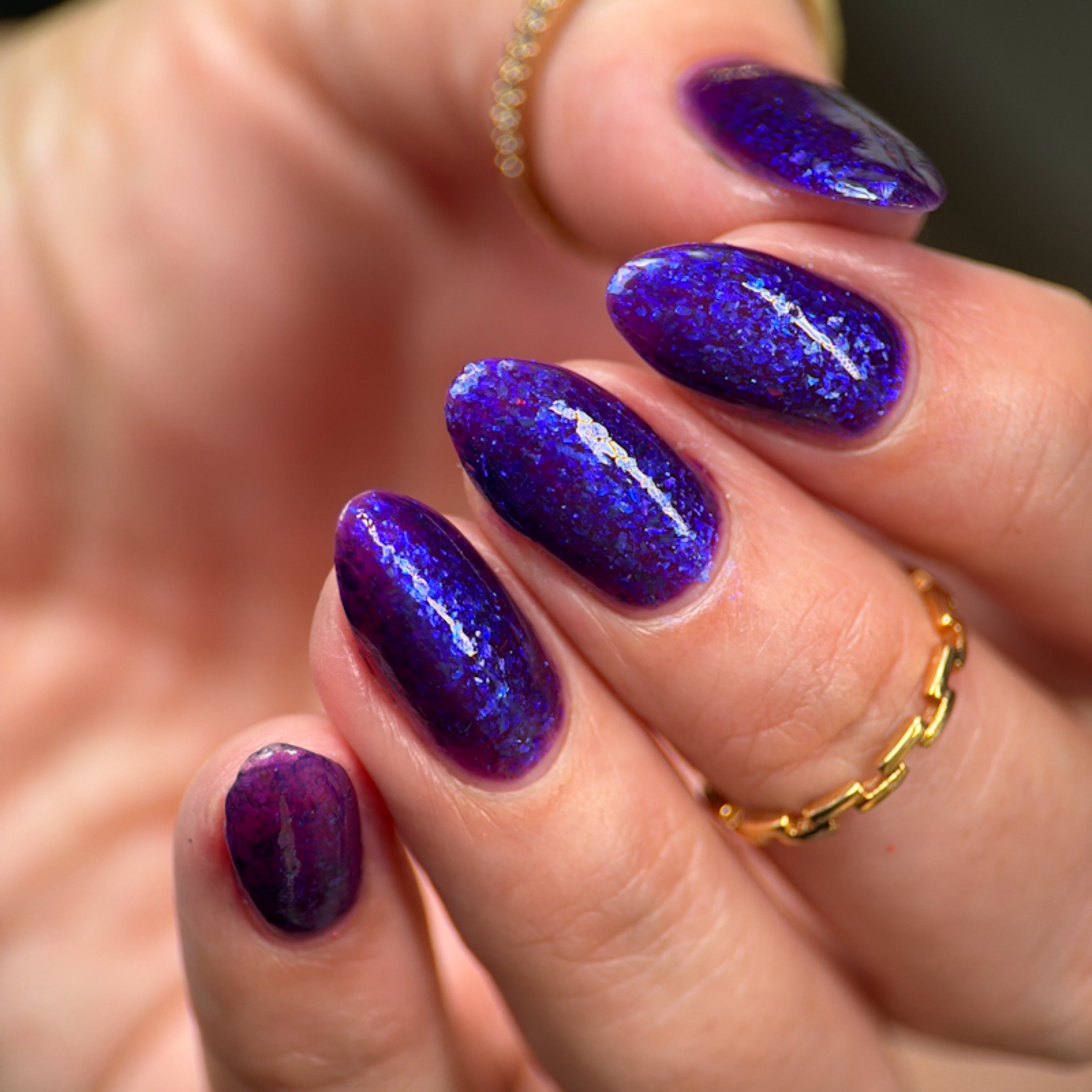 'Just Another Day' is a purple jelly nail polish with blue iridescent flakies.