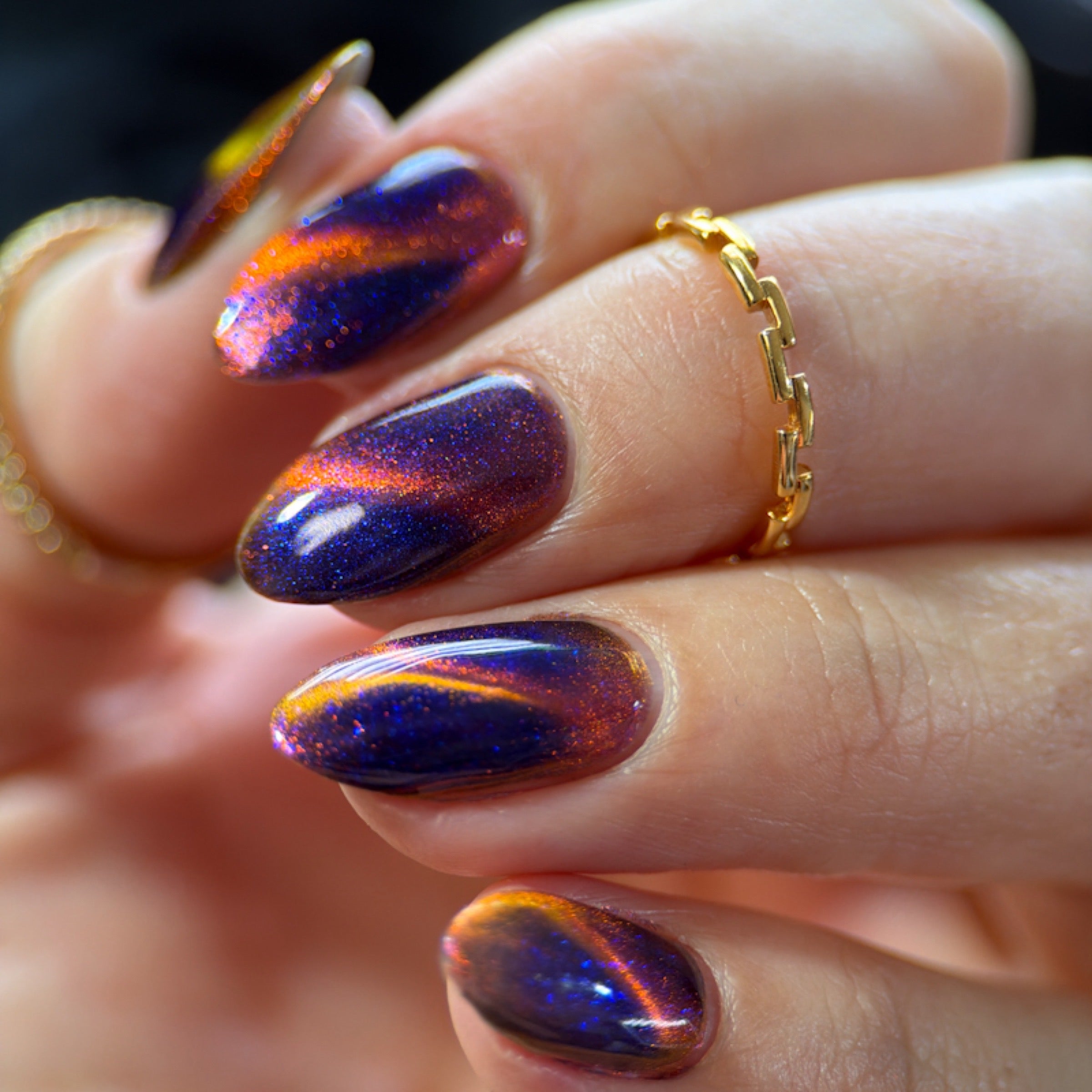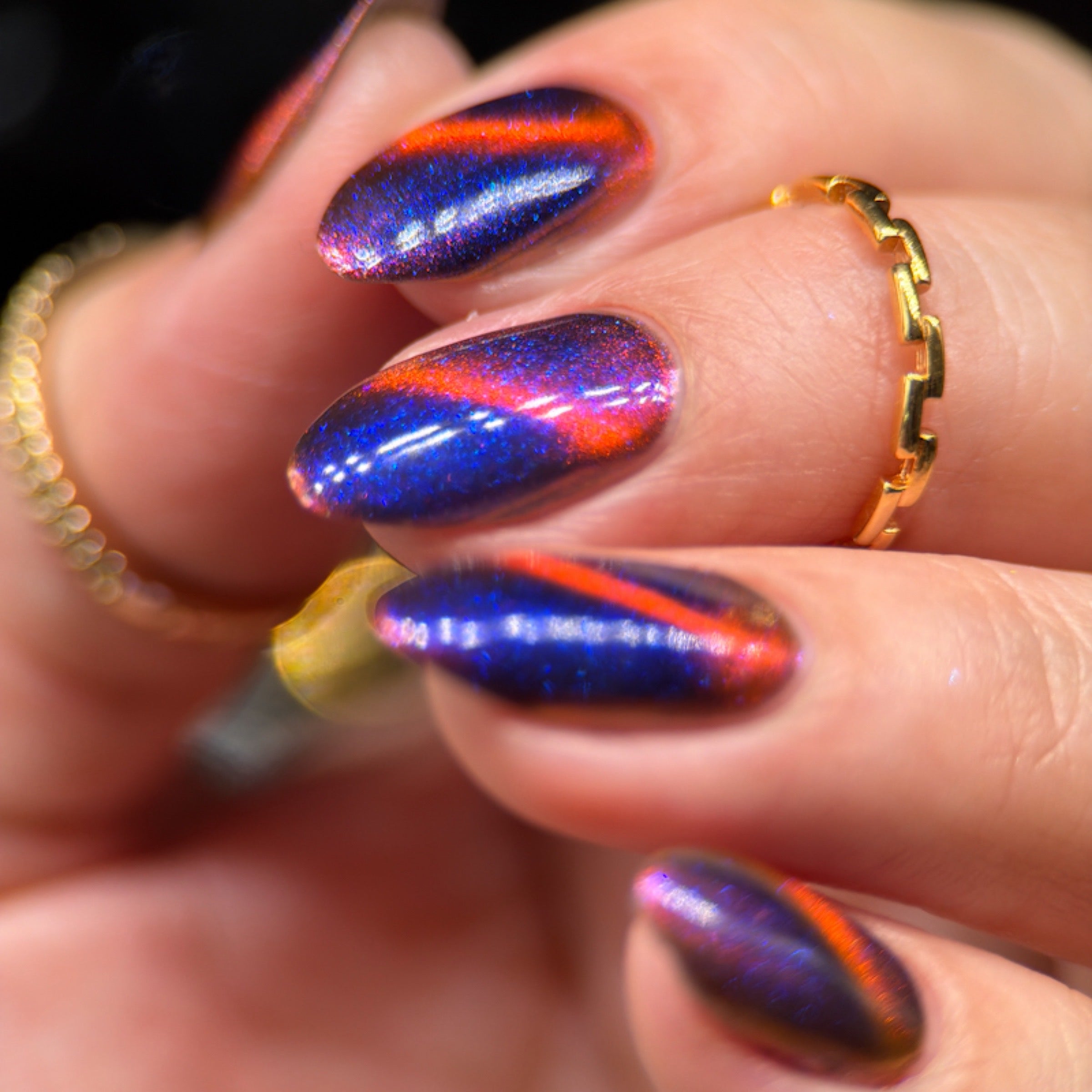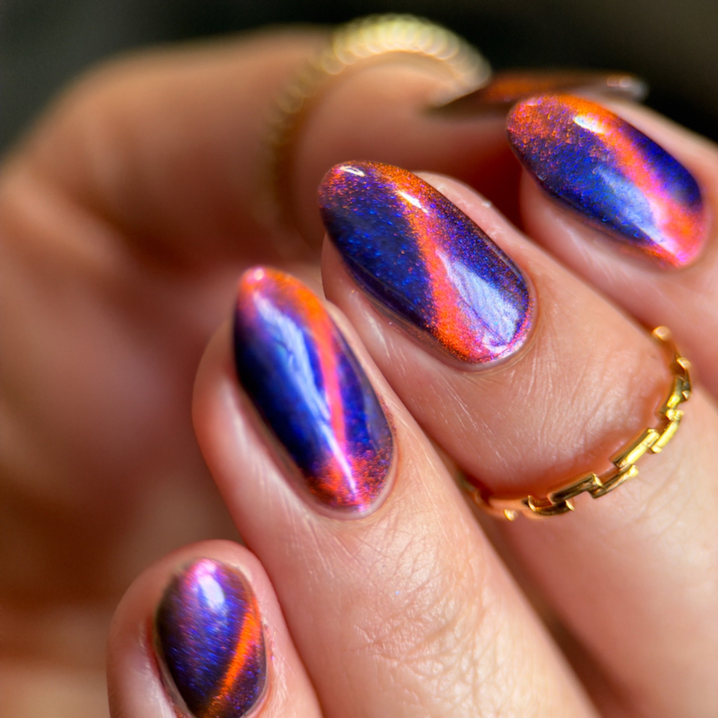 'Perfect Hair' is an ultrachrome magnetic nail polish that shifts through orange/red/green with blue aurora shimmer.