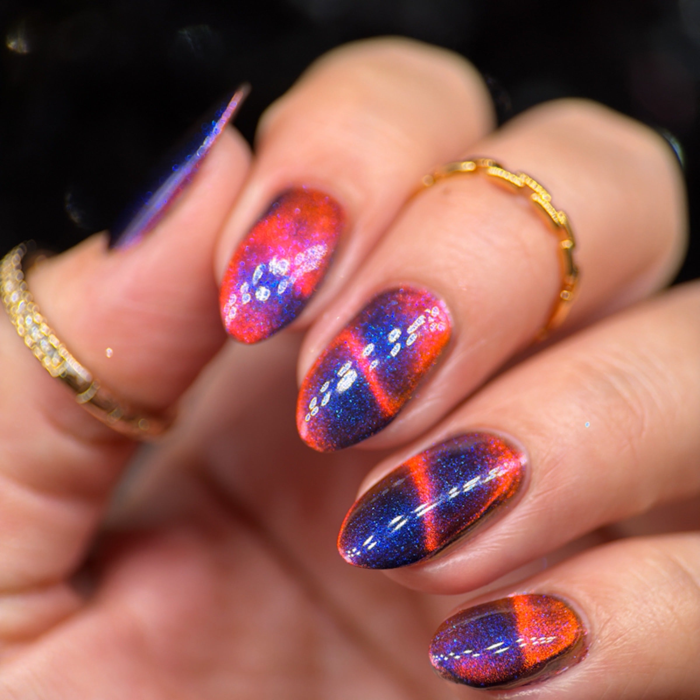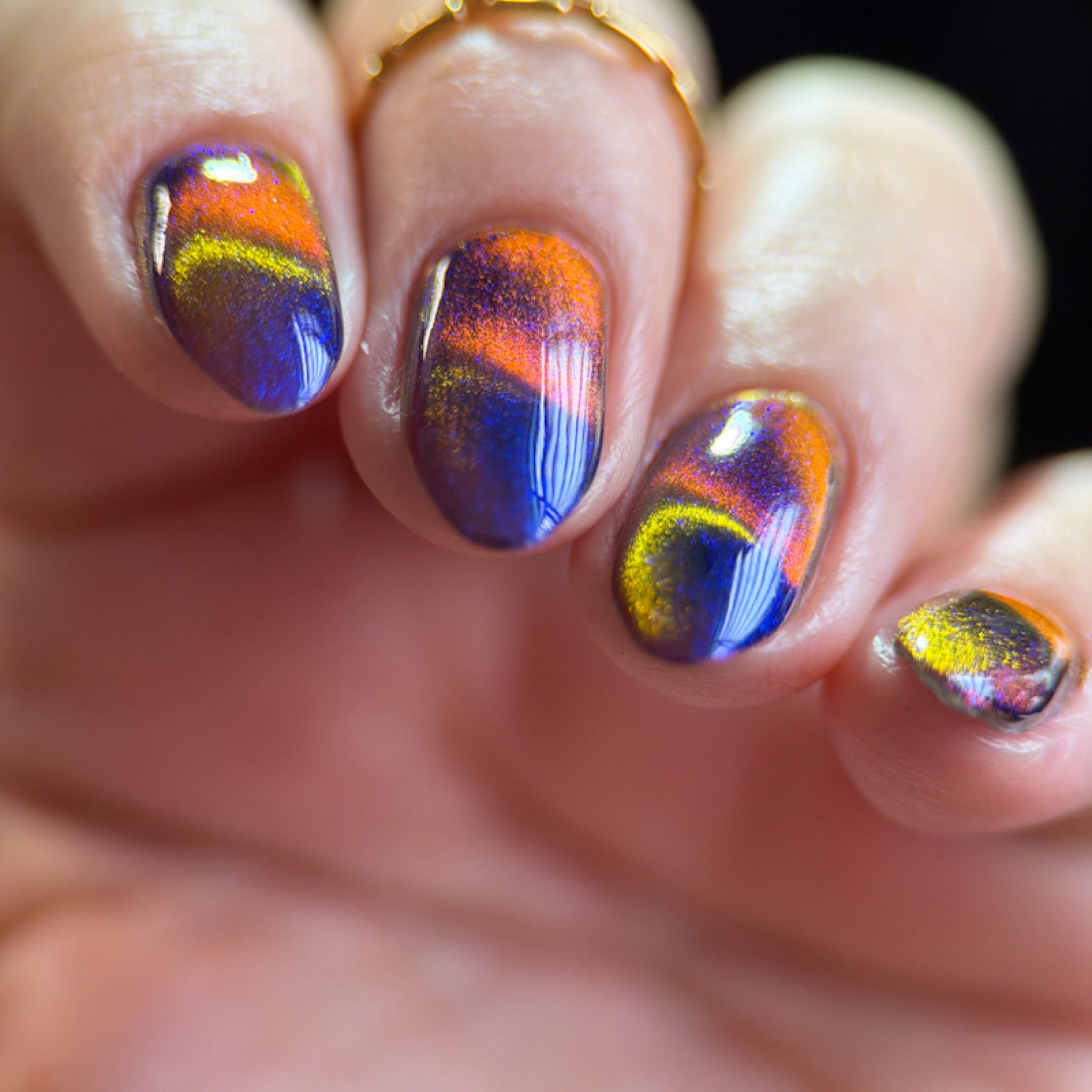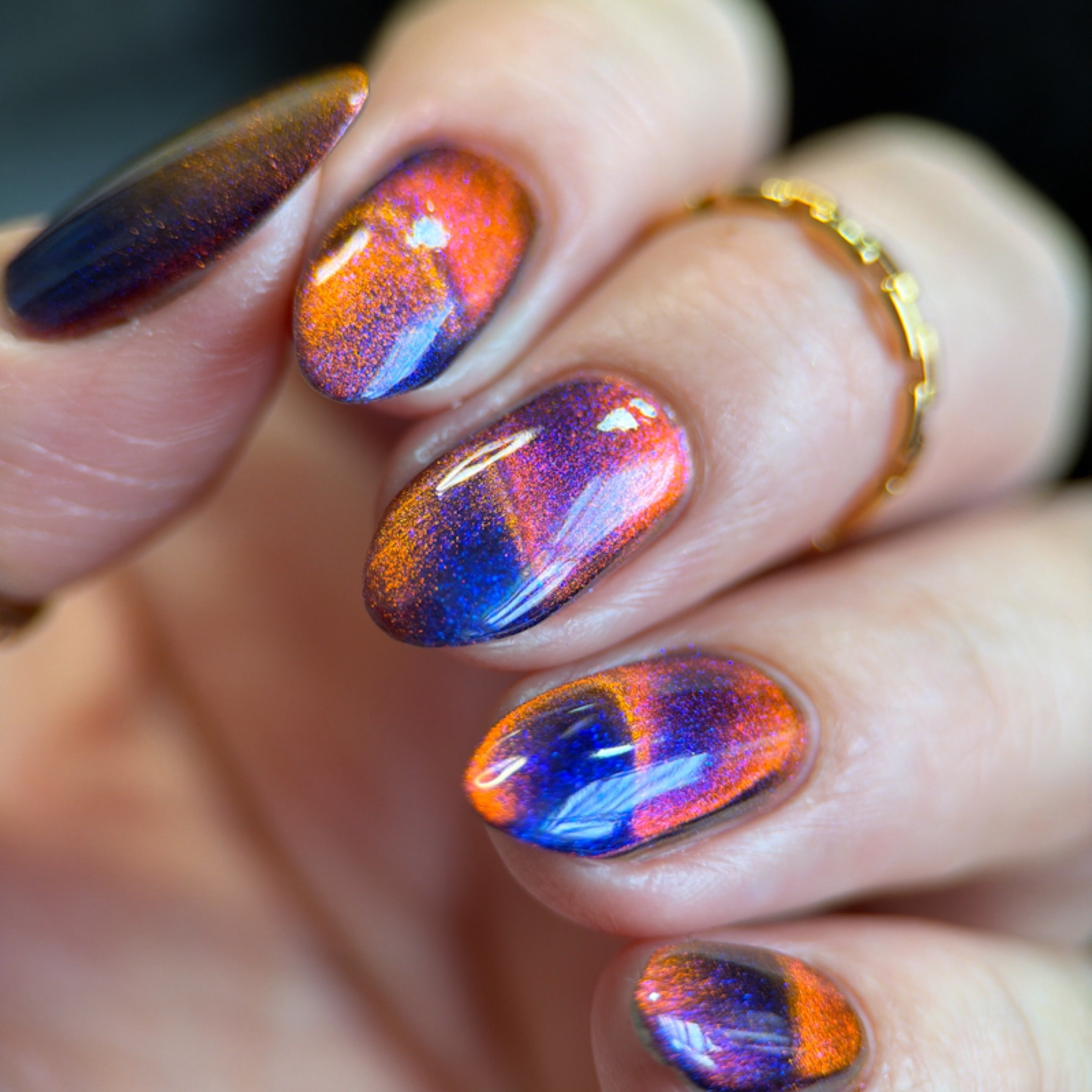 'Perfect Hair' is an ultrachrome magnetic nail polish that shifts through orange/red/green with blue aurora shimmer.