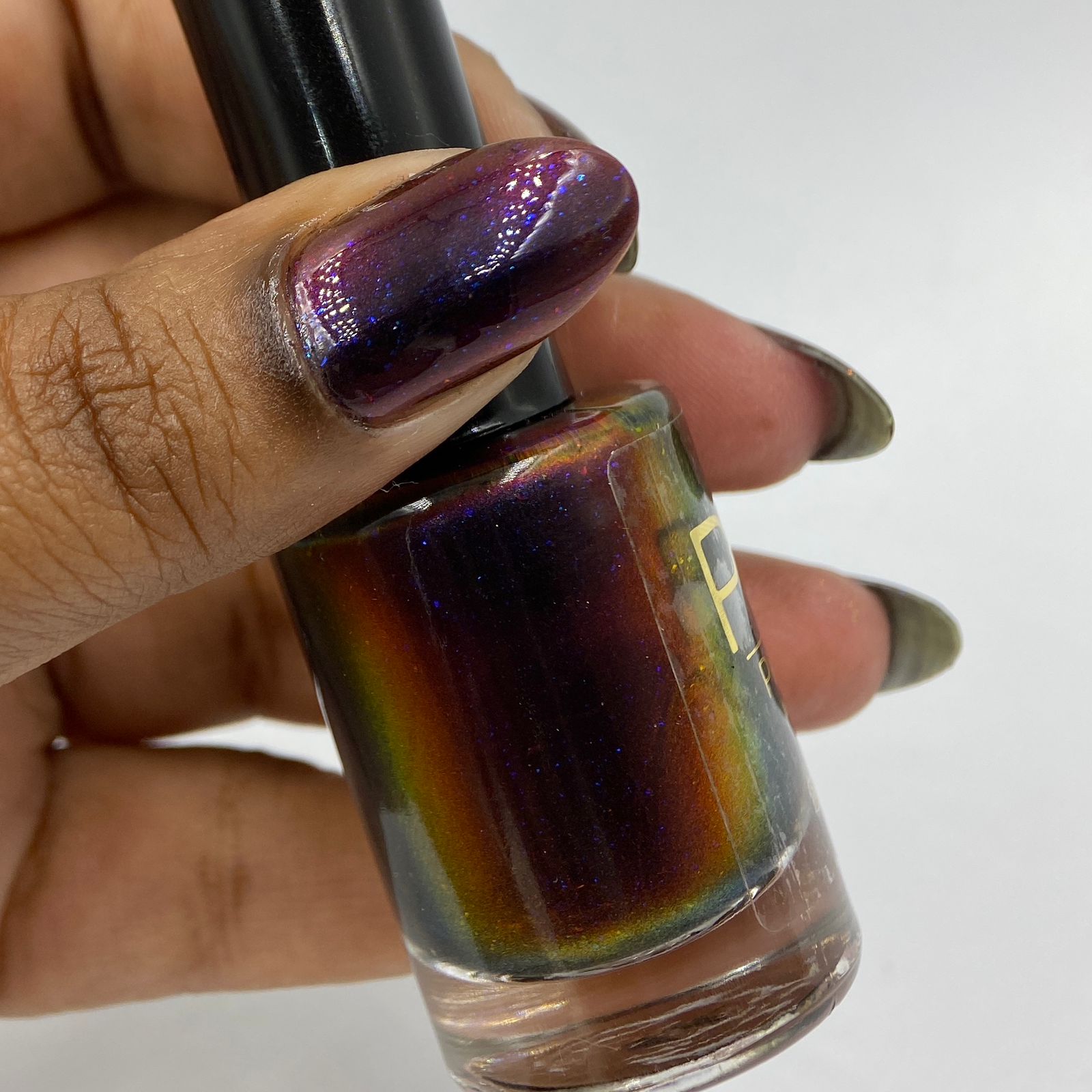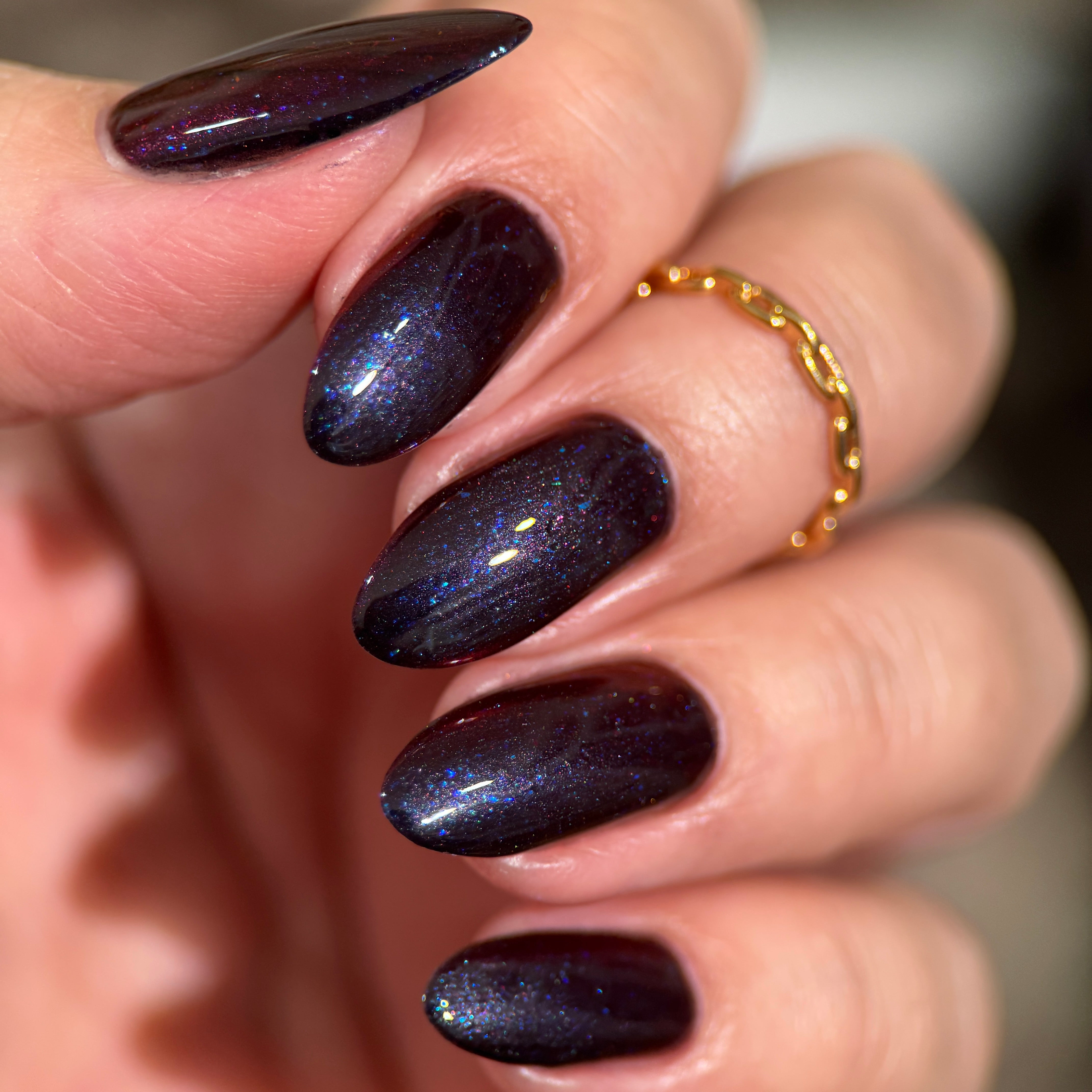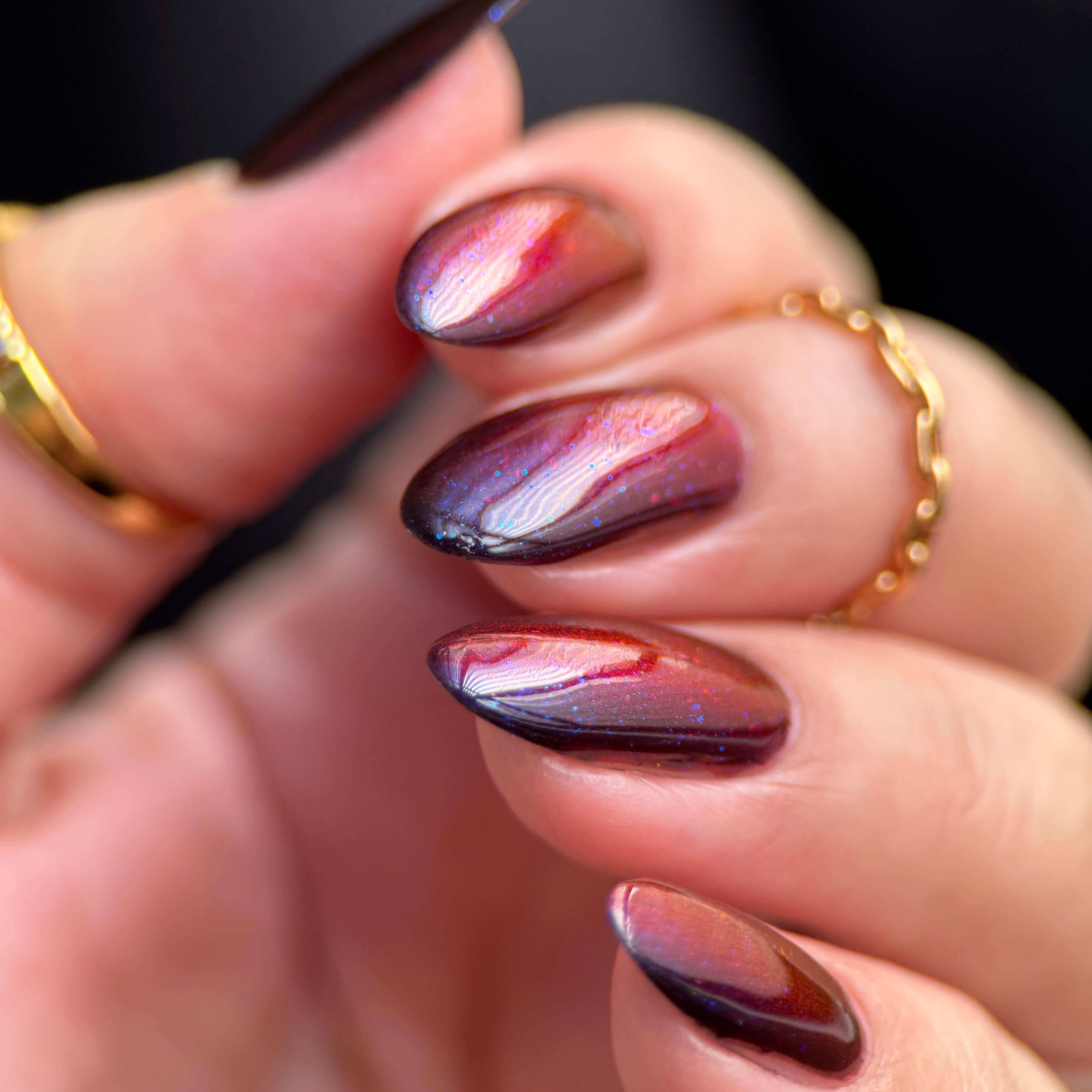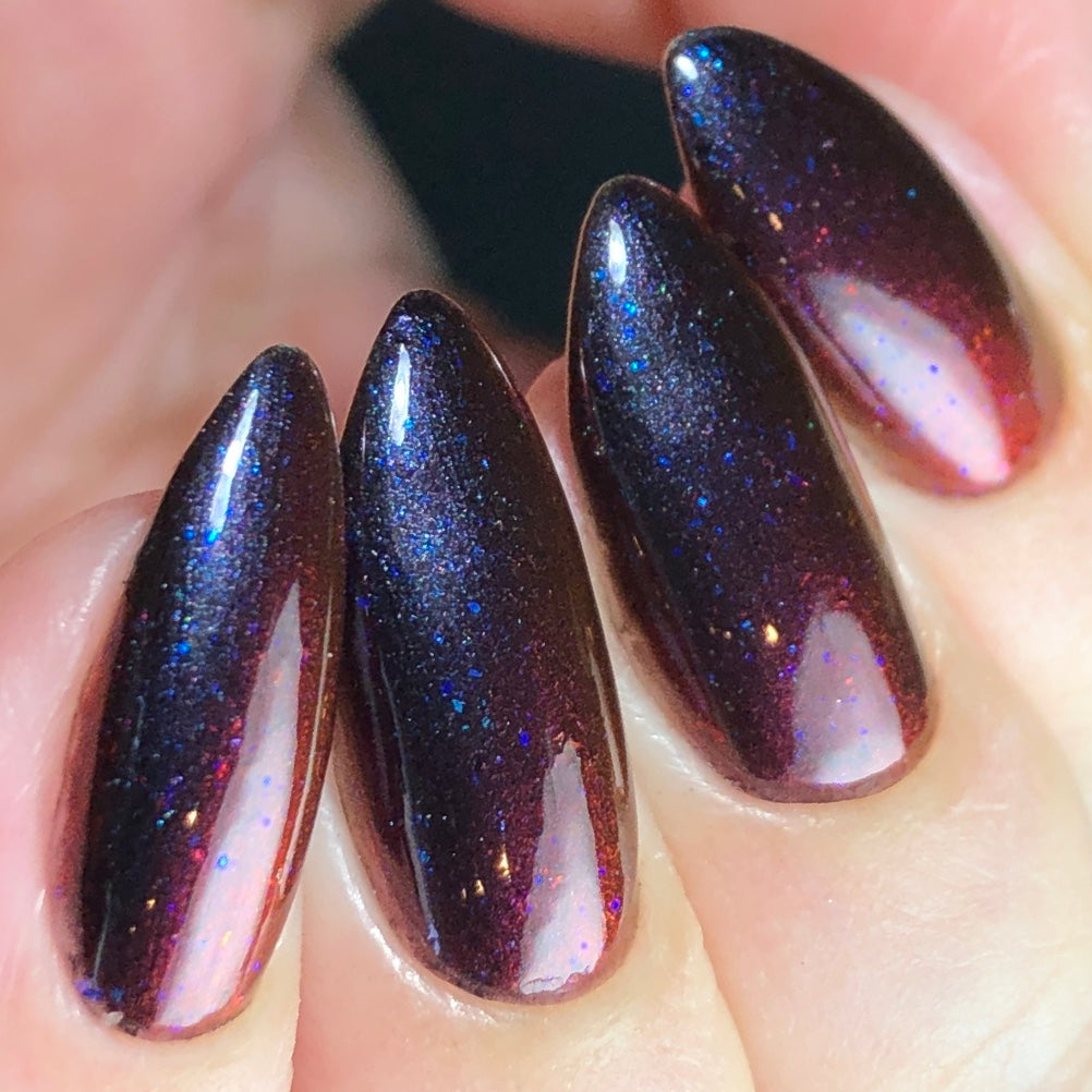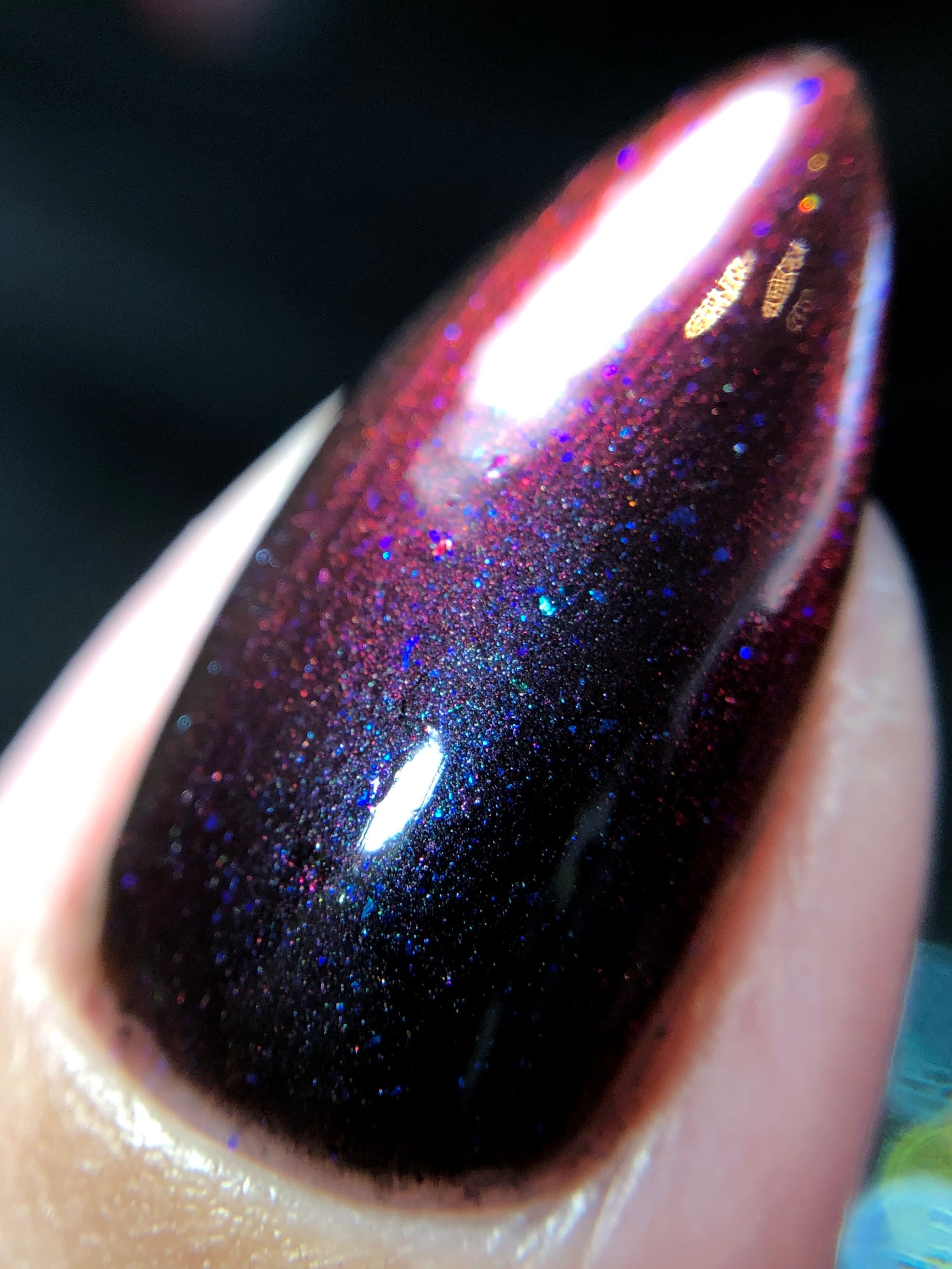 'Hidden Web' has a clear base containing red to black multichrome pigment and micro flakies, as well as blue aurora shimmer and micro flakies. Inspired by Webstor.