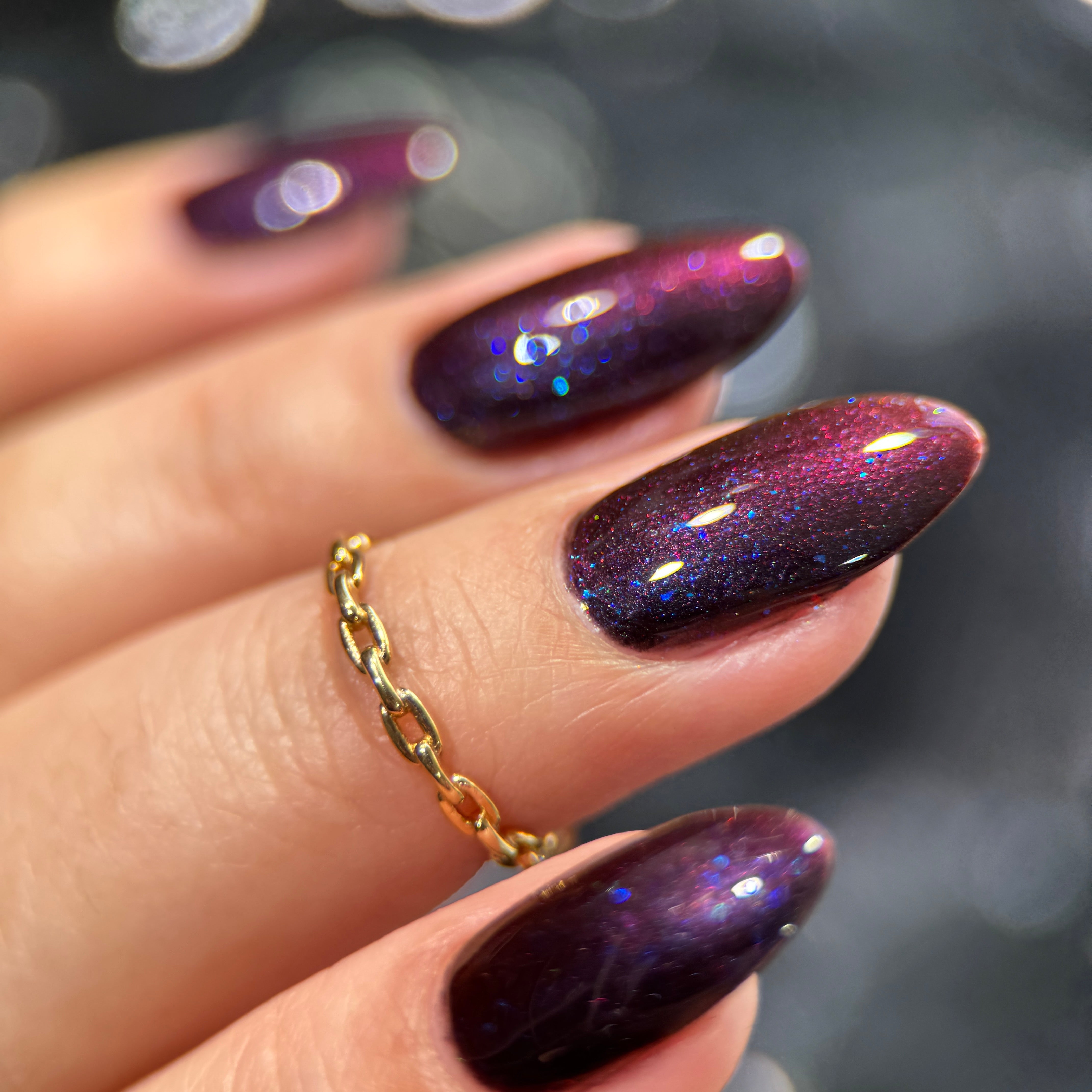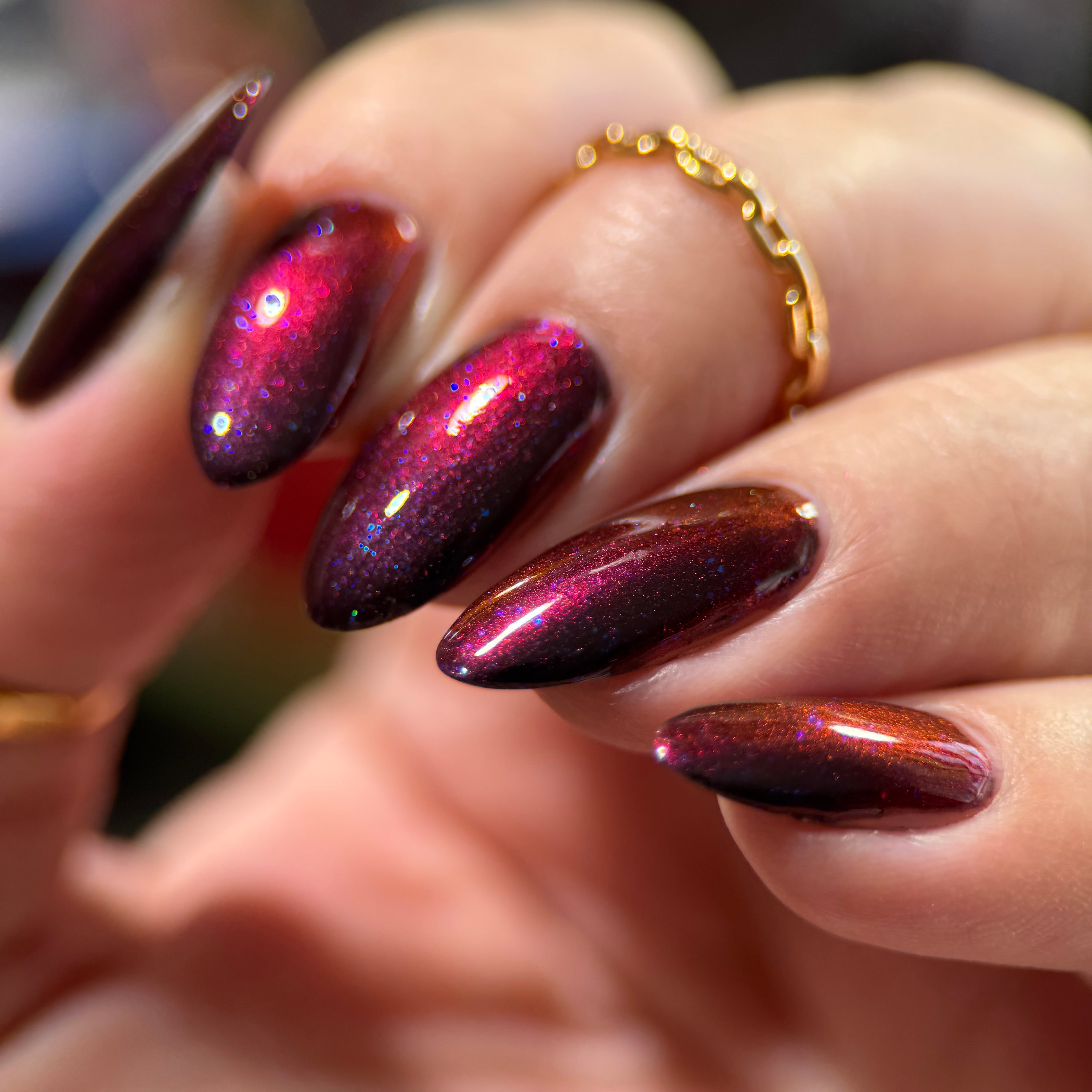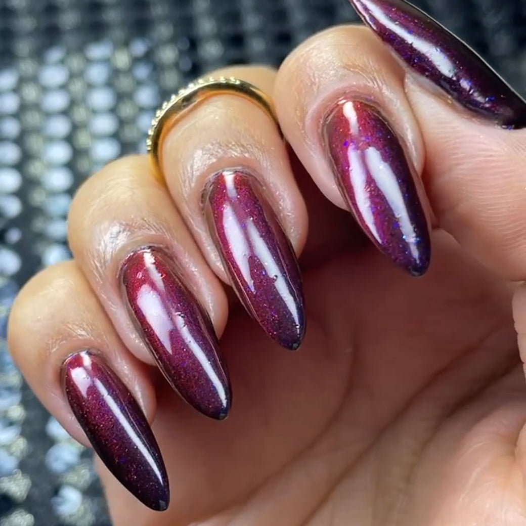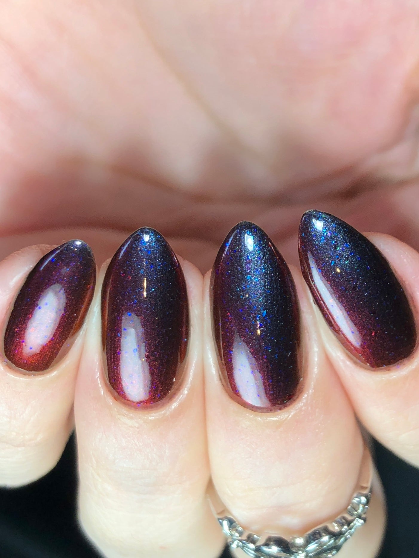 'Hidden Web' has a clear base containing red to black multichrome pigment and micro flakies, as well as blue aurora shimmer and micro flakies. Inspired by Webstor.