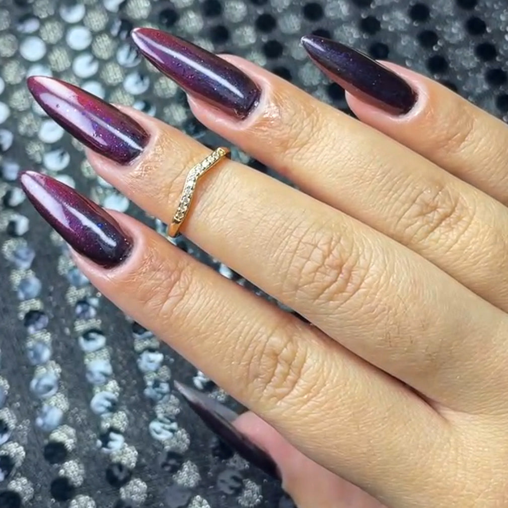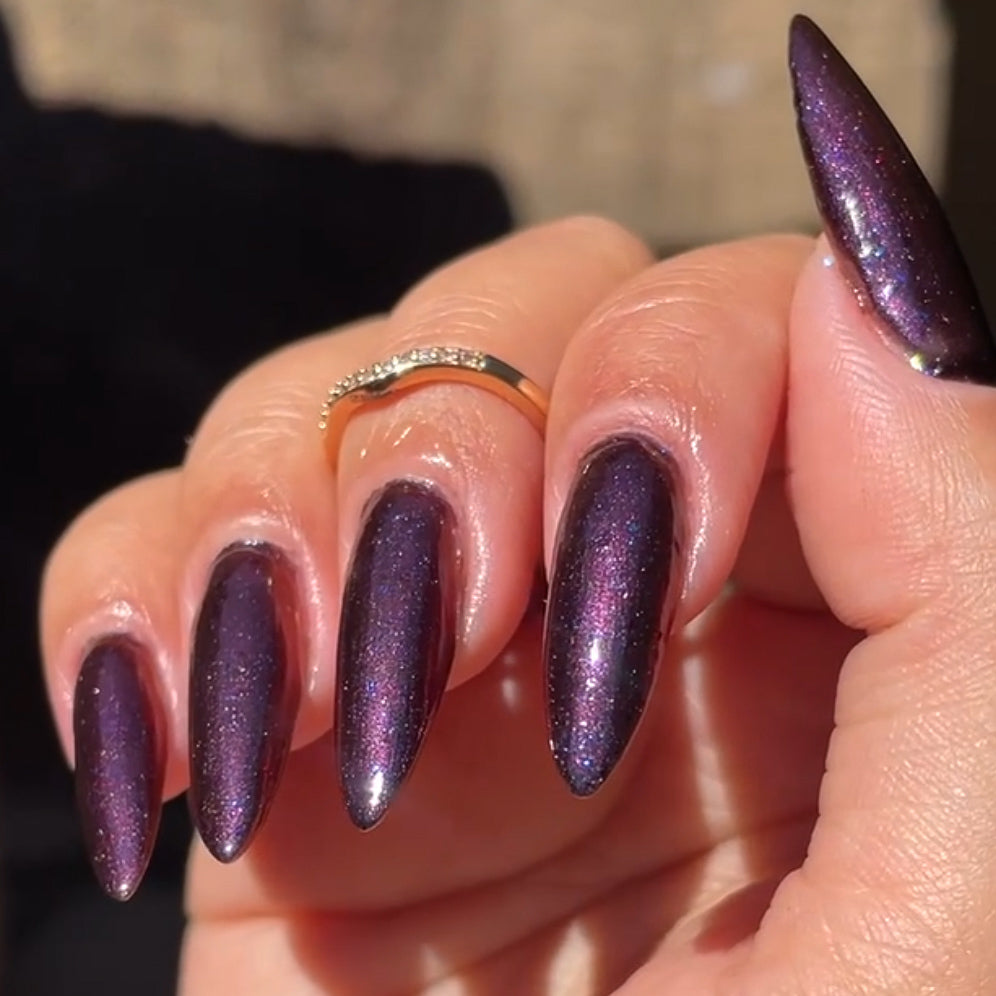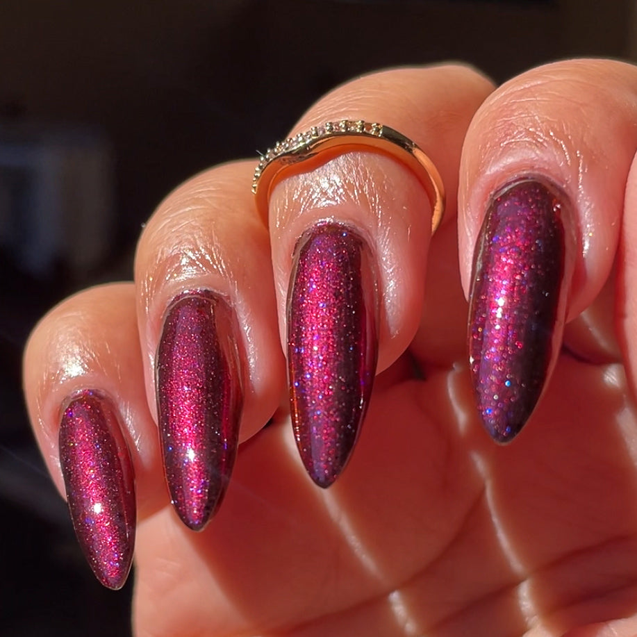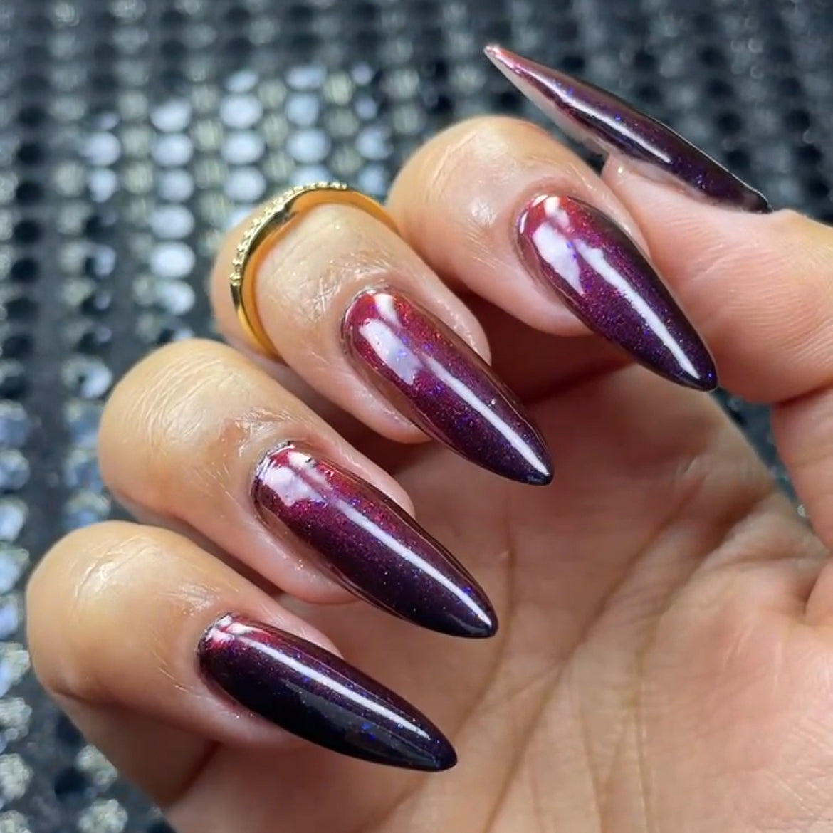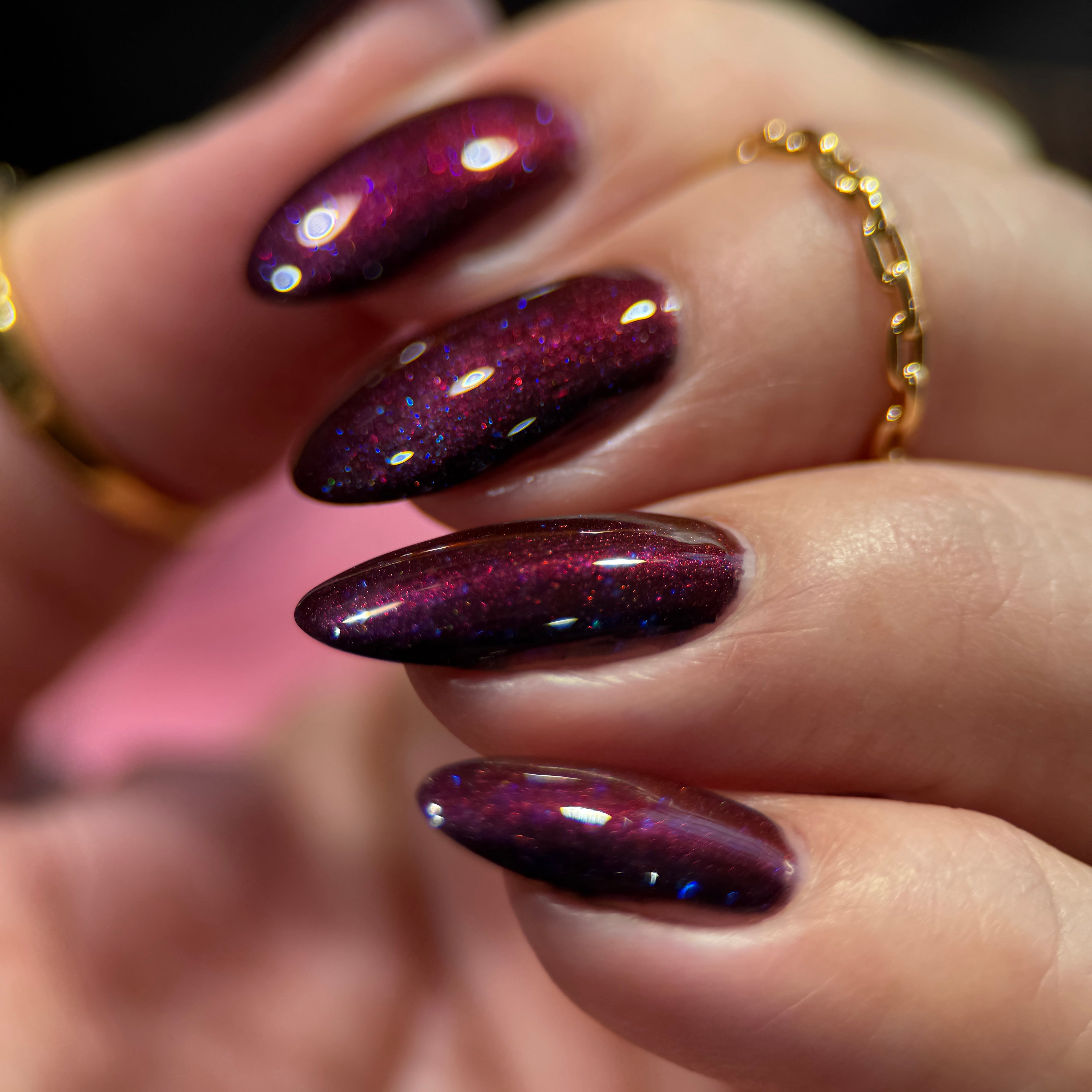 'Hidden Web' has a clear base containing red to black multichrome pigment and micro flakies, as well as blue aurora shimmer and micro flakies. Inspired by Webstor.