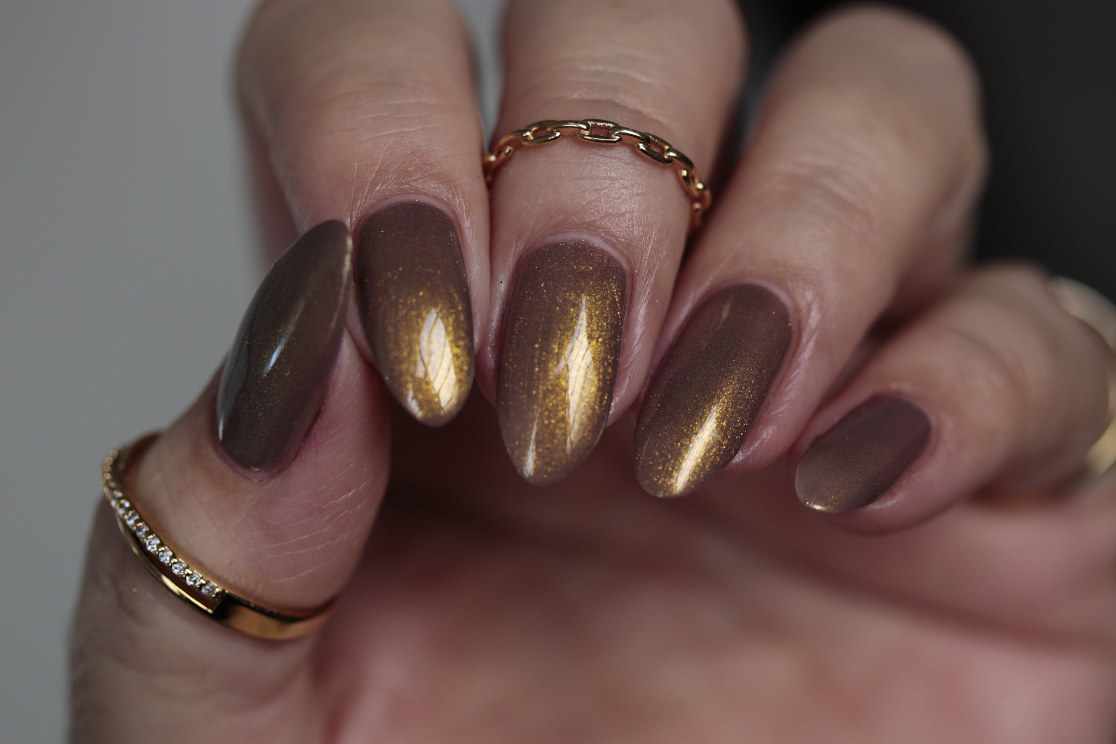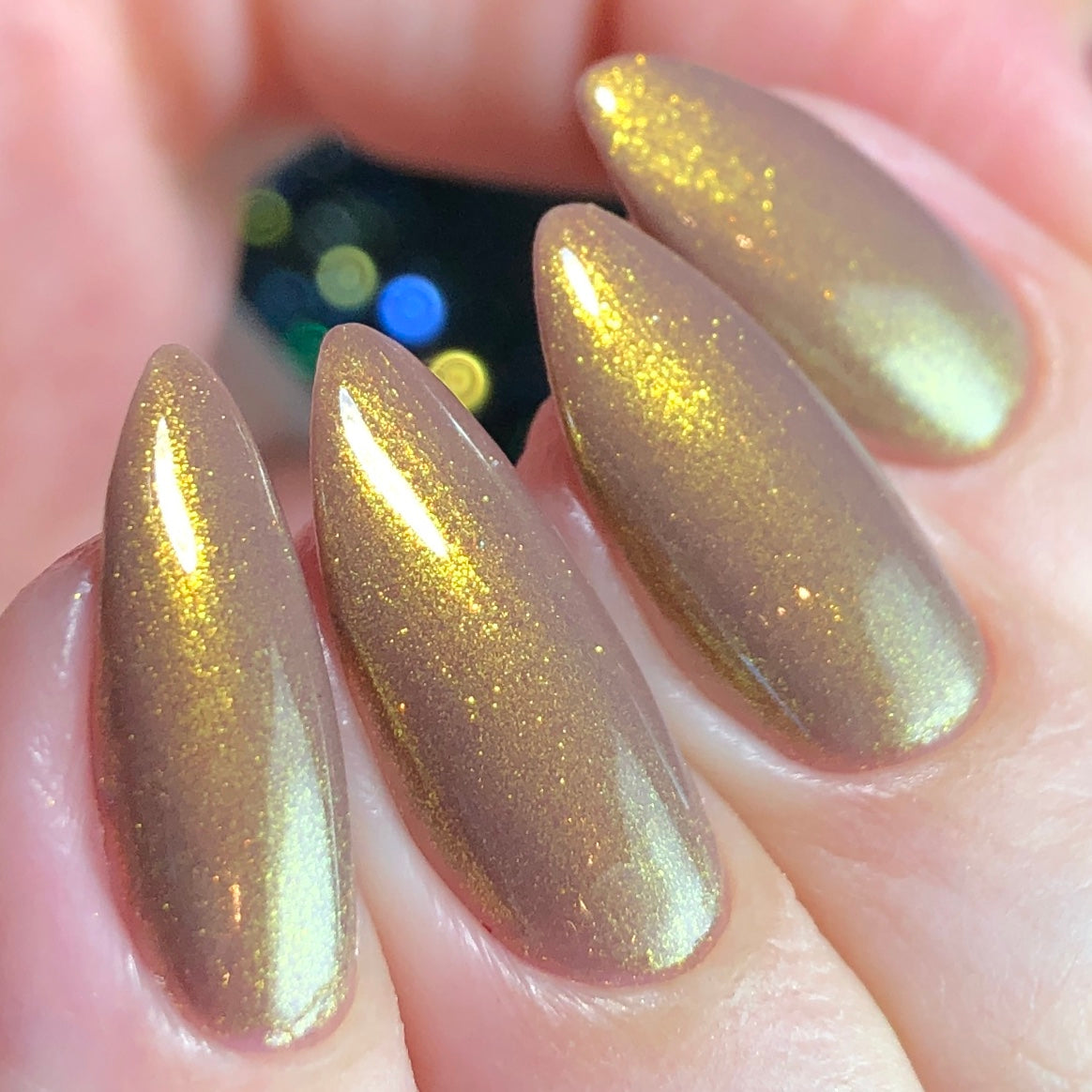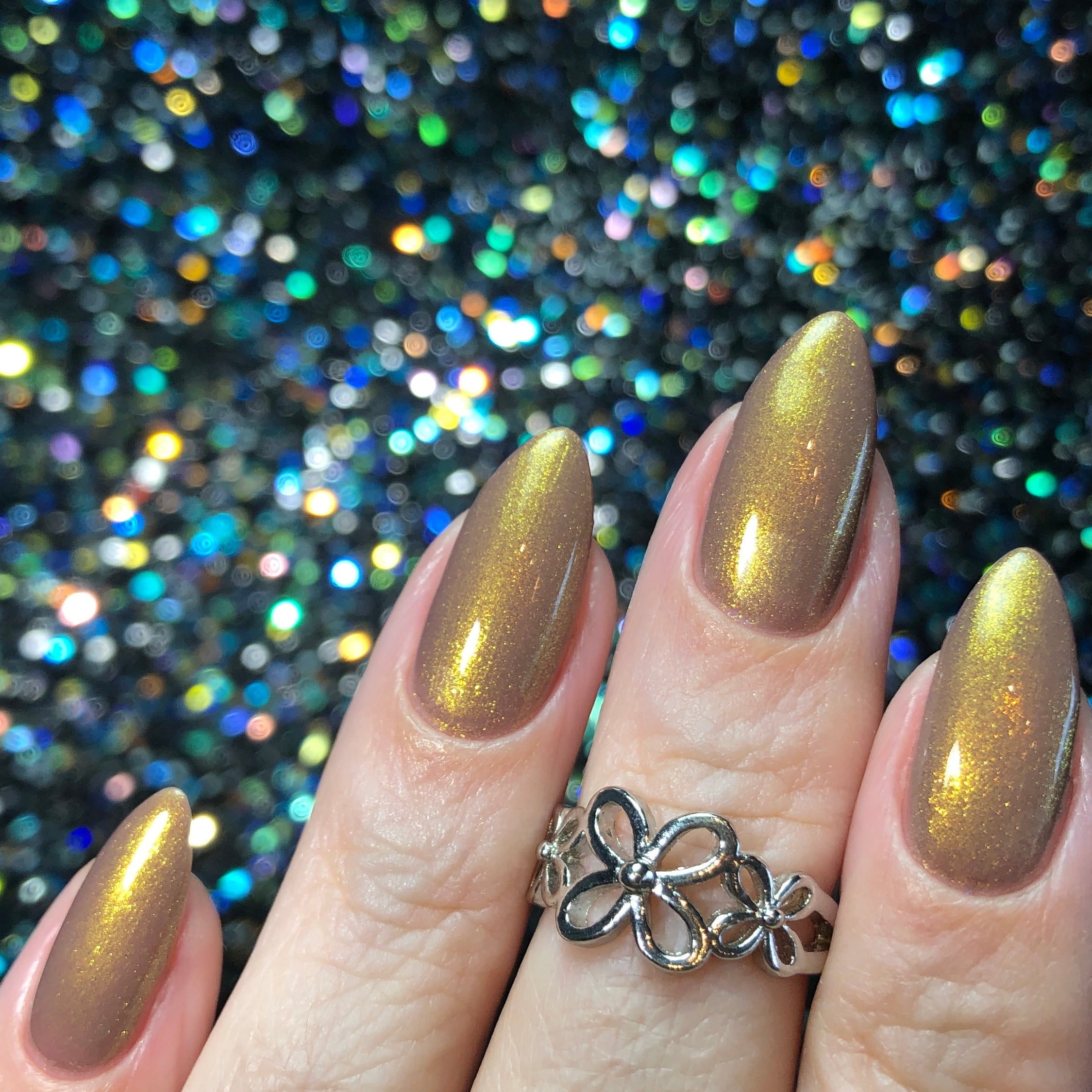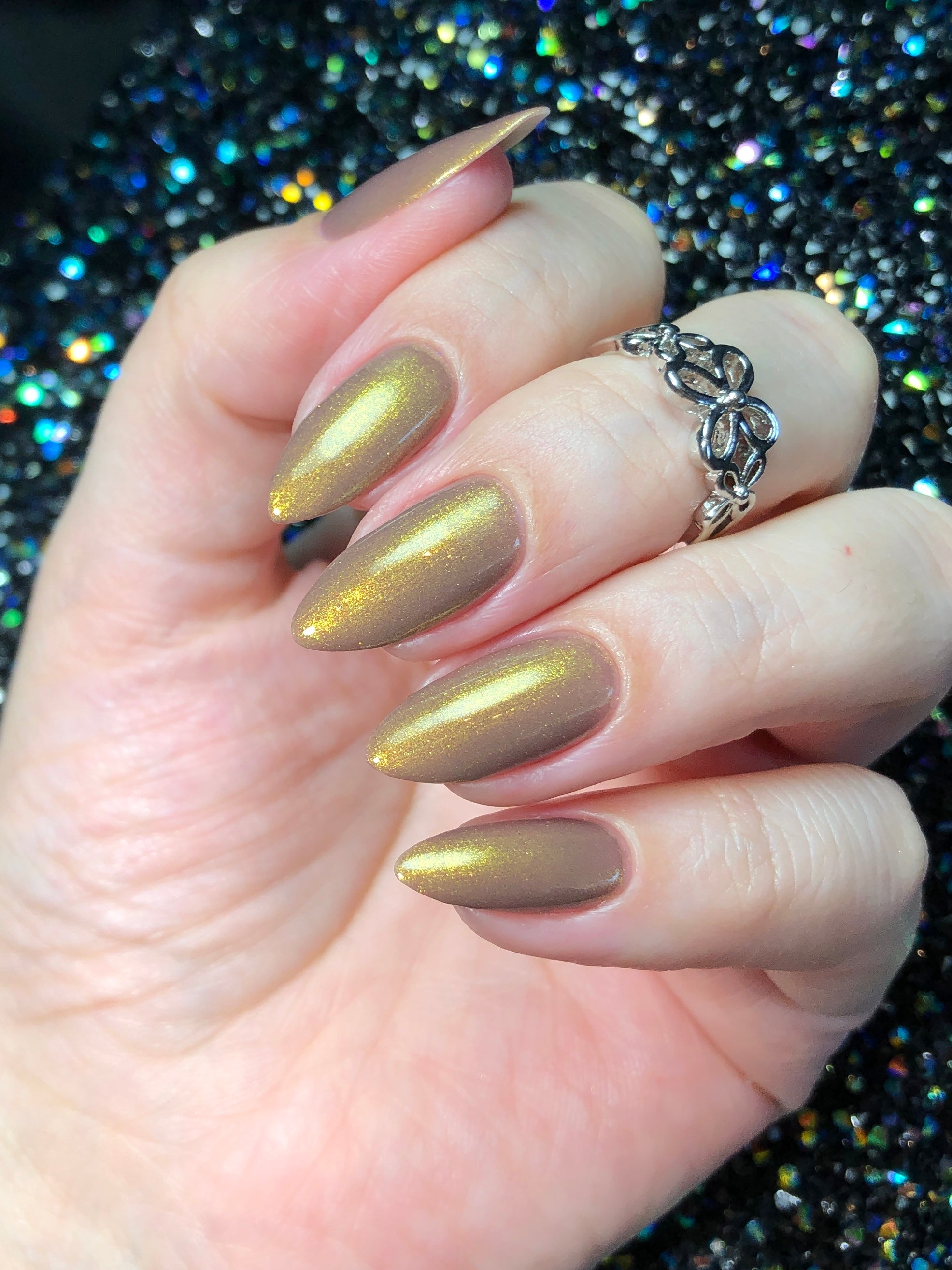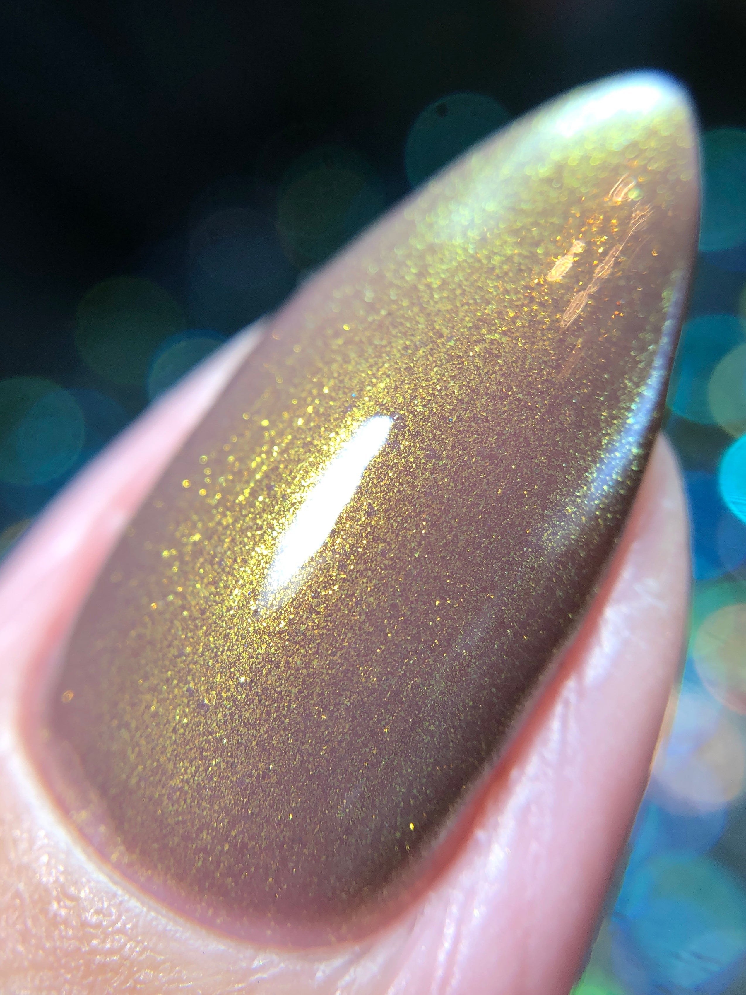 'Oracle's Heir' is a brown jelly nail polish with gold to green aurora shimmer. Inspired by Teela.