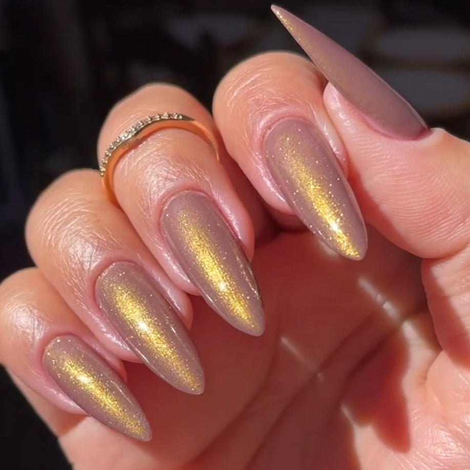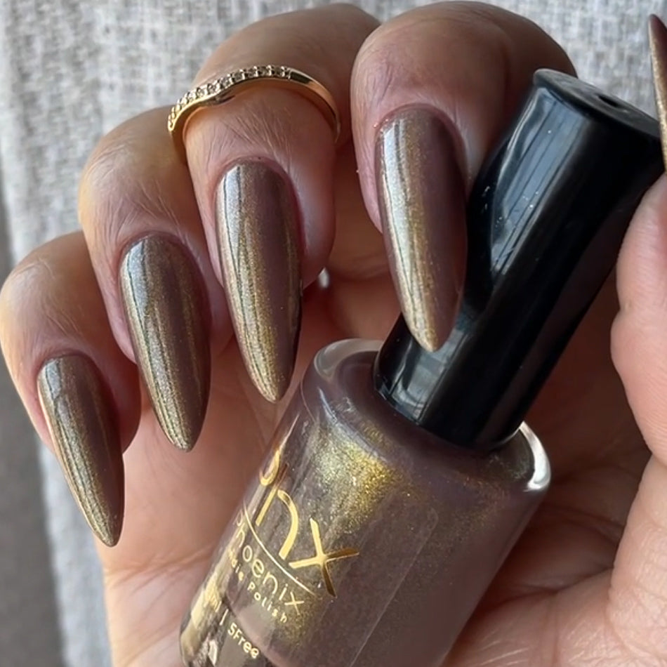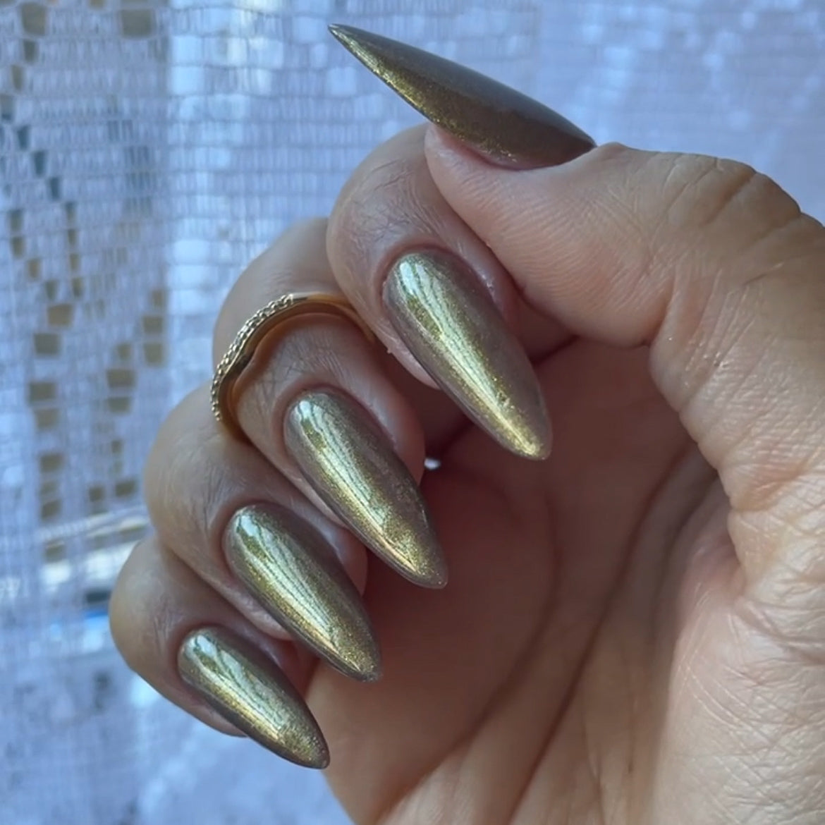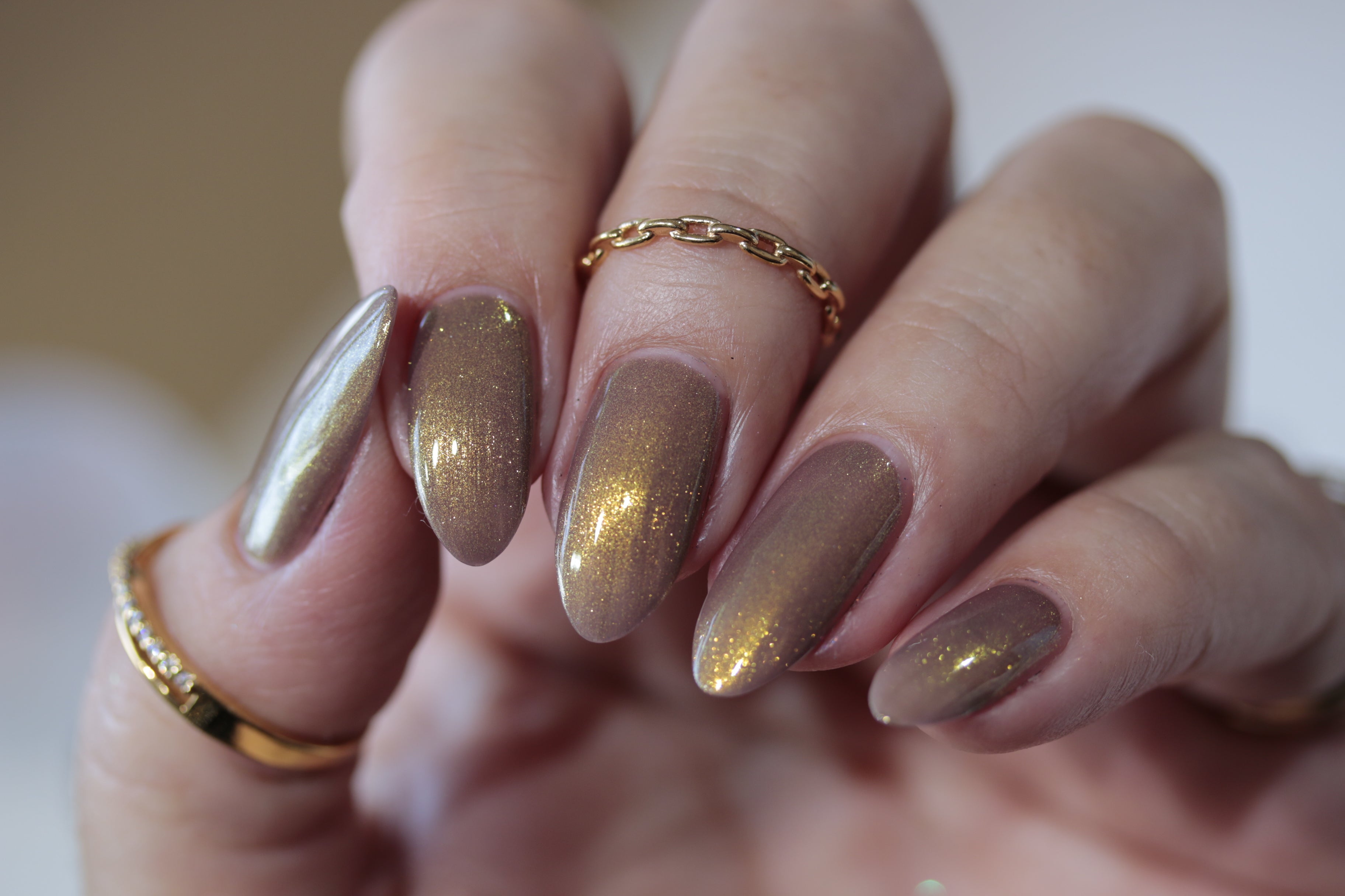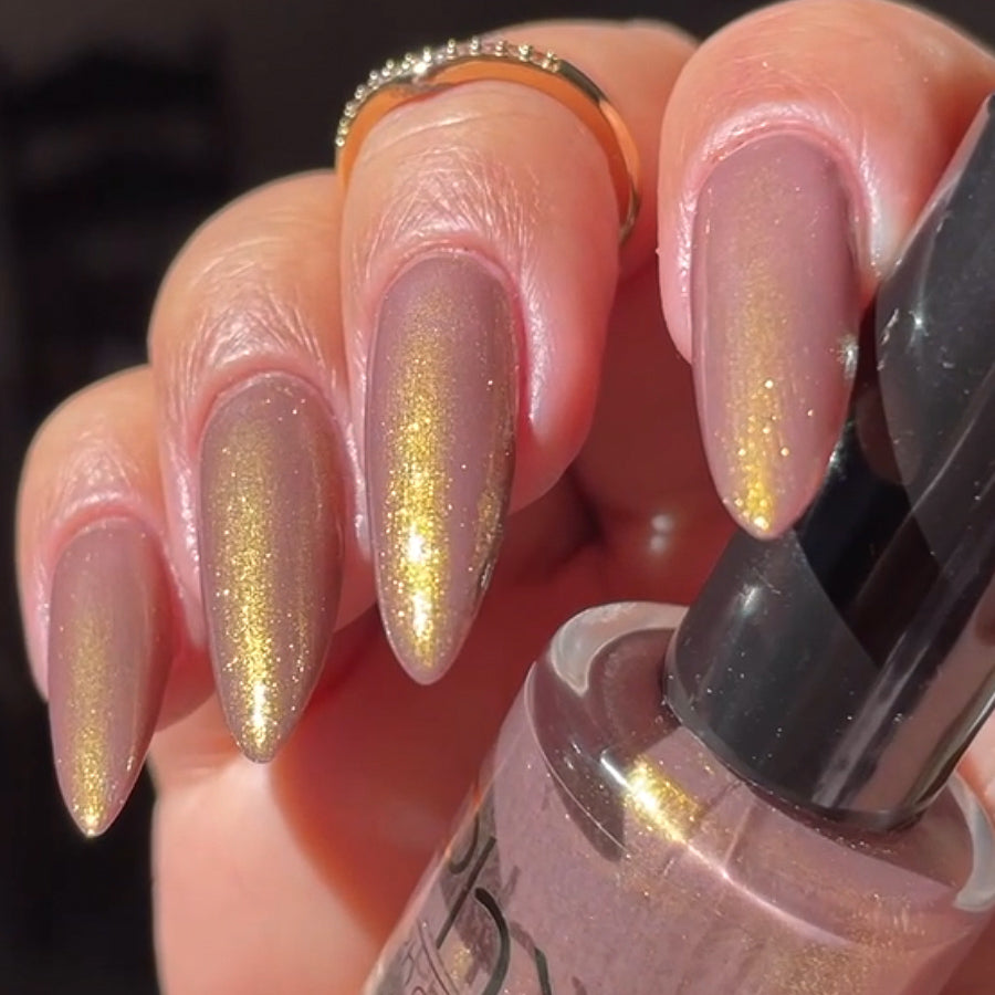 'Oracle's Heir' is a brown jelly nail polish with gold to green aurora shimmer. Inspired by Teela.