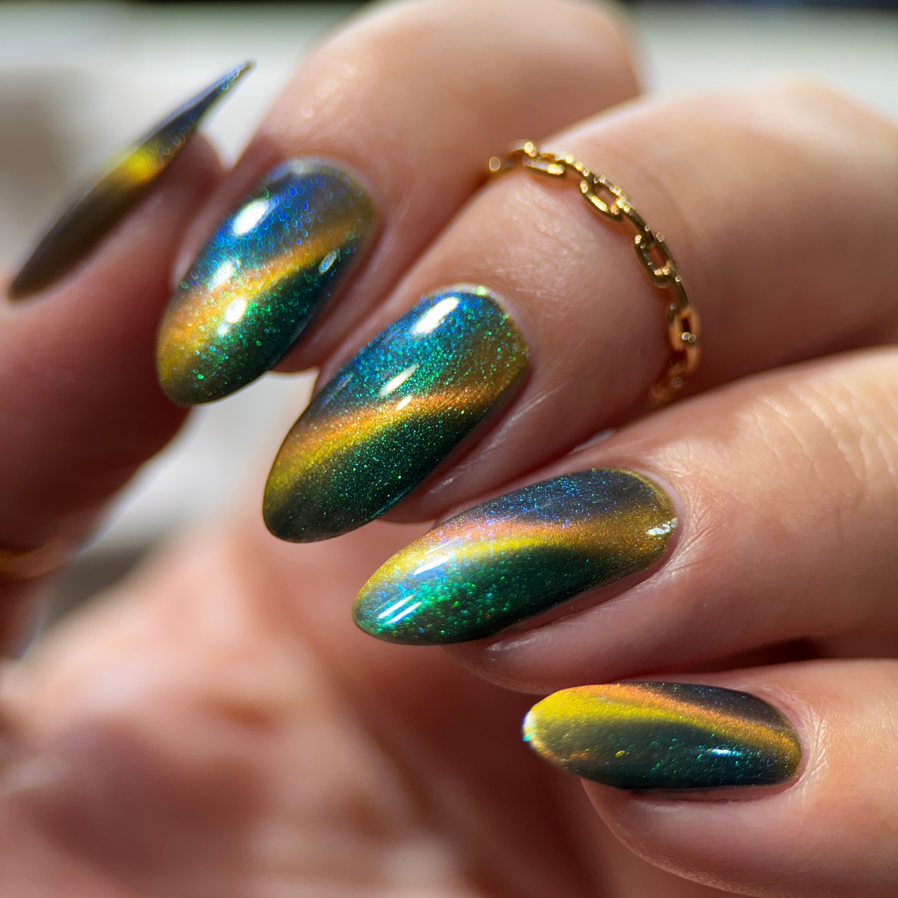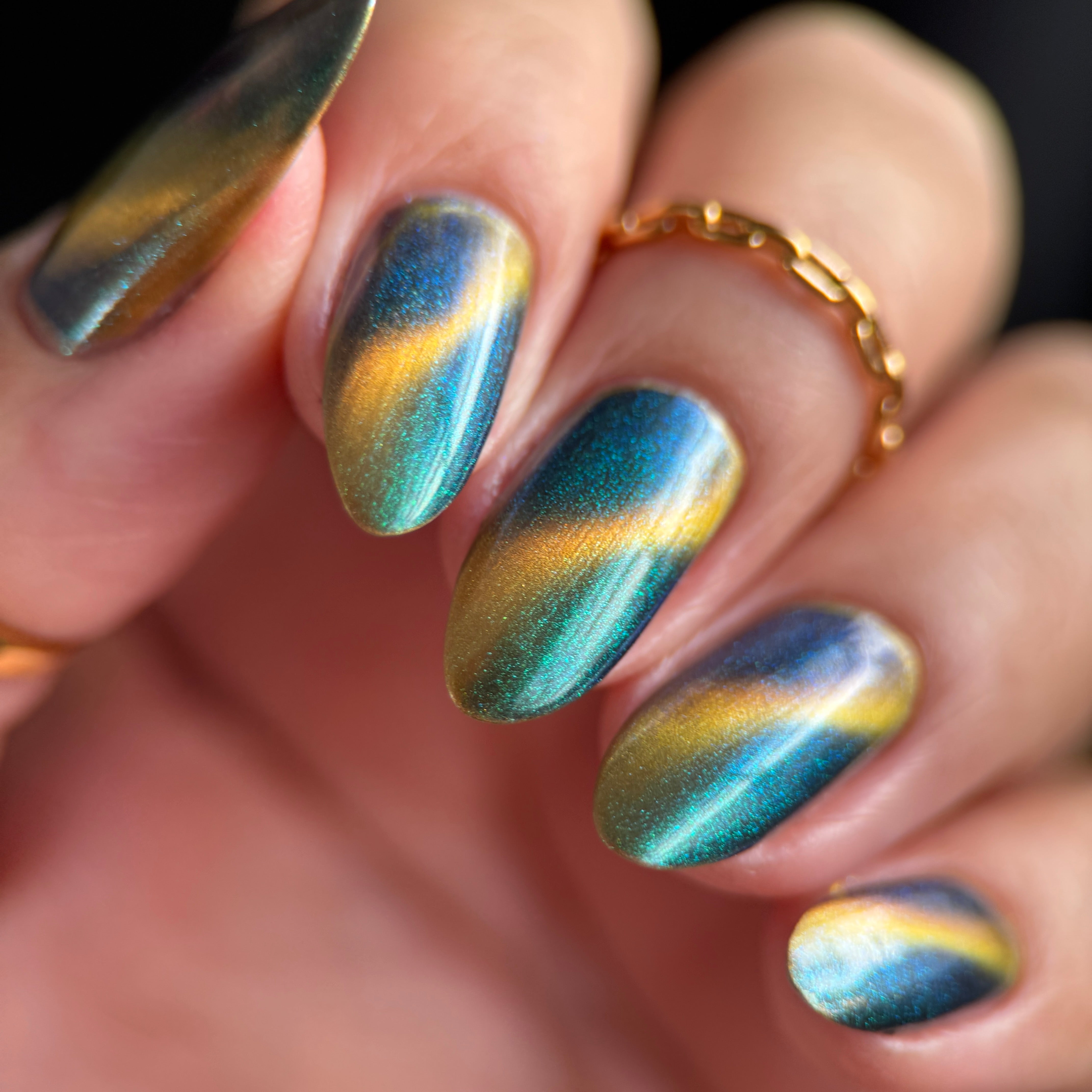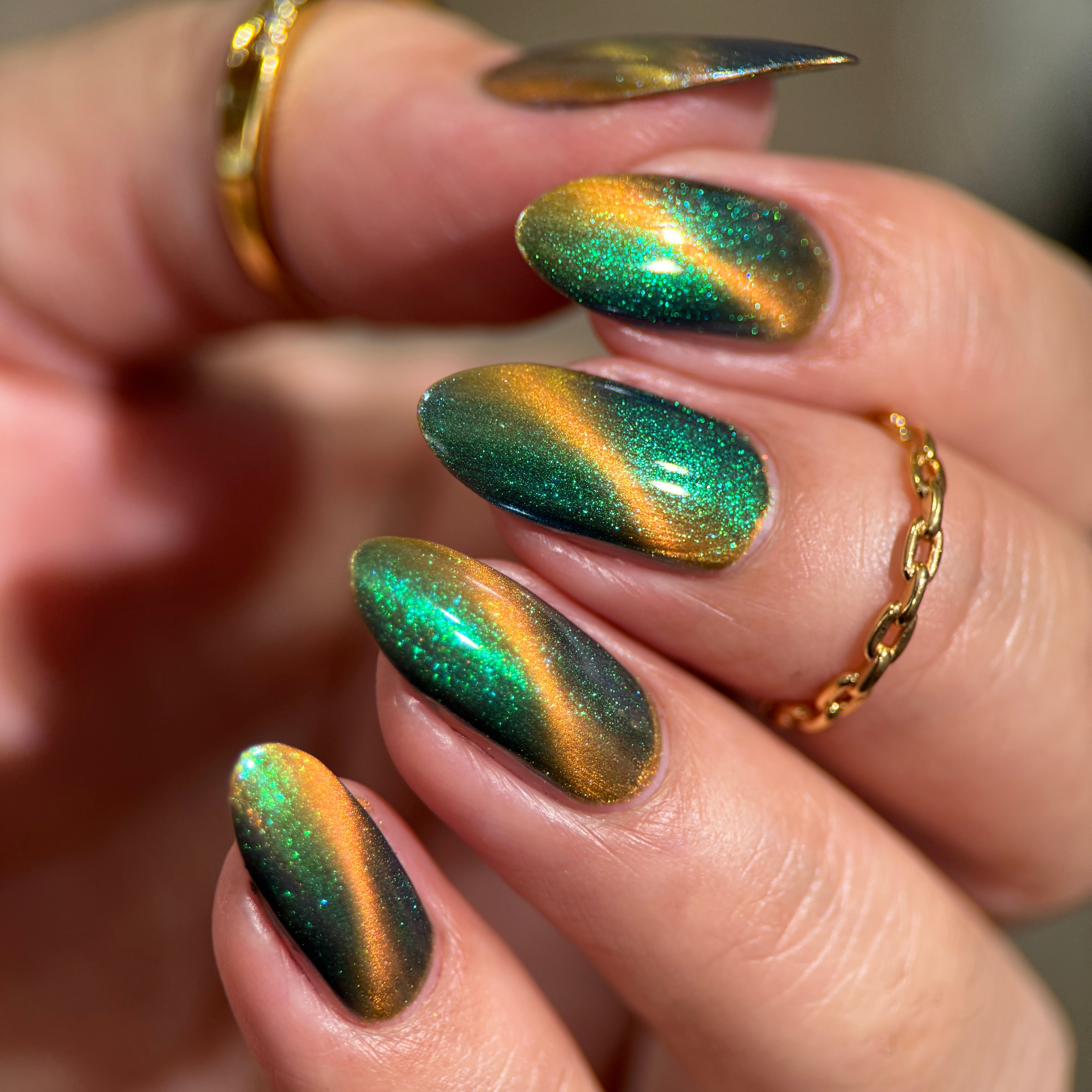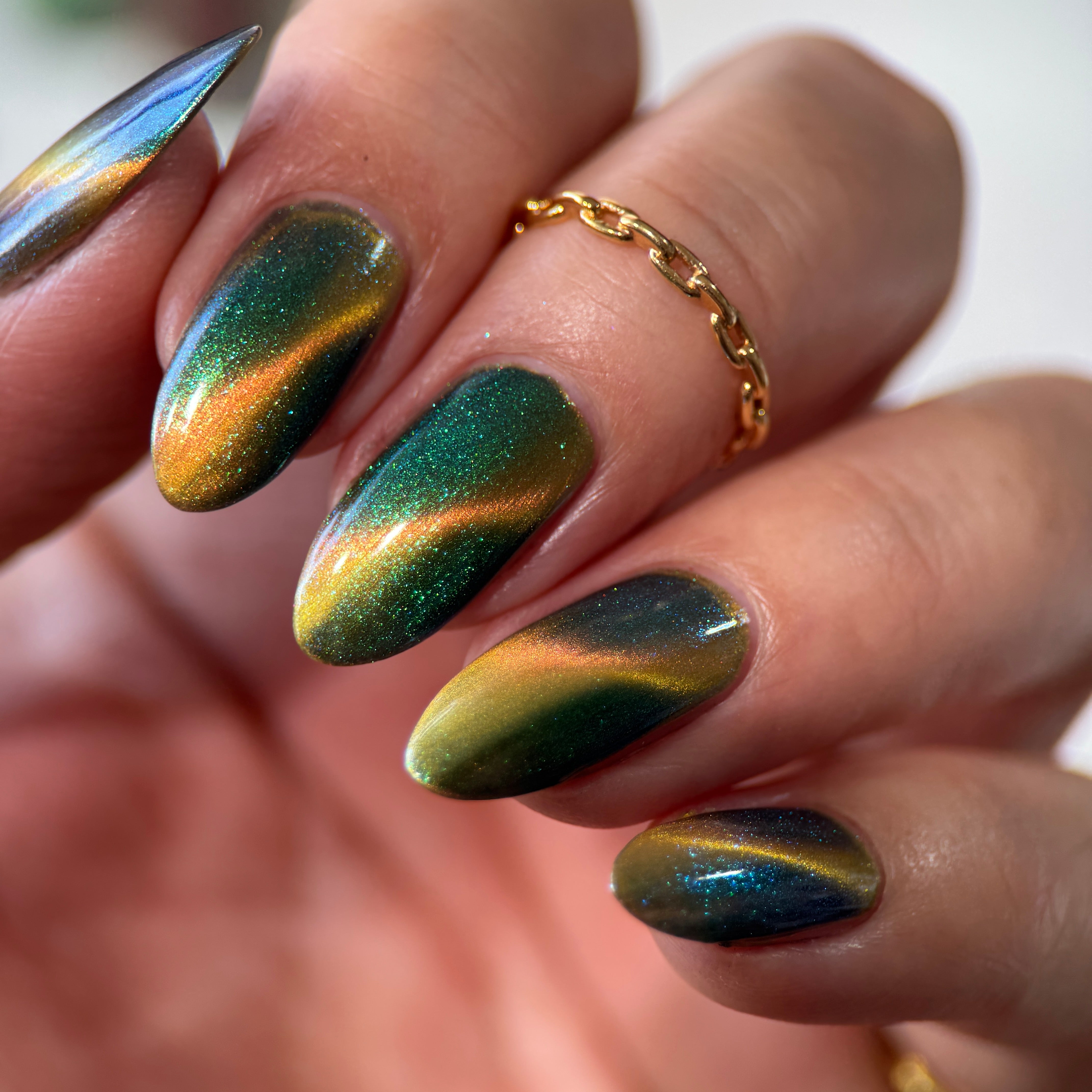 'Secret Arsenal' is a gold/orange magnetic nail polish with green to purple to turquoise aurora shimmer. Inspired by Man-At-Arms.