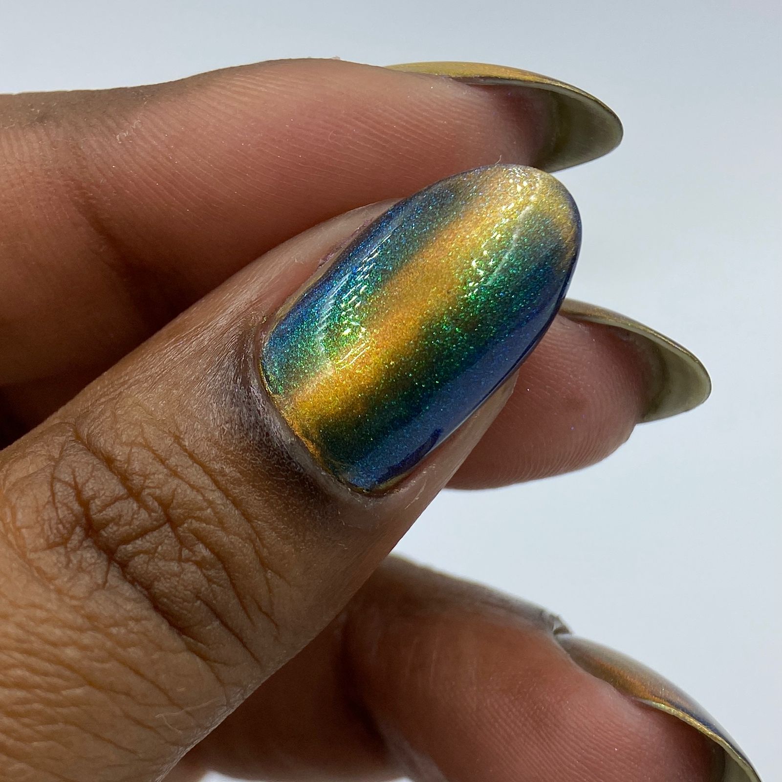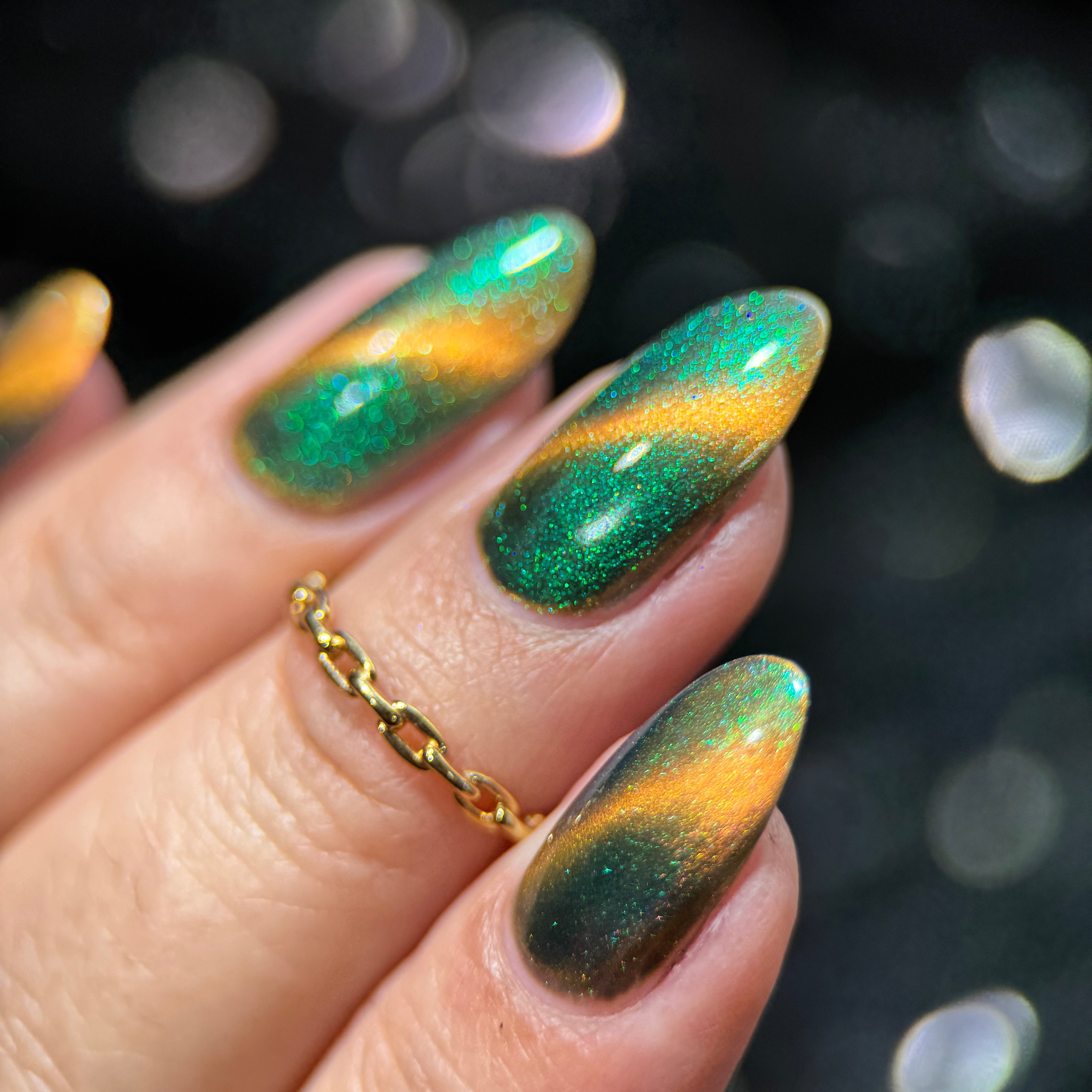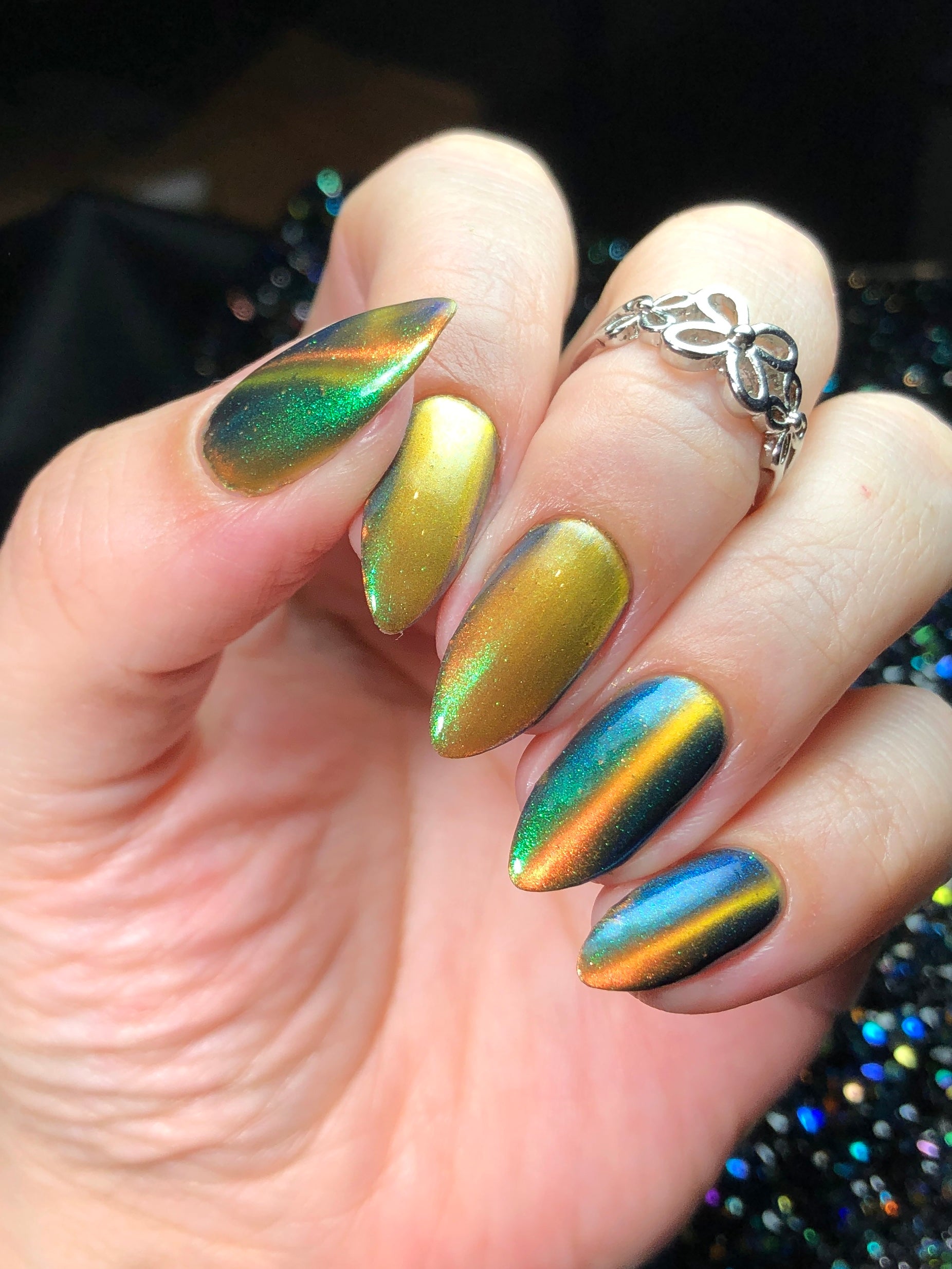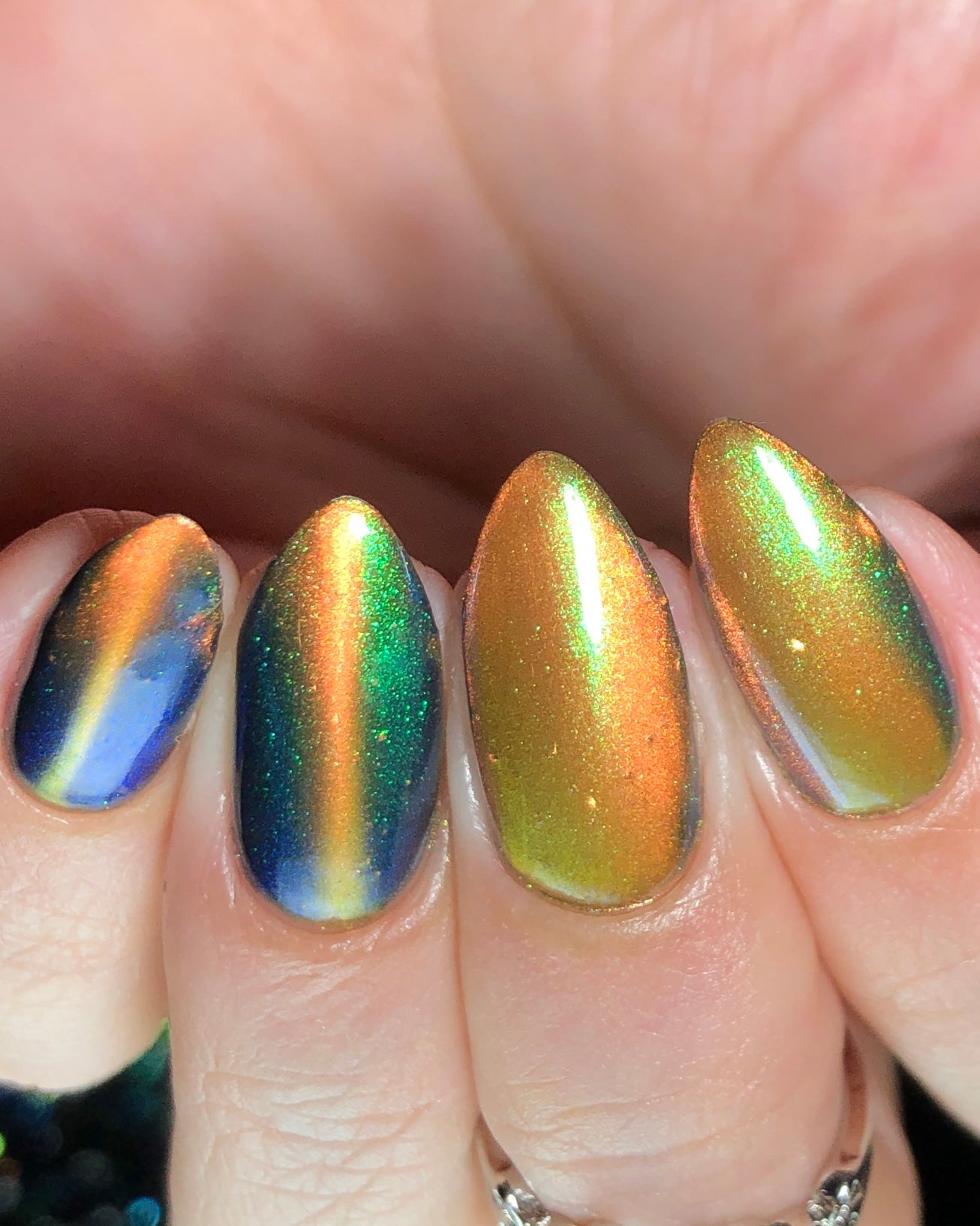 'Secret Arsenal' is a gold/orange magnetic nail polish with green to purple to turquoise aurora shimmer. Inspired by Man-At-Arms.