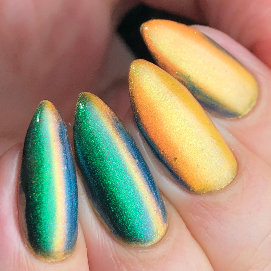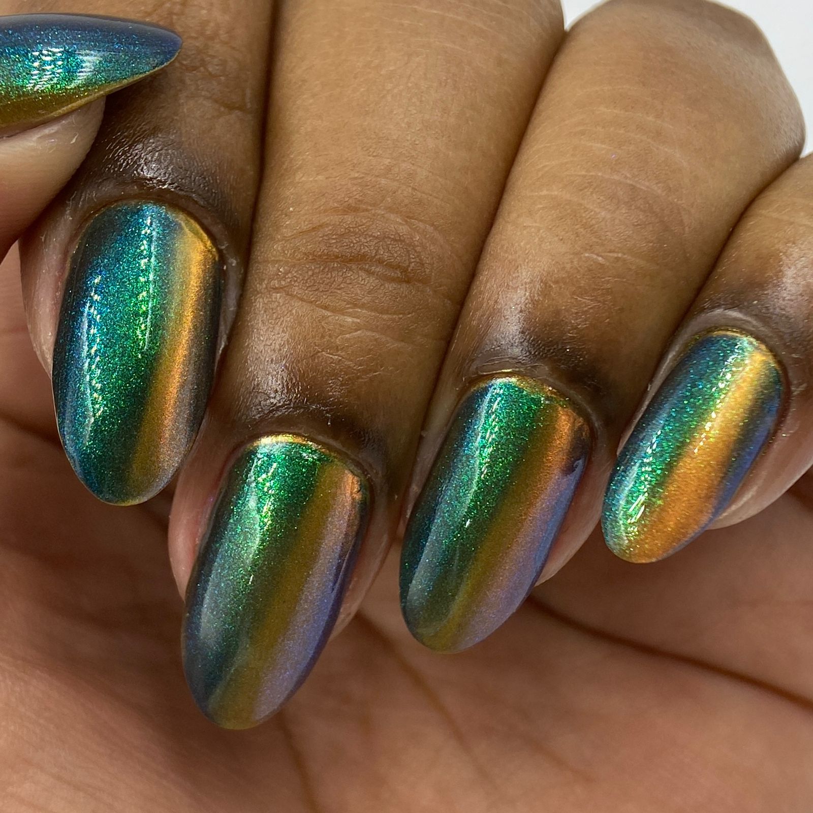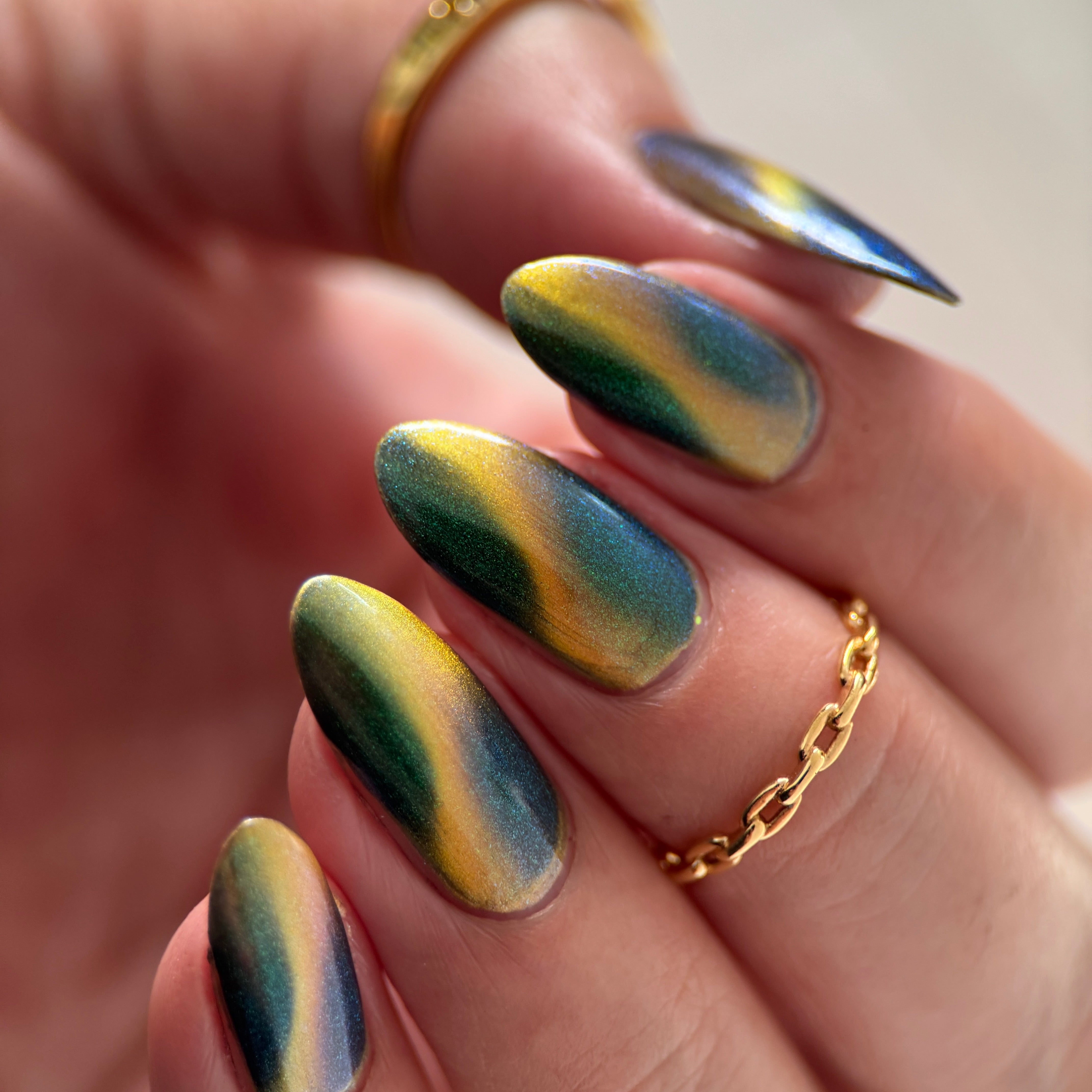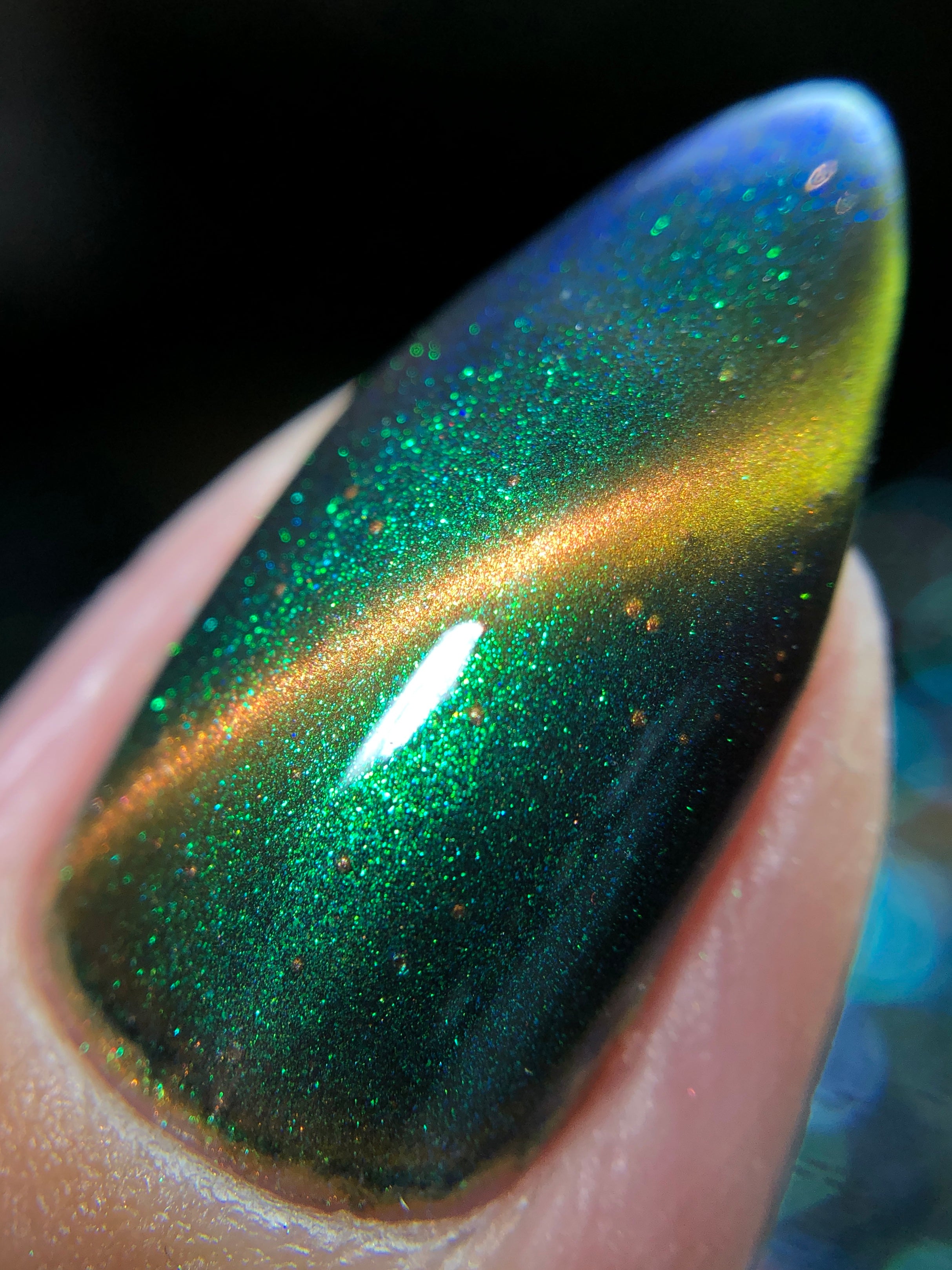 'Secret Arsenal' is a gold/orange magnetic nail polish with green to purple to turquoise aurora shimmer. Inspired by Man-At-Arms.