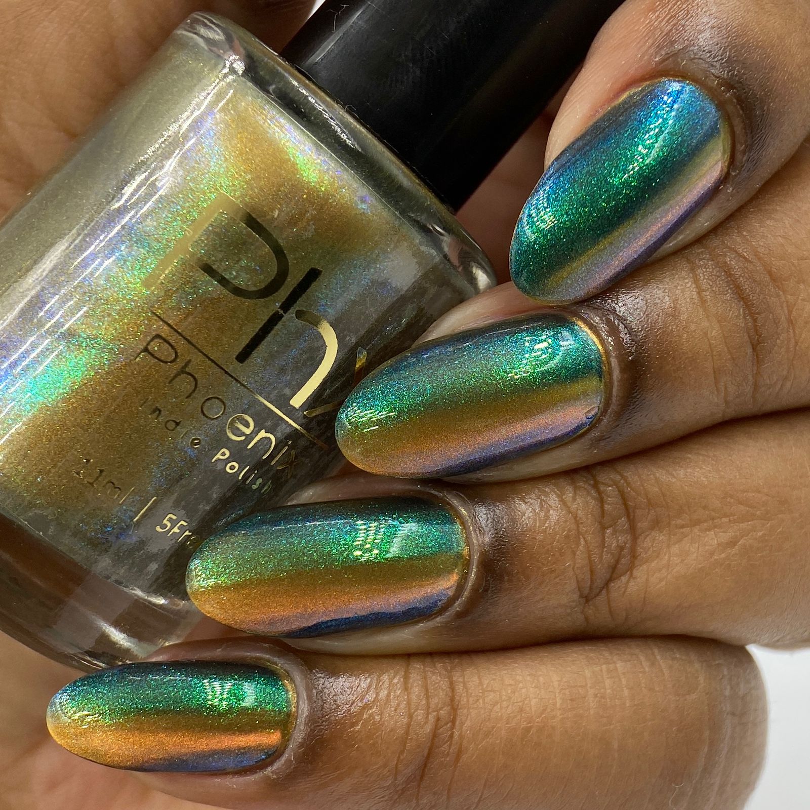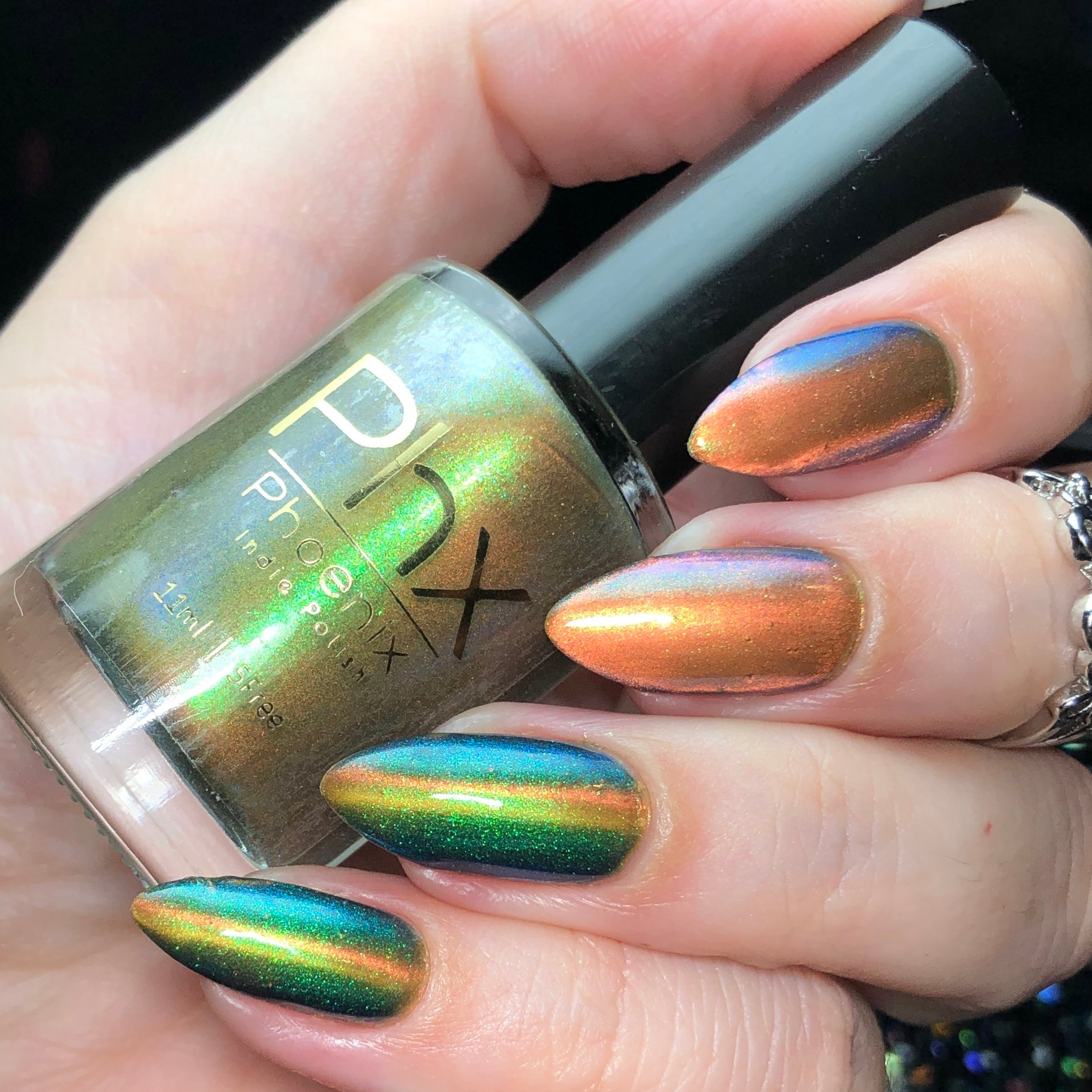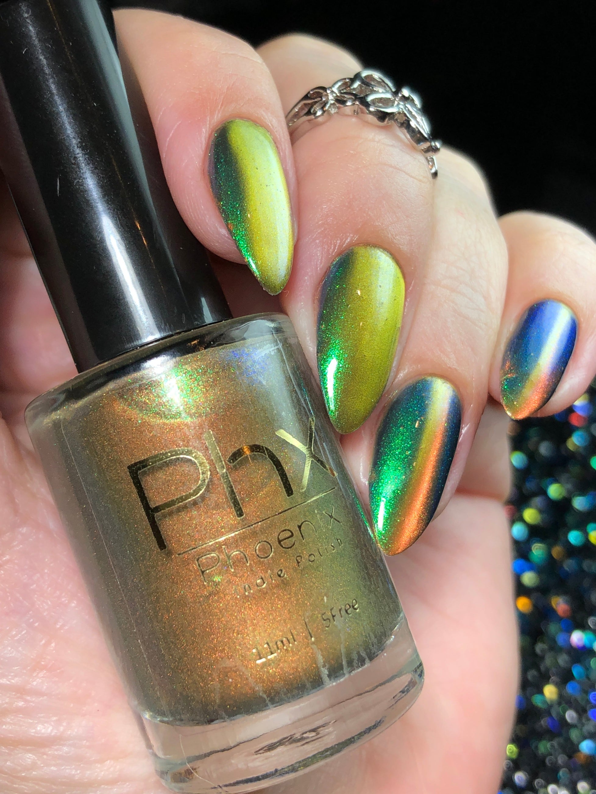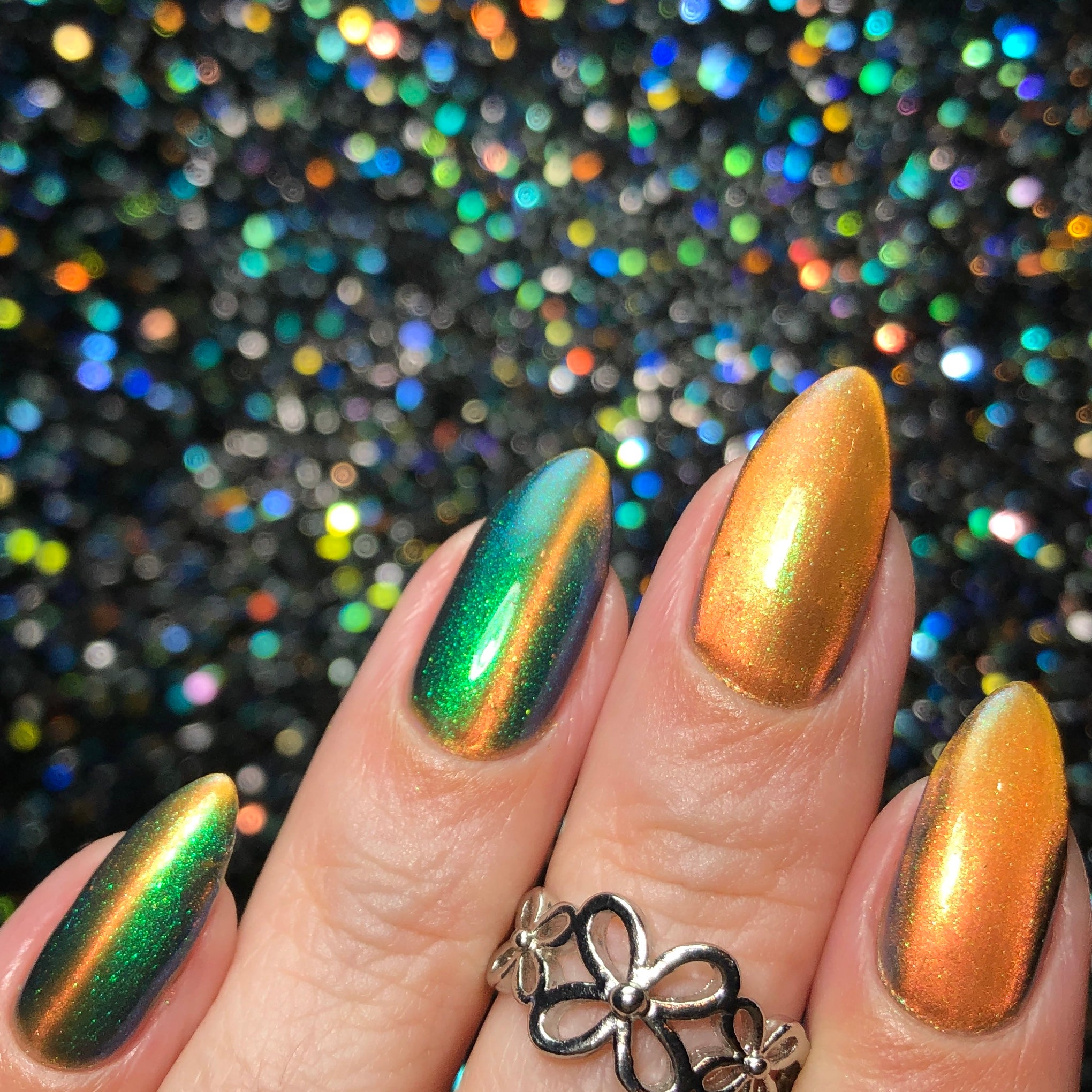 'Secret Arsenal' is a gold/orange magnetic nail polish with green to purple to turquoise aurora shimmer. Inspired by Man-At-Arms.
