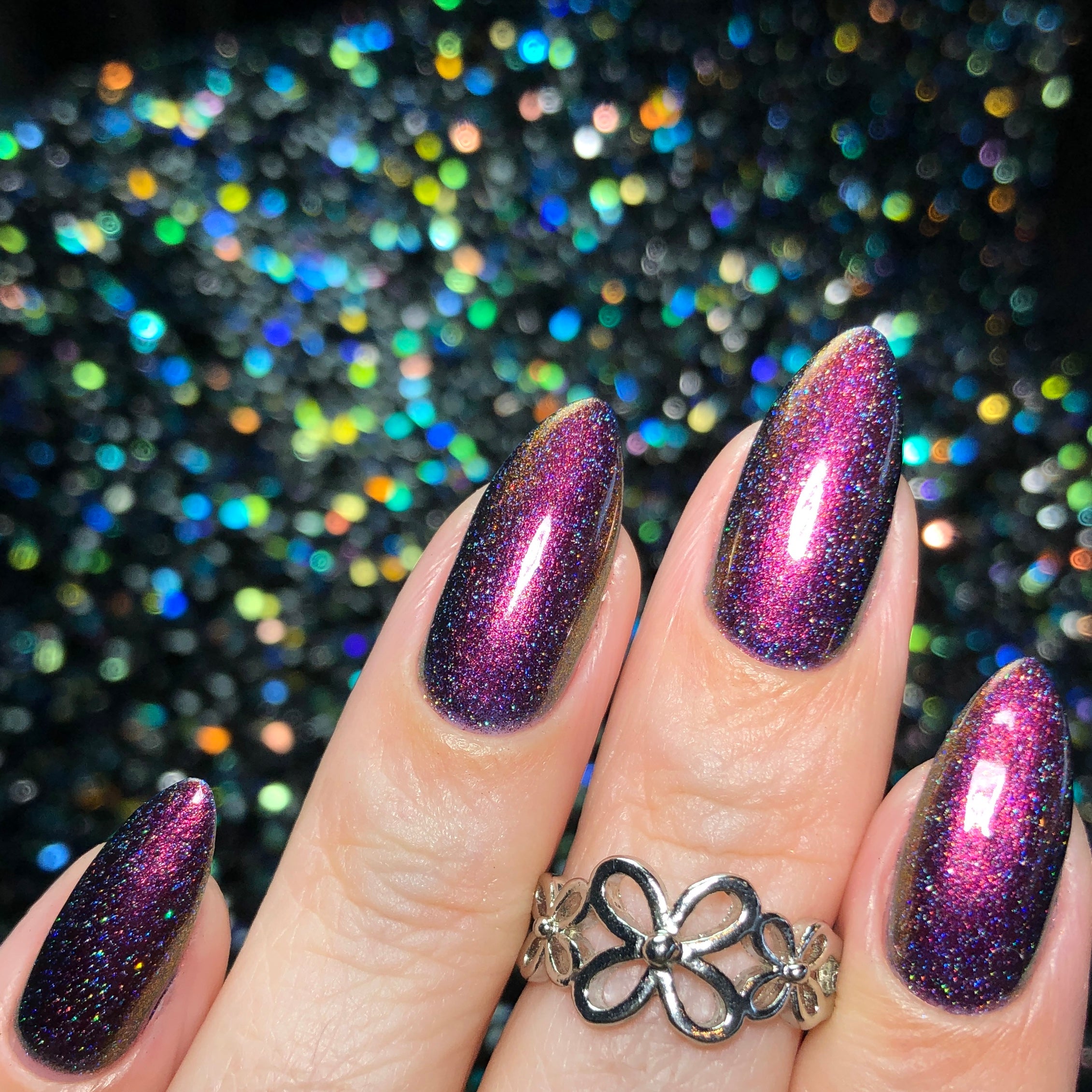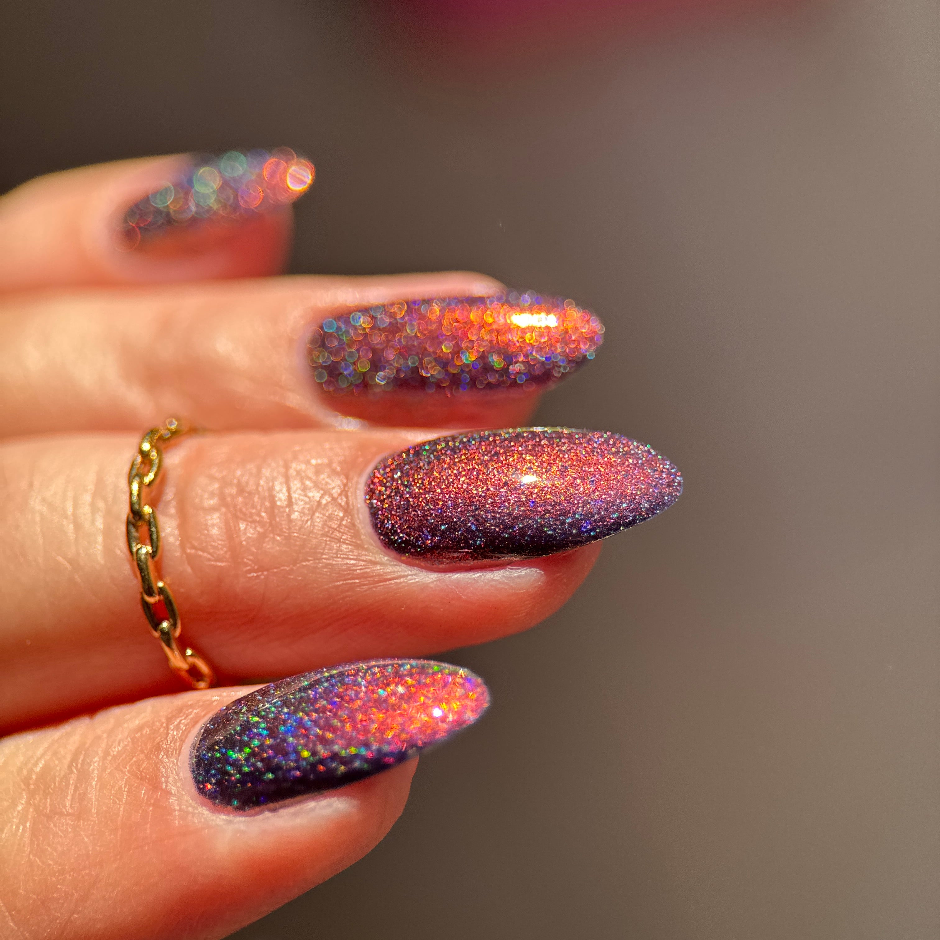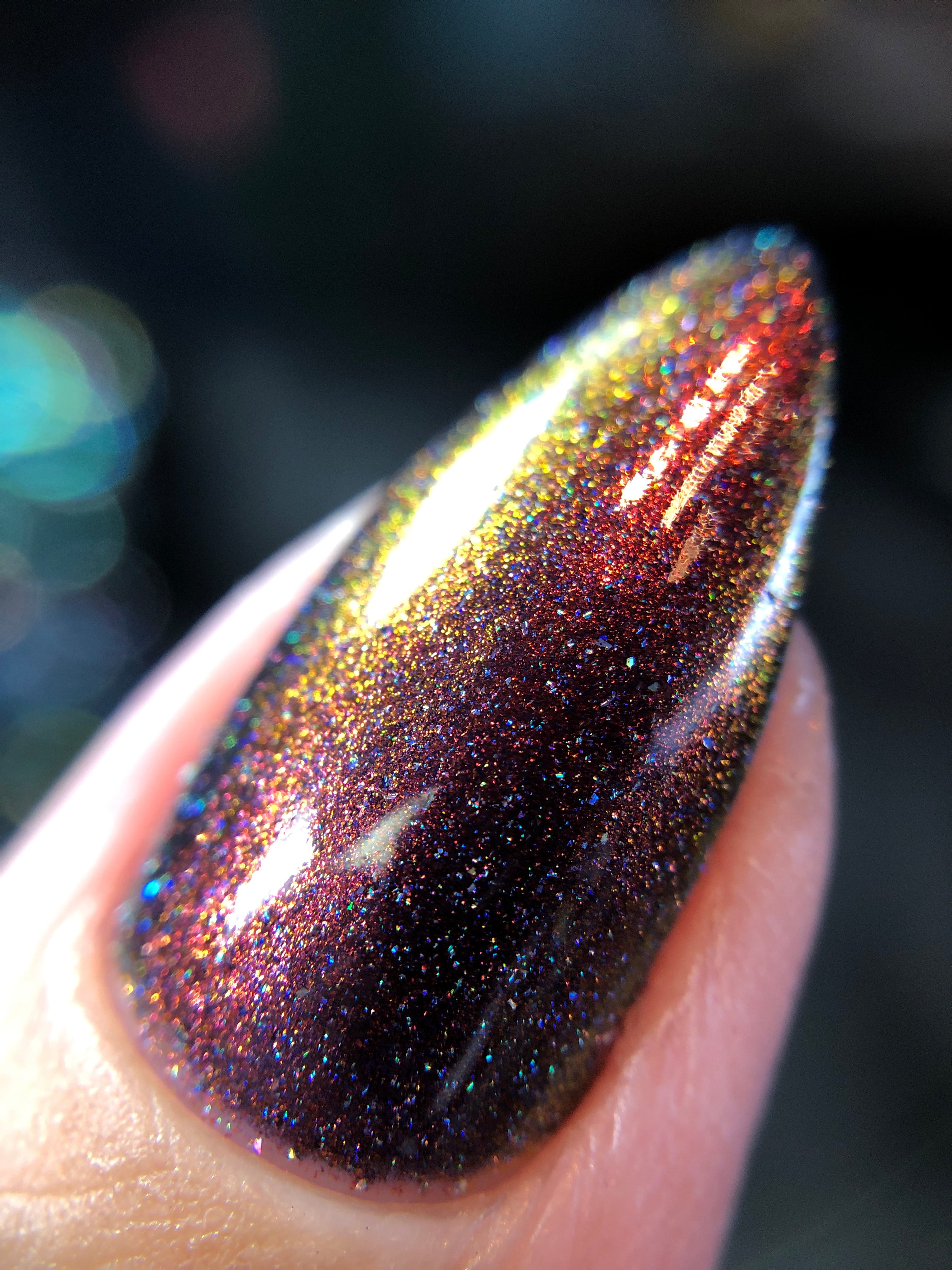 'Veil Keeper' is a blue jelly nail polish with red multichrome pigment and holographic micro flakies. Inspired by Sorceress.