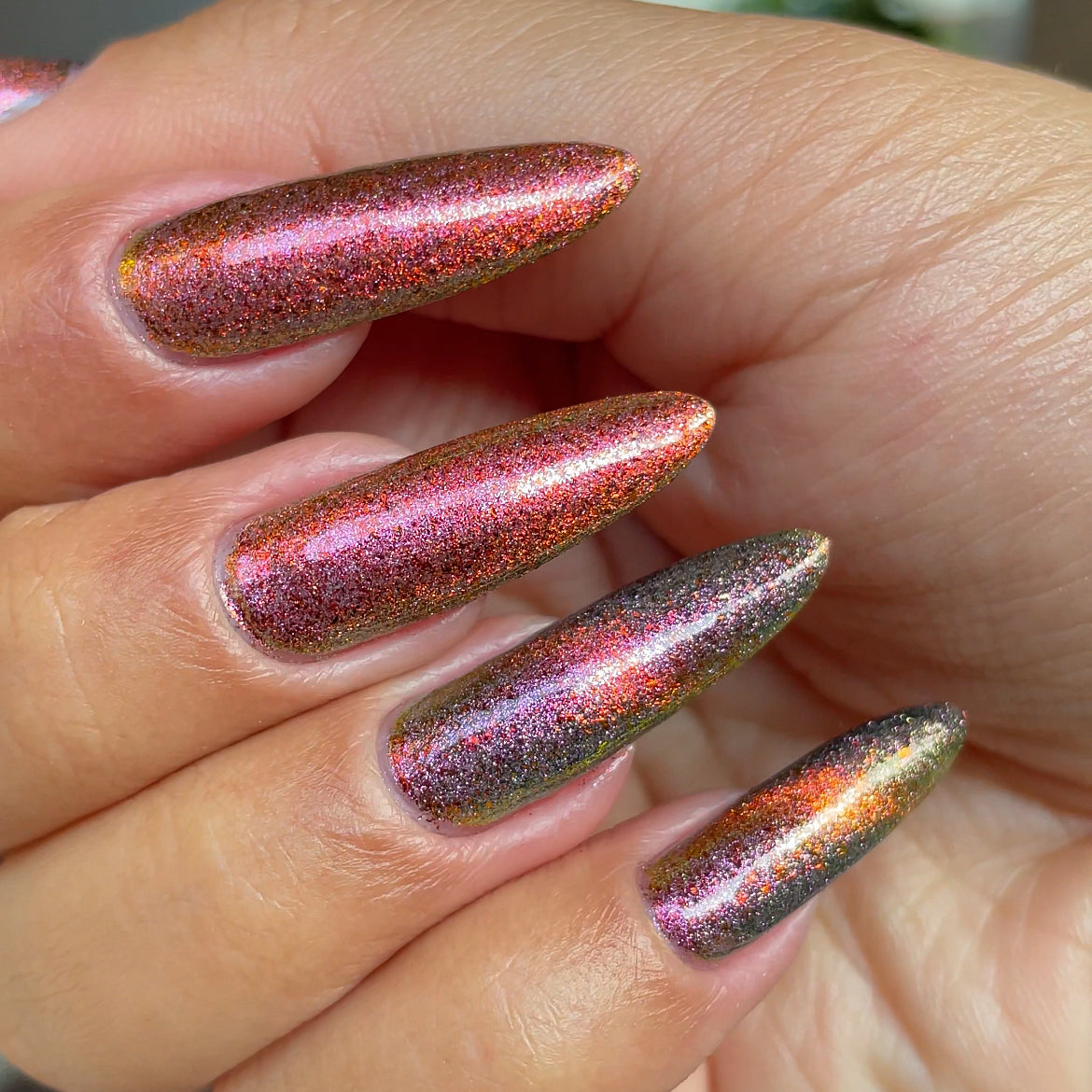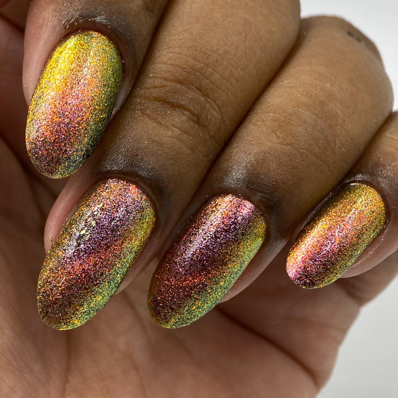 'Endurance' contains orange/gold/green magnetic flakes with pink/green aurora shimmer.