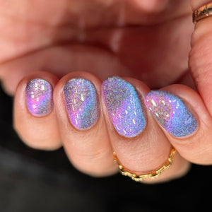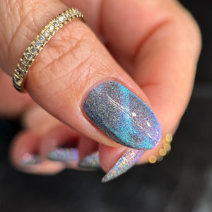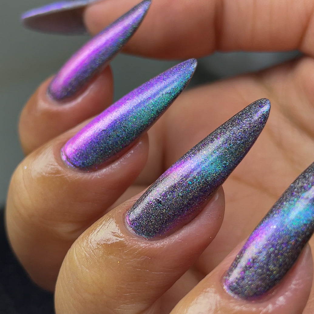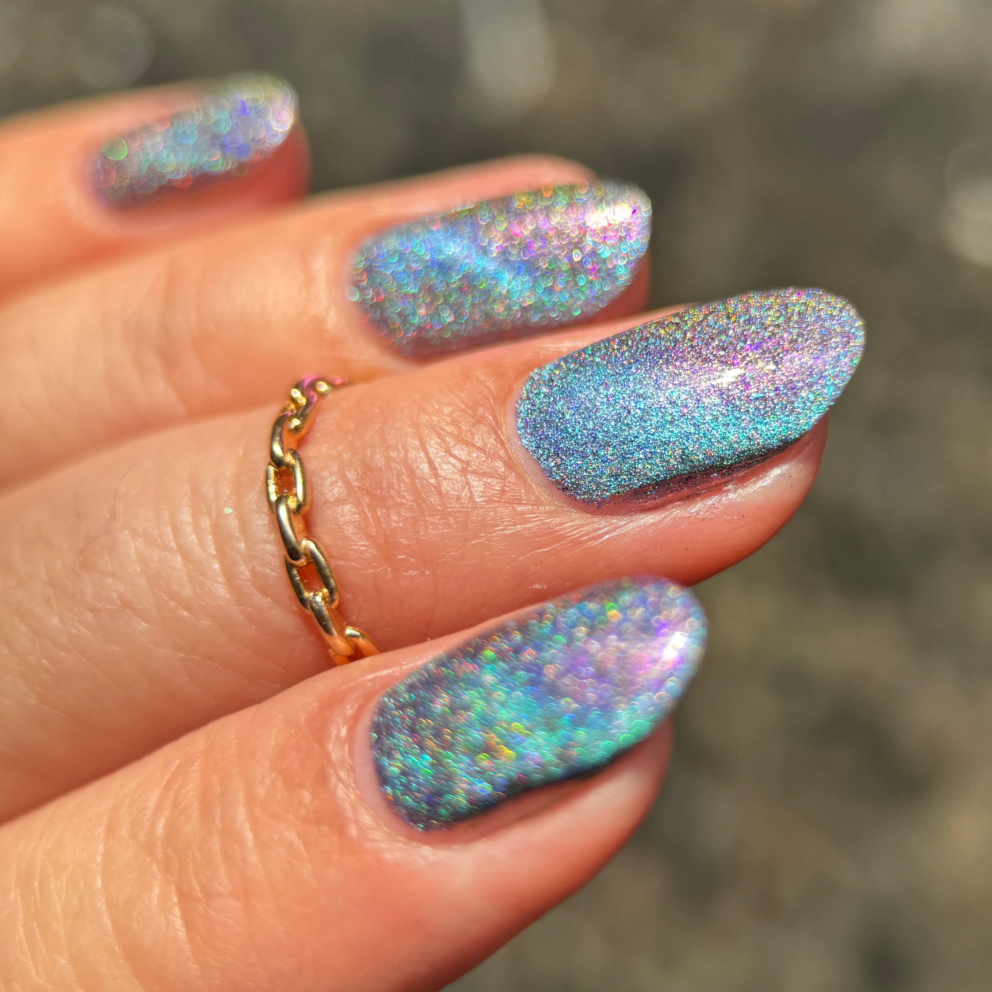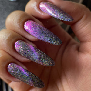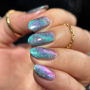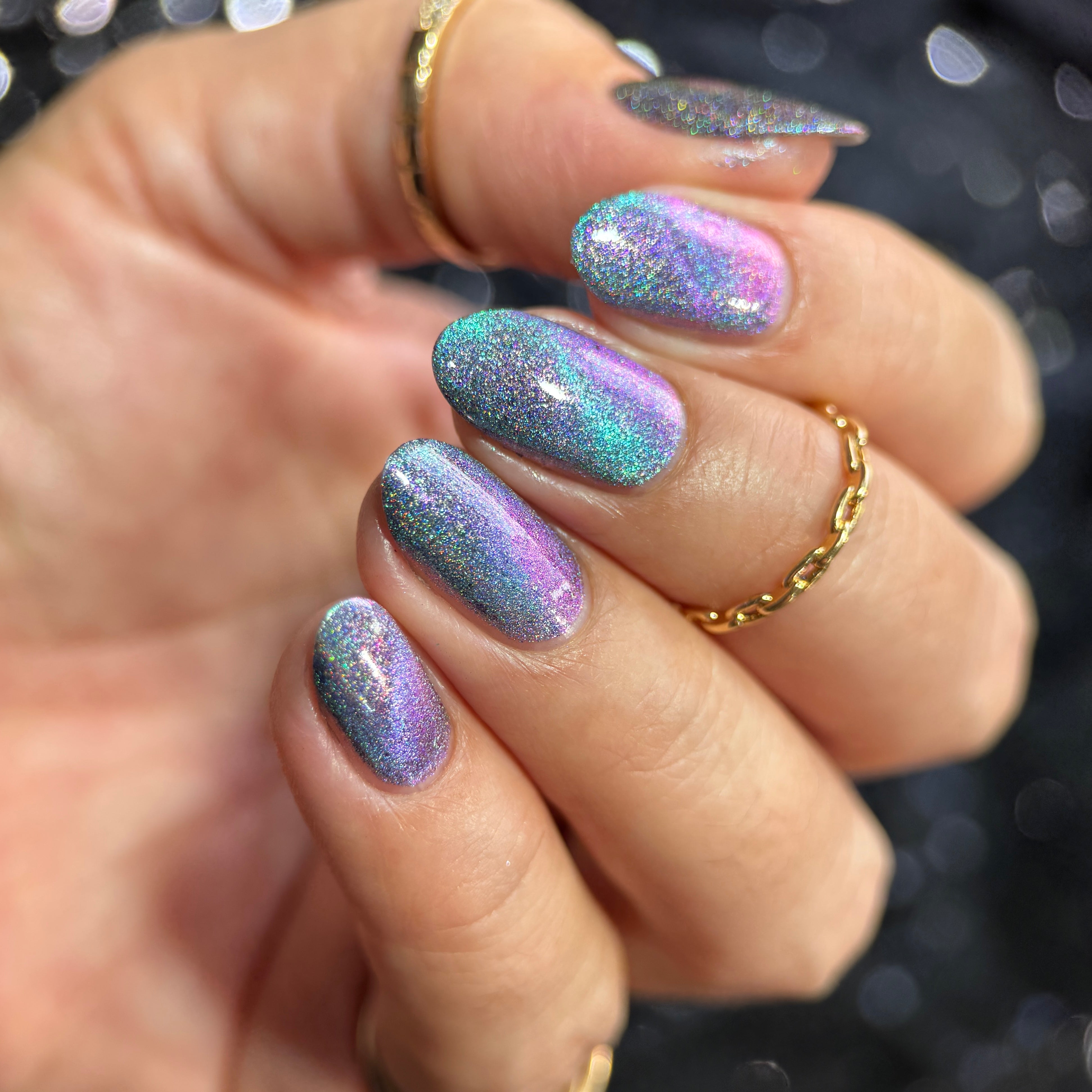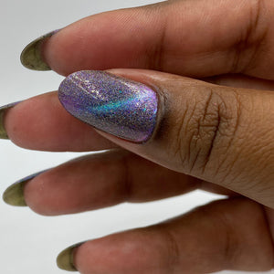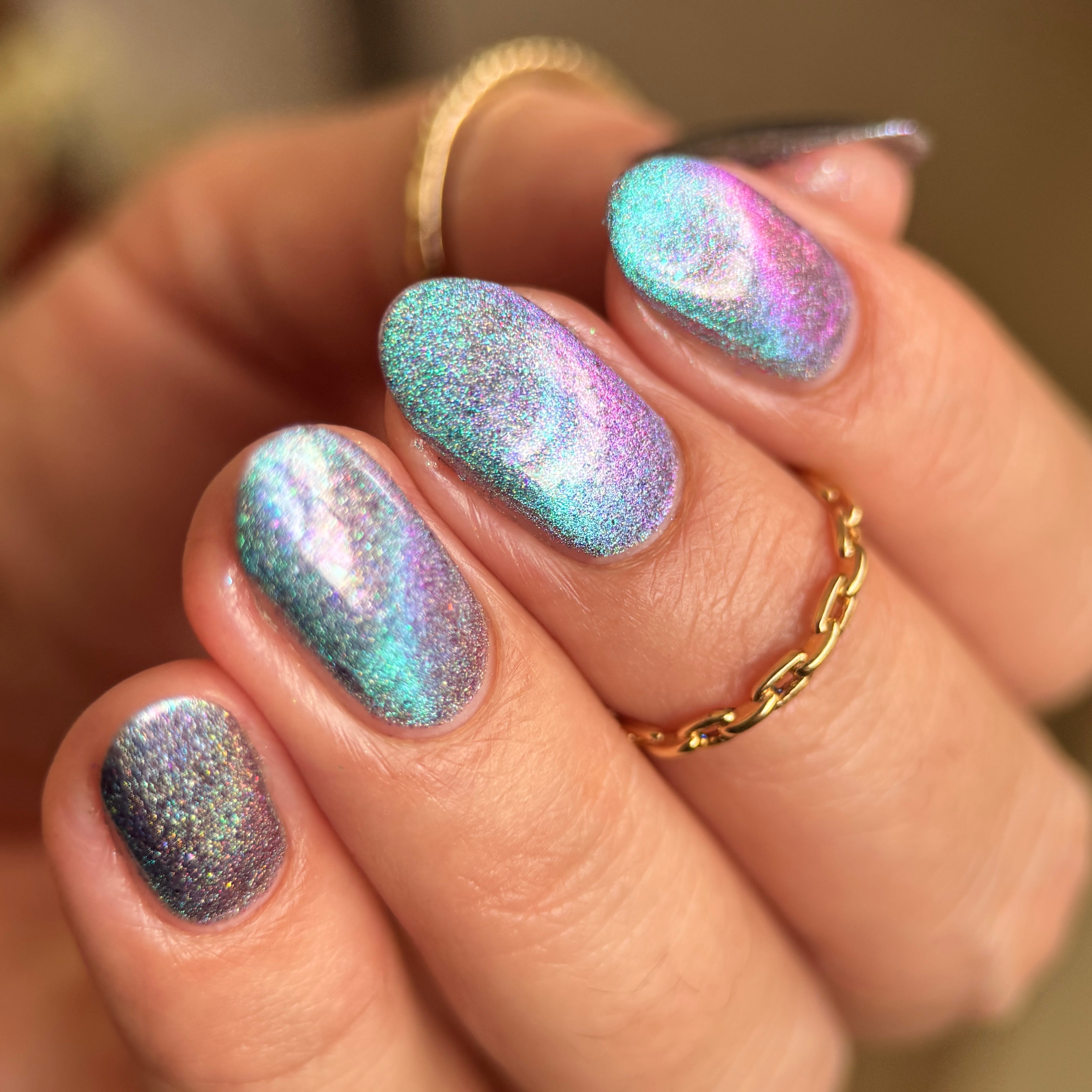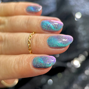 'Stay' is a pink/turquoise magnetic nail polish with holographic pigment.