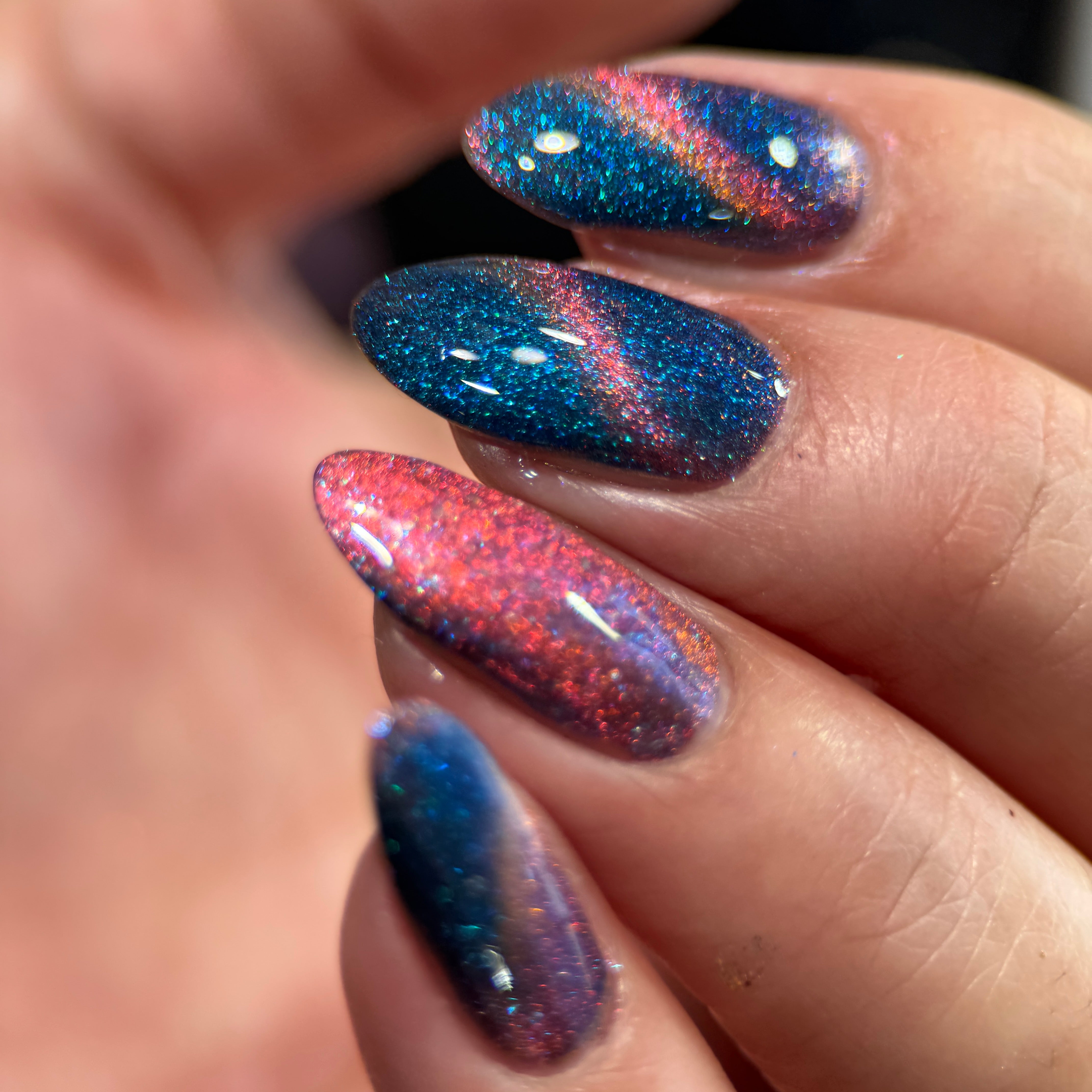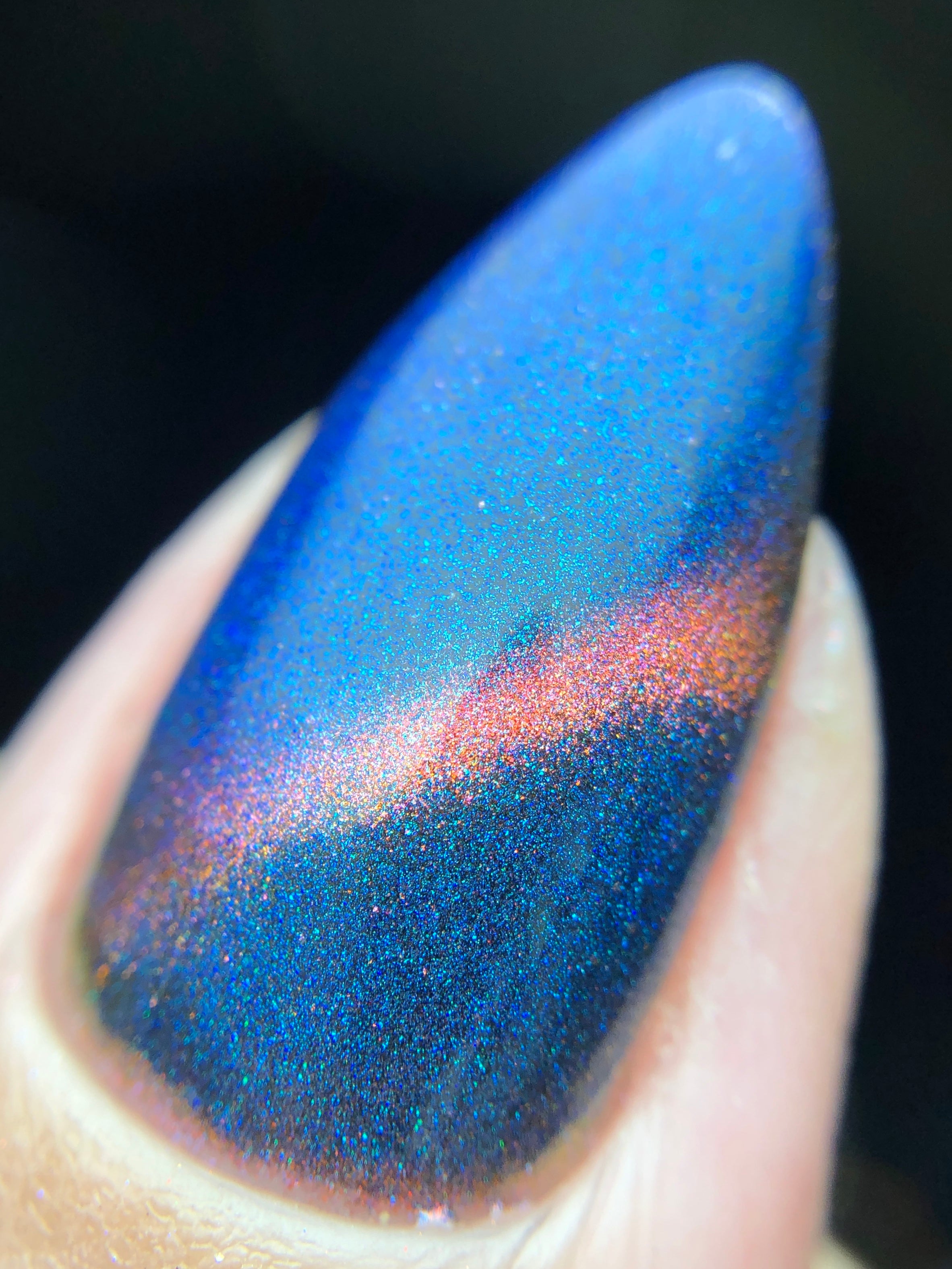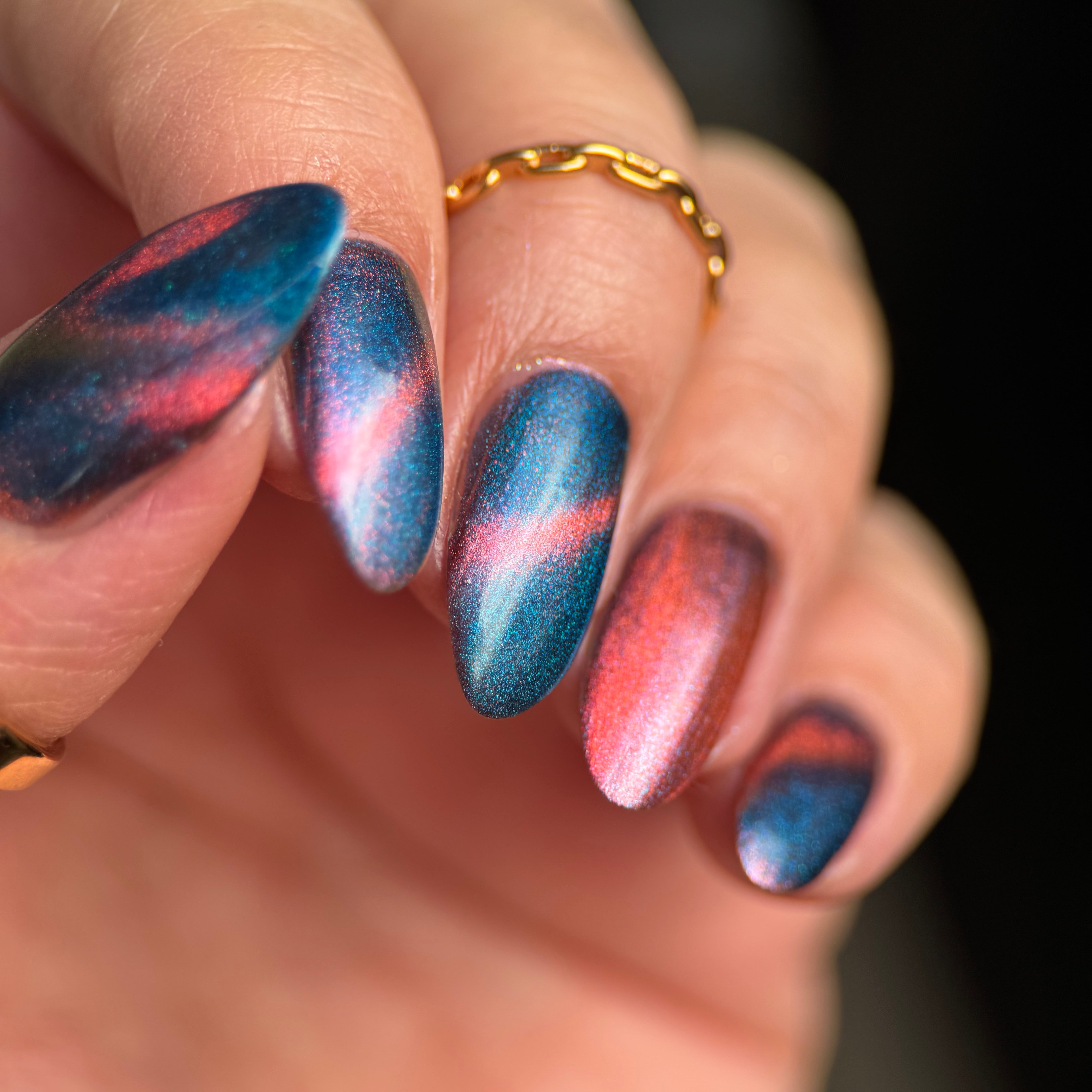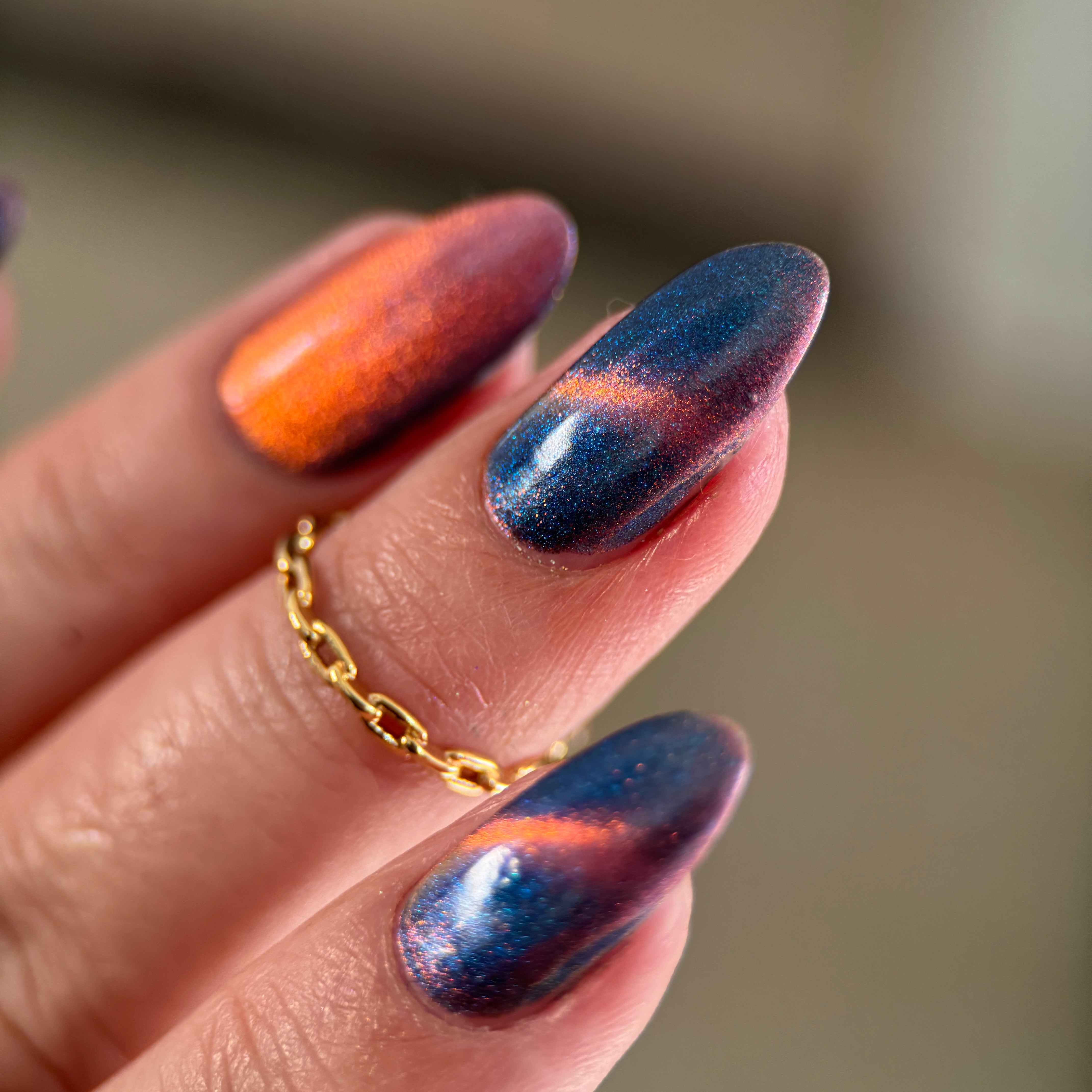 'Primal Instinct' is a red/orange magnetic nail polish with blue aurora shimmer. Inspired by Beast Man.
