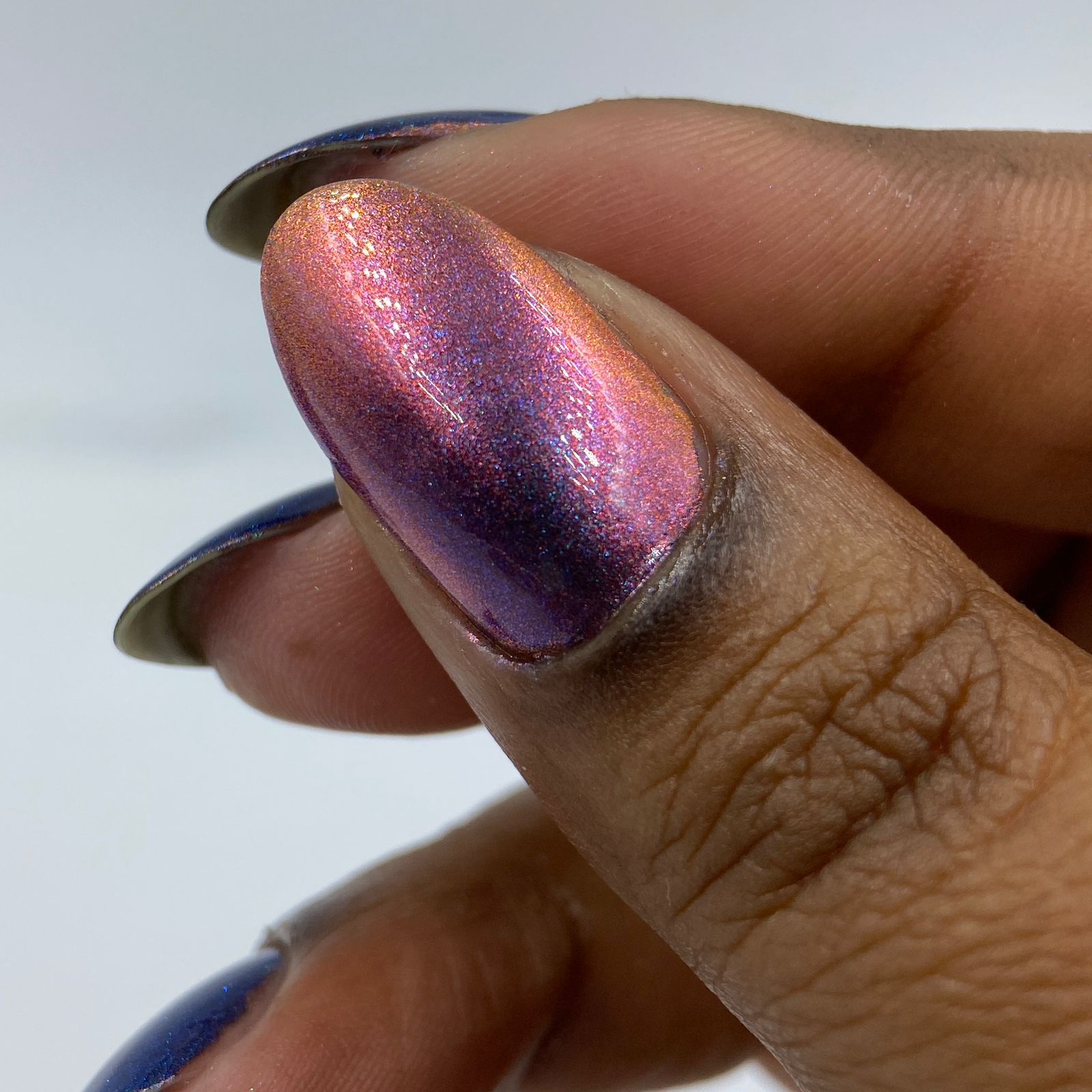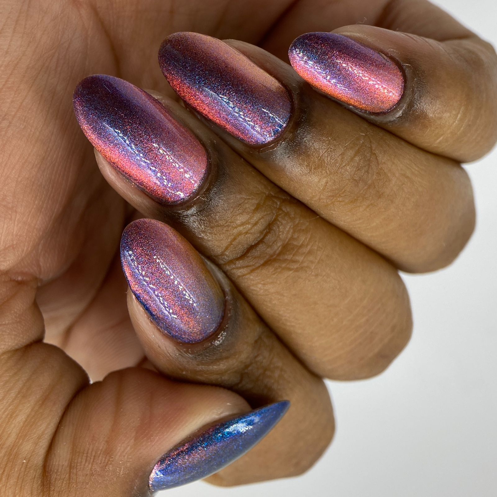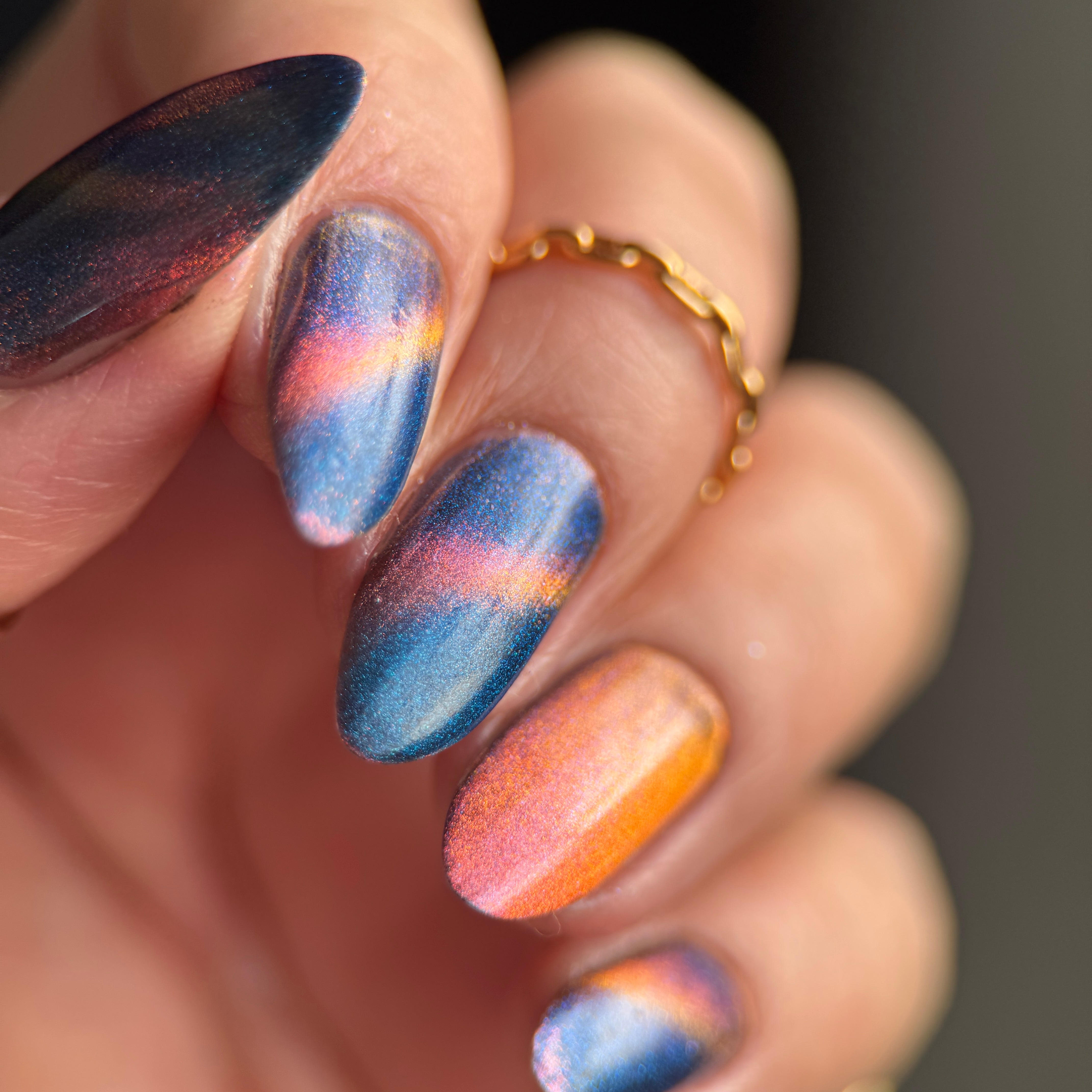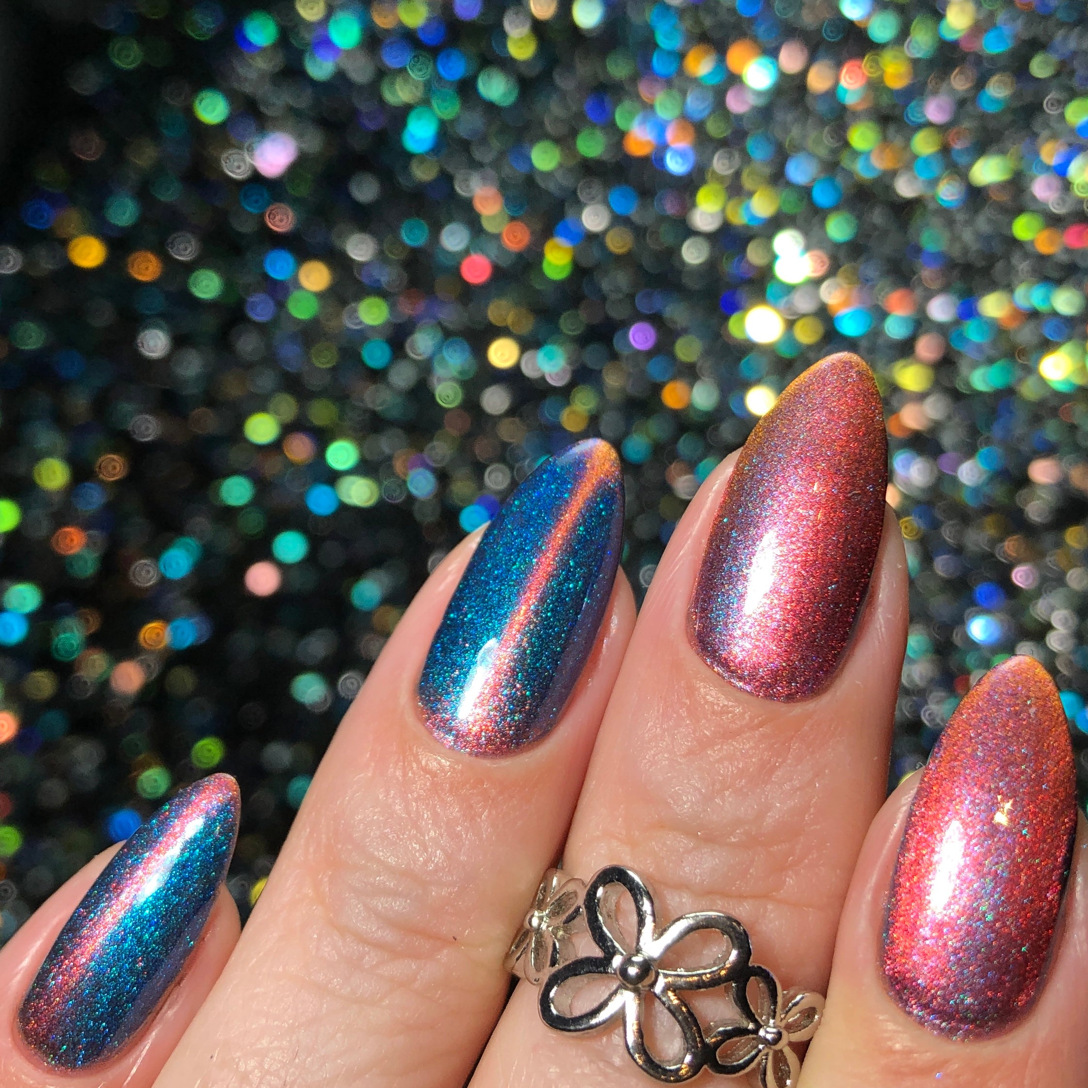 'Primal Instinct' is a red/orange magnetic nail polish with blue aurora shimmer. Inspired by Beast Man.