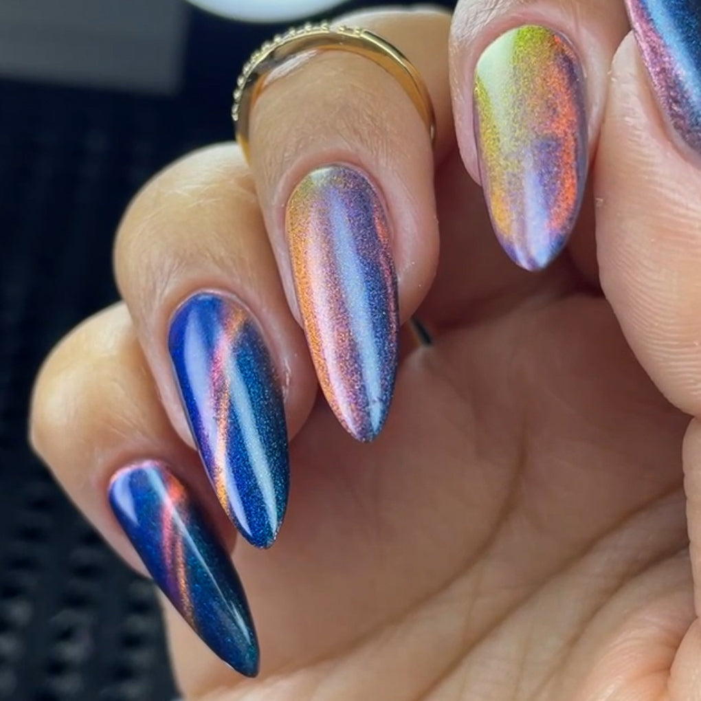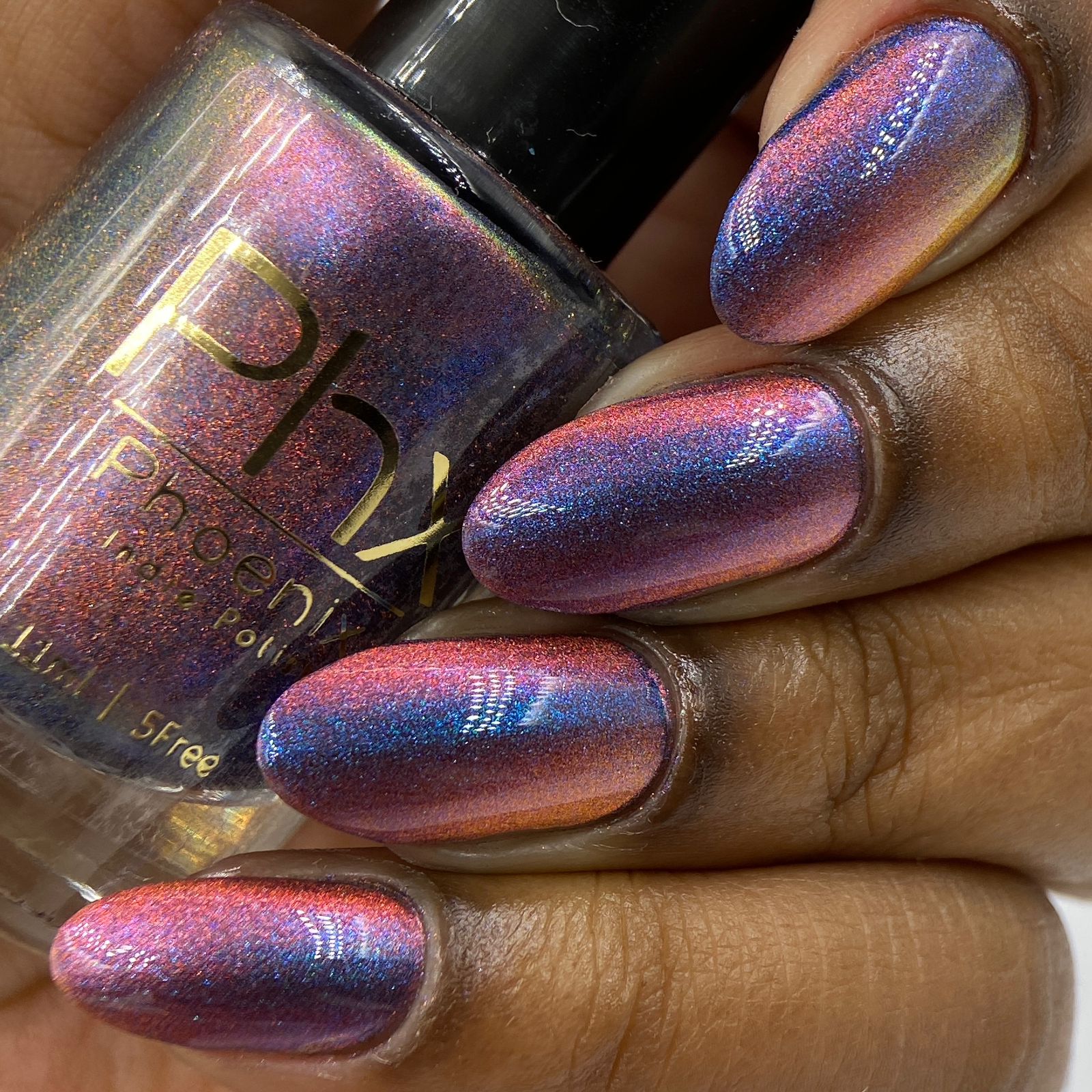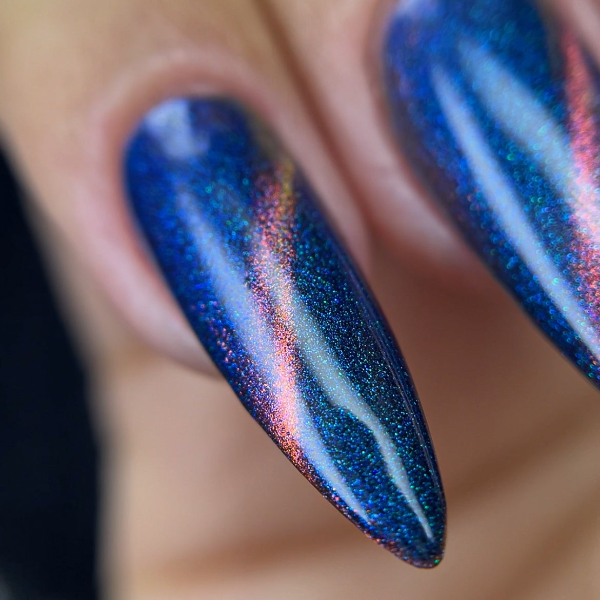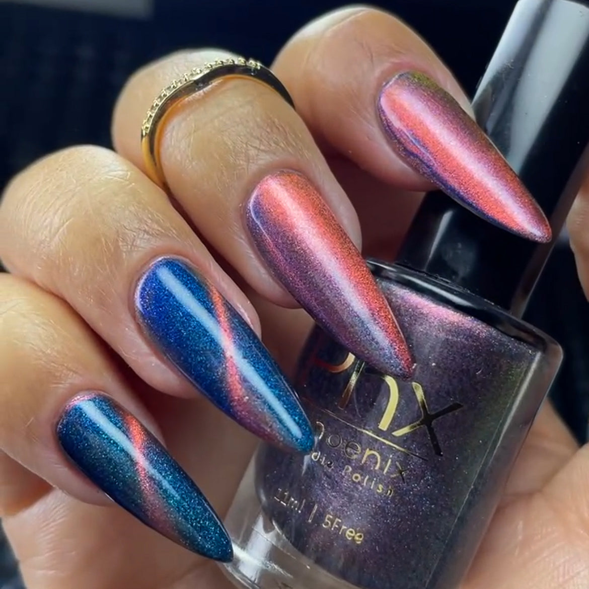 'Primal Instinct' is a red/orange magnetic nail polish with blue aurora shimmer. Inspired by Beast Man.